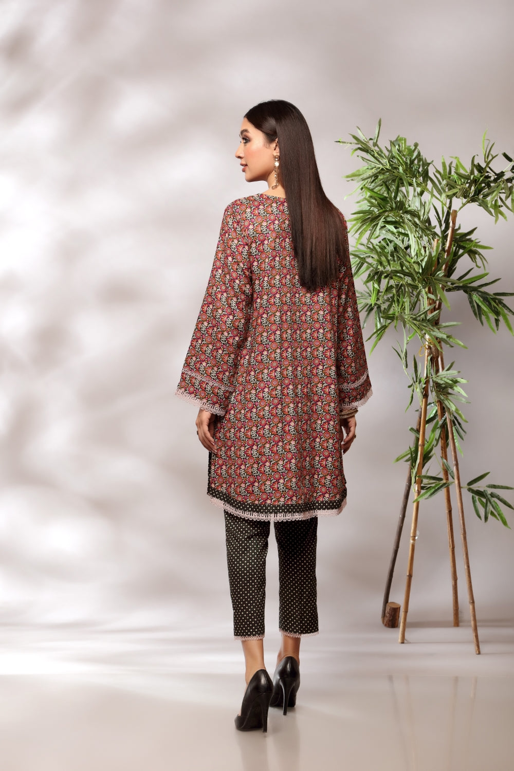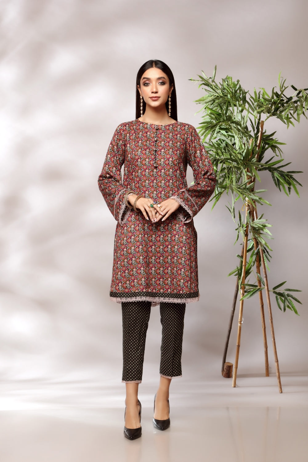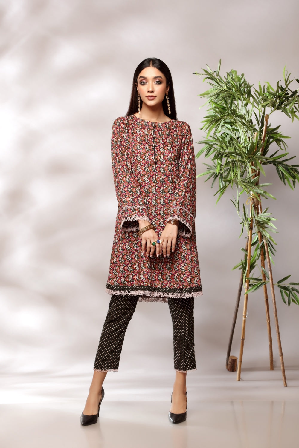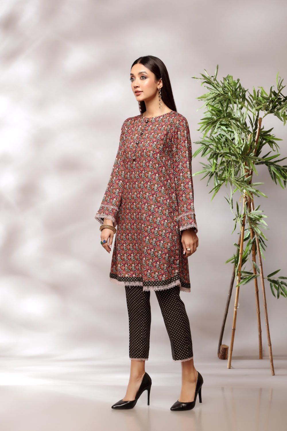 Stitched articles come with trousers tailored to match the unstitched trouser fabric provided. Please note that any appearance of shararas/ghararas in product images is for shoot purposes only unless otherwise specified in product details.