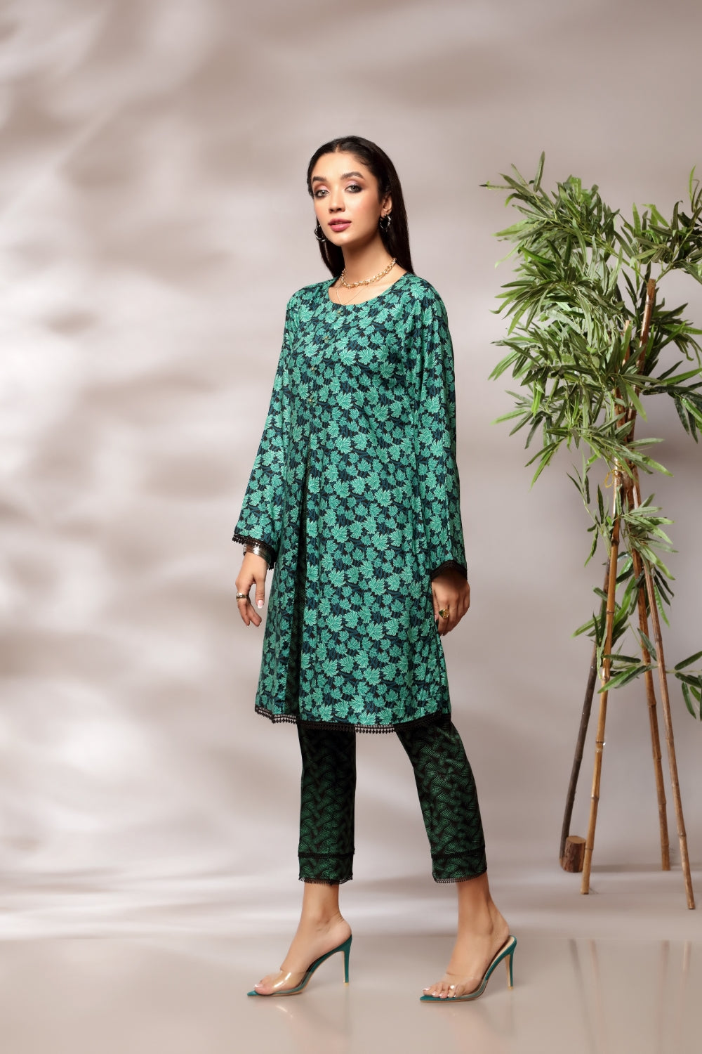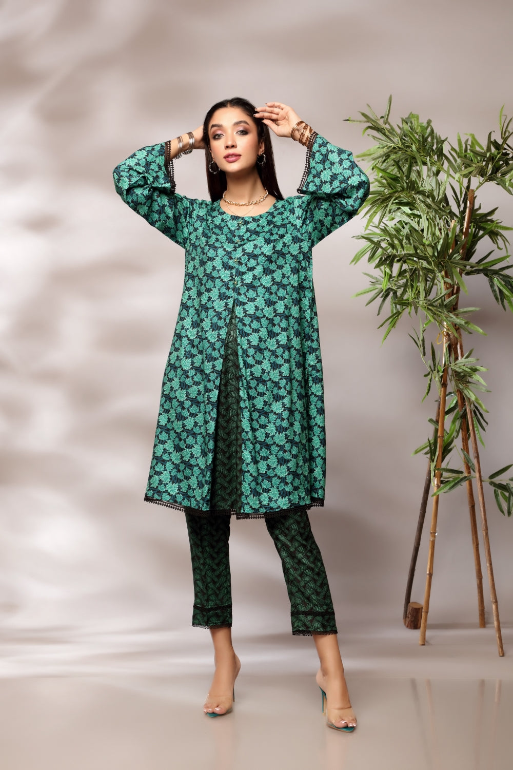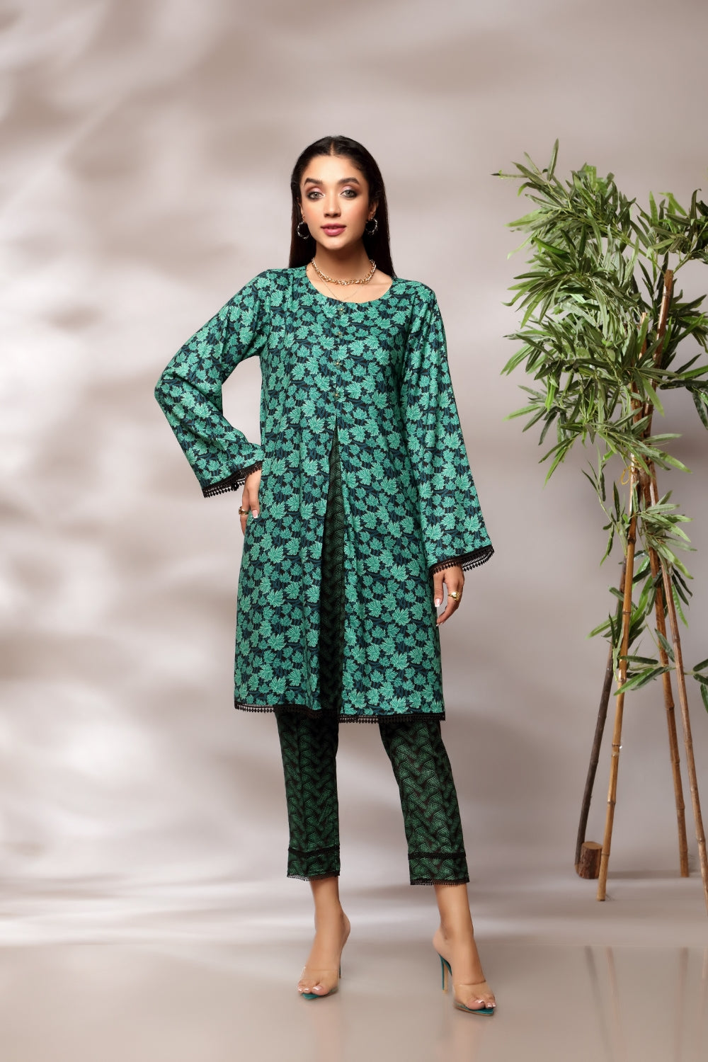 Stitched articles come with trousers tailored to match the unstitched trouser fabric provided. Please note that any appearance of shararas/ghararas in product images is for shoot purposes only unless otherwise specified in product details.