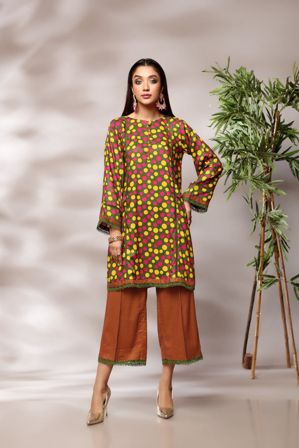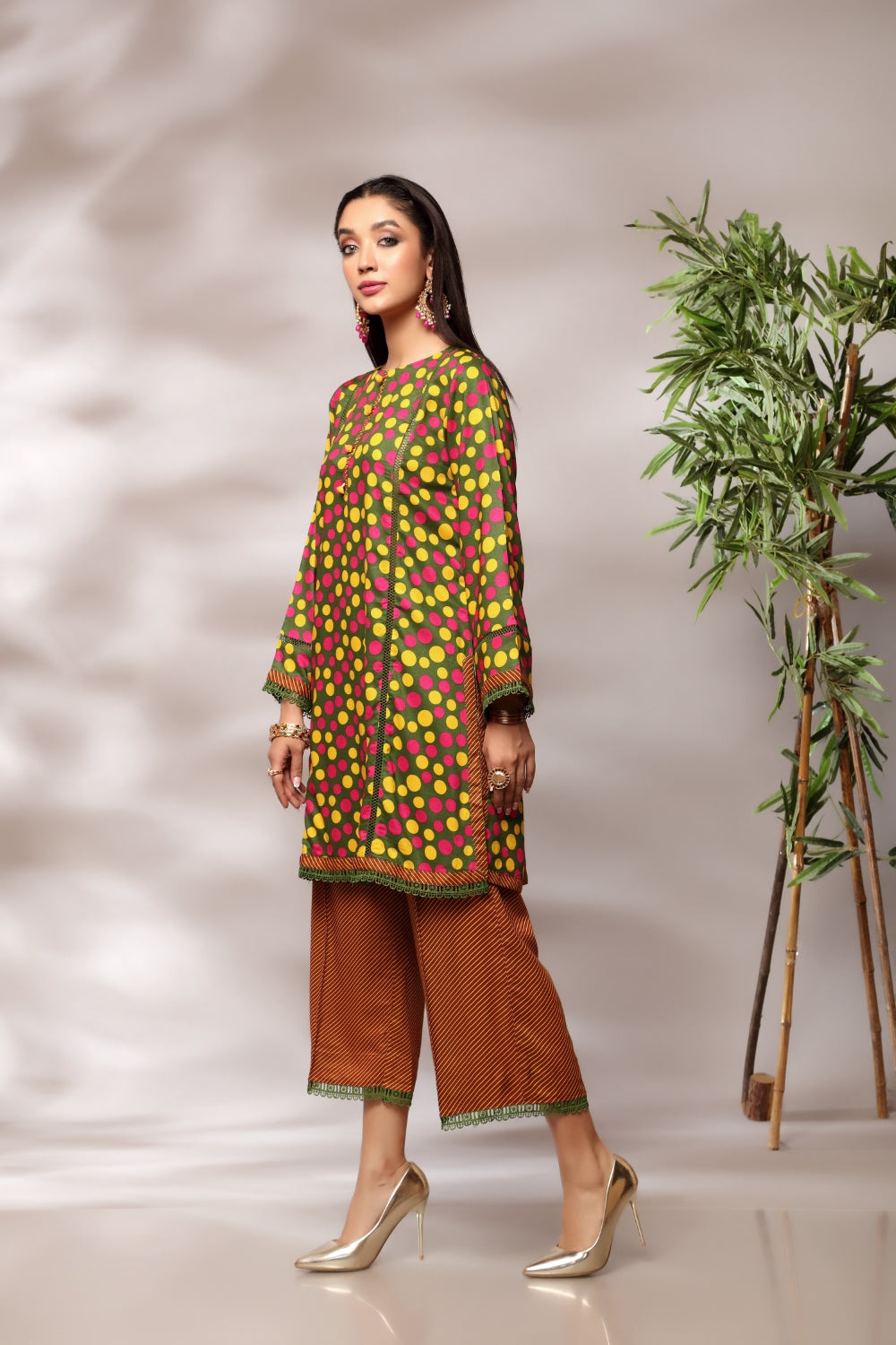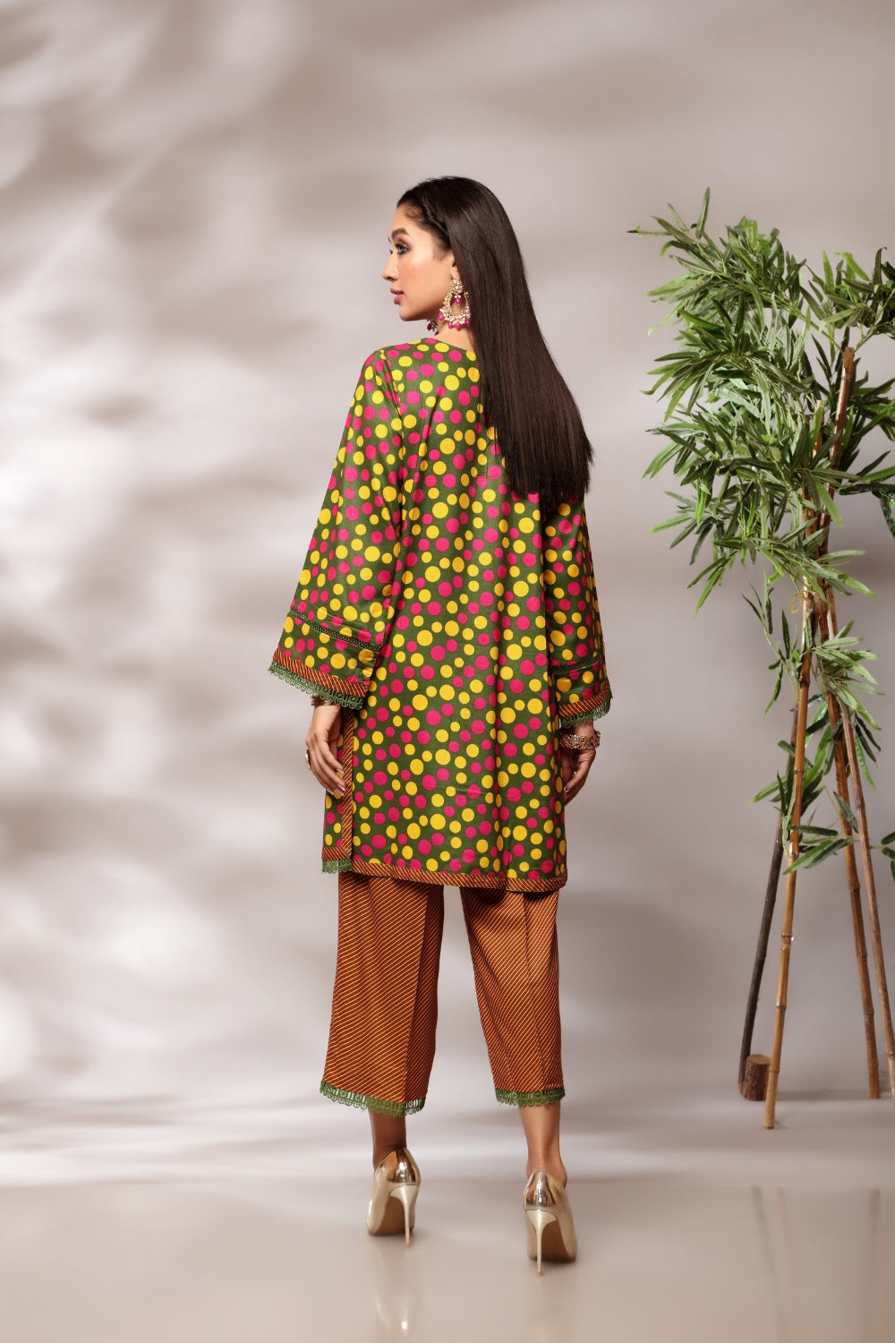 Stitched articles come with trousers tailored to match the unstitched trouser fabric provided. Please note that any appearance of shararas/ghararas in product images is for shoot purposes only unless otherwise specified in product details.