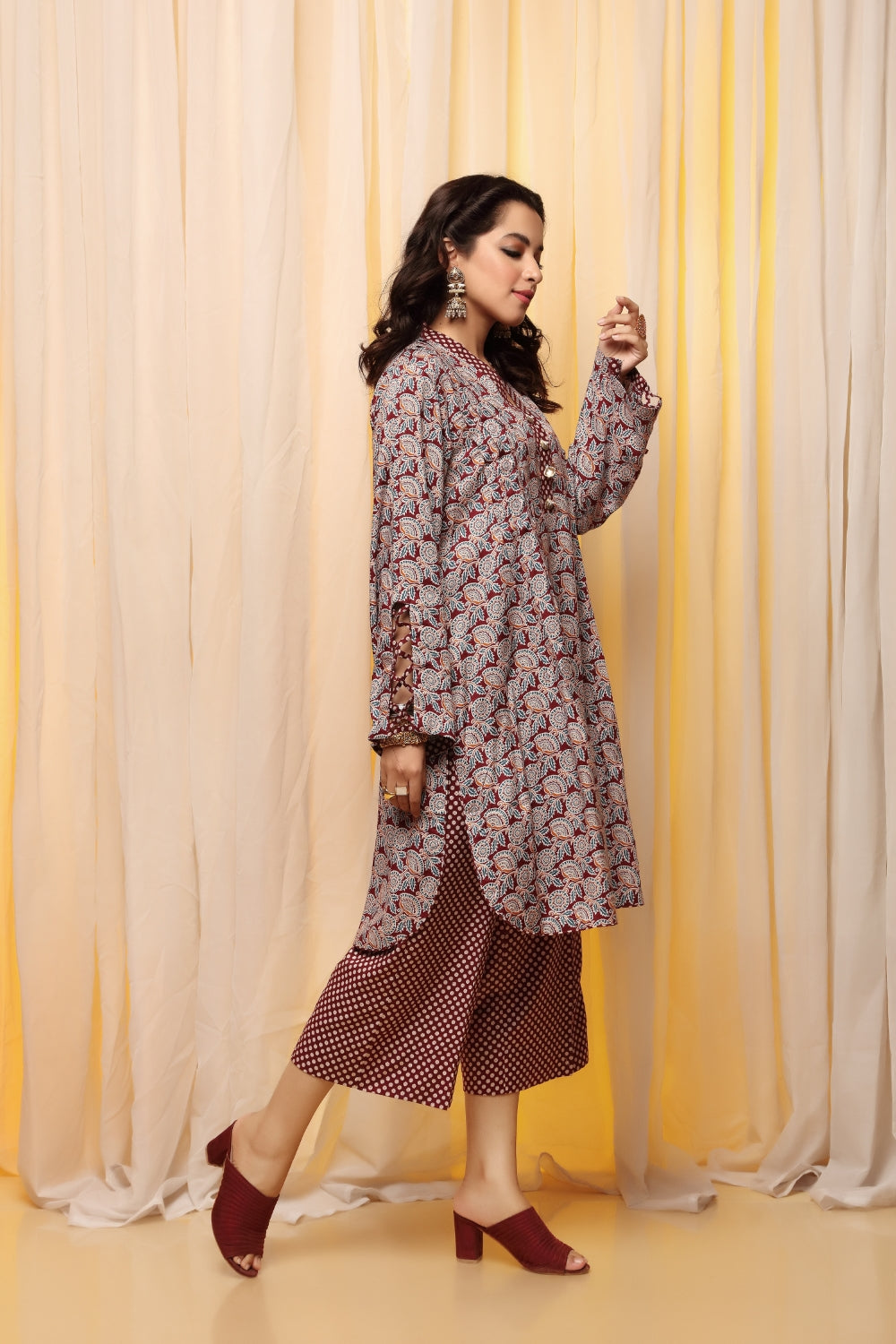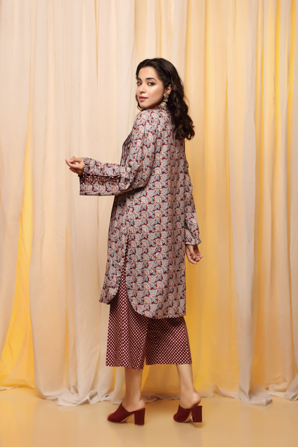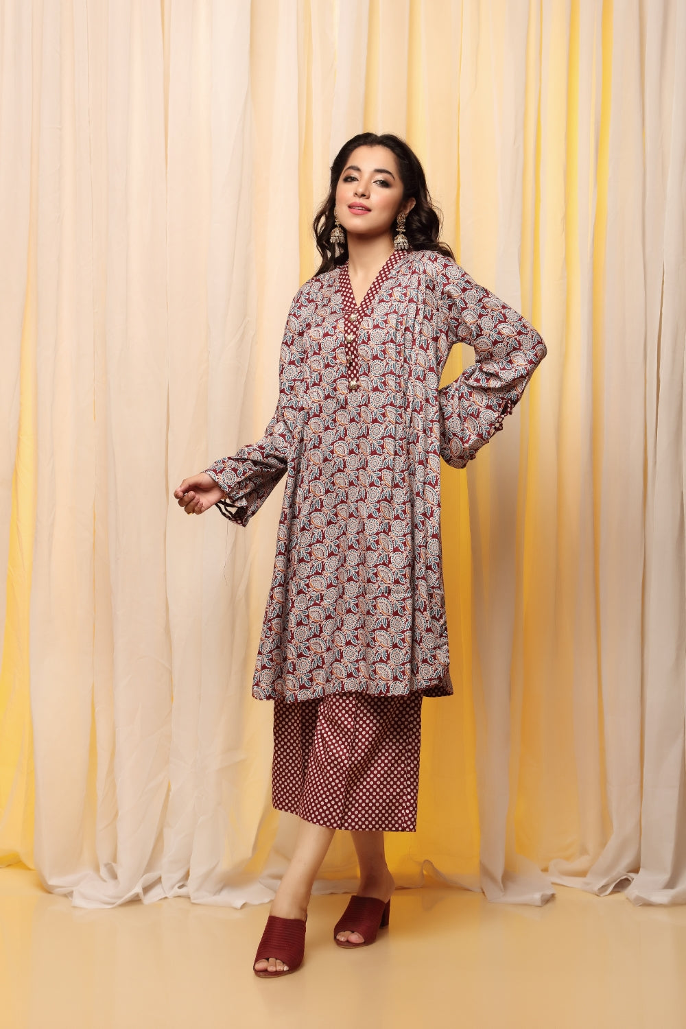 Stitched articles come with trousers tailored to match the unstitched trouser fabric provided. Please note that any appearance of shararas/ghararas in product images is for shoot purposes only unless otherwise specified in product details.