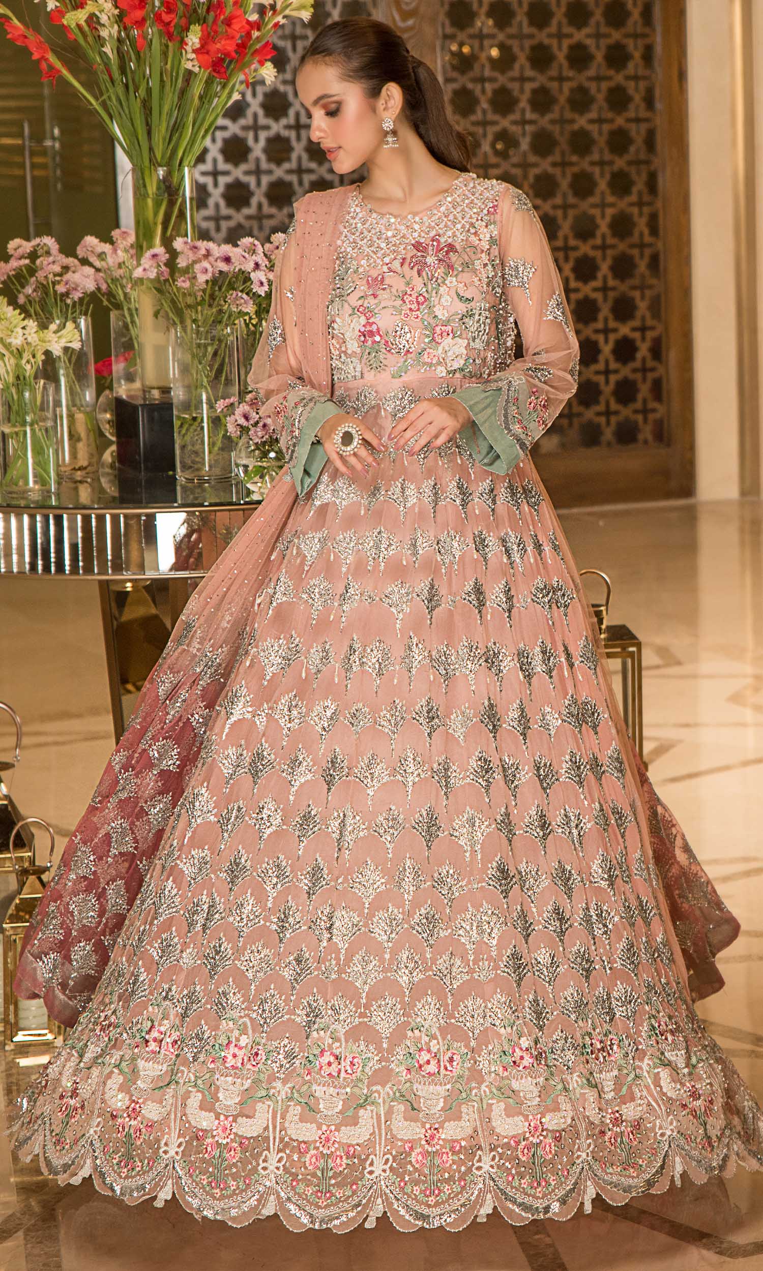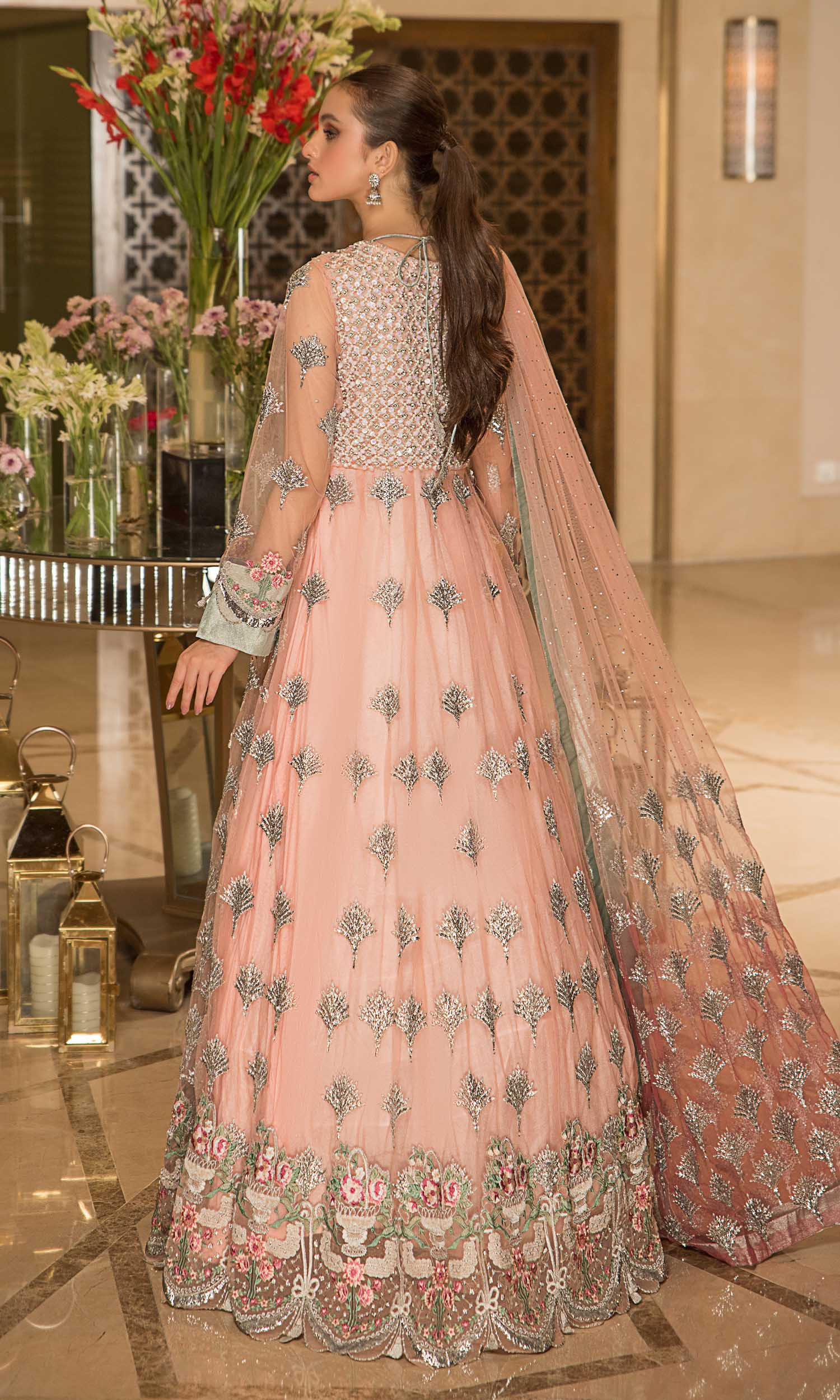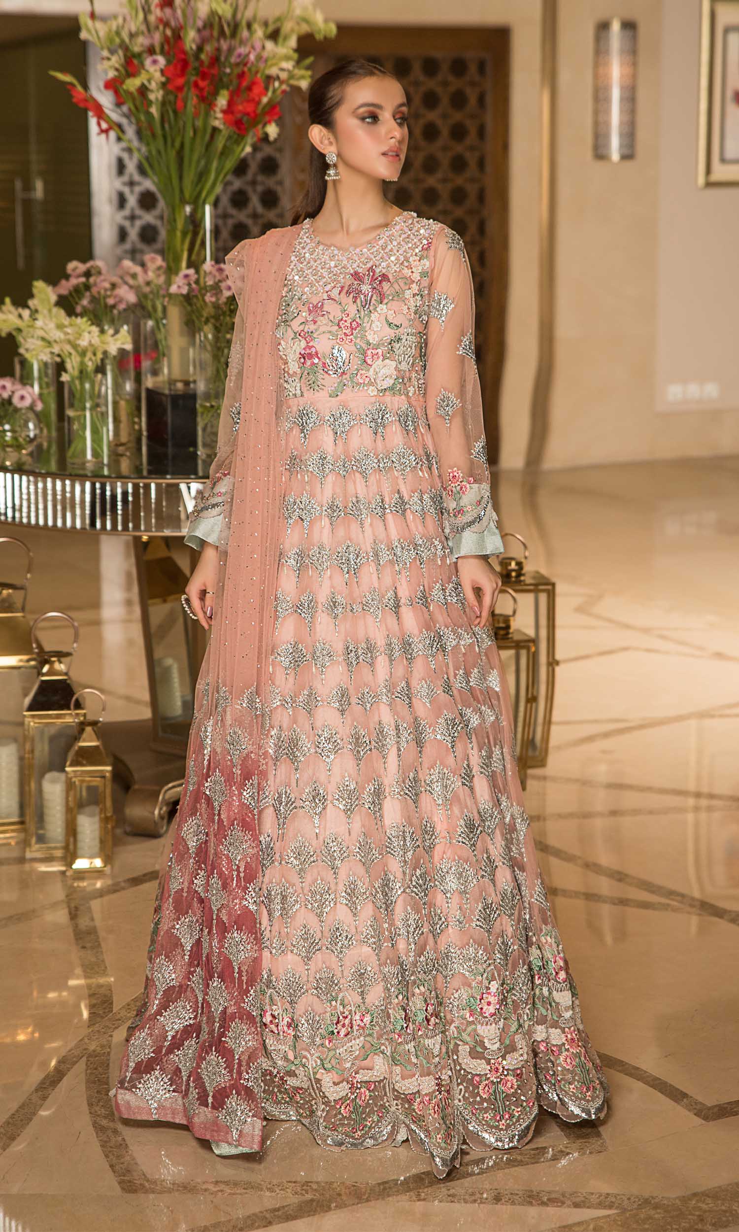 | Bloom Doir show cases an exquisitely designed MAXI with excellent zardozi work in a gorgeous pink shade done this outfit and become the queen of the affair. |