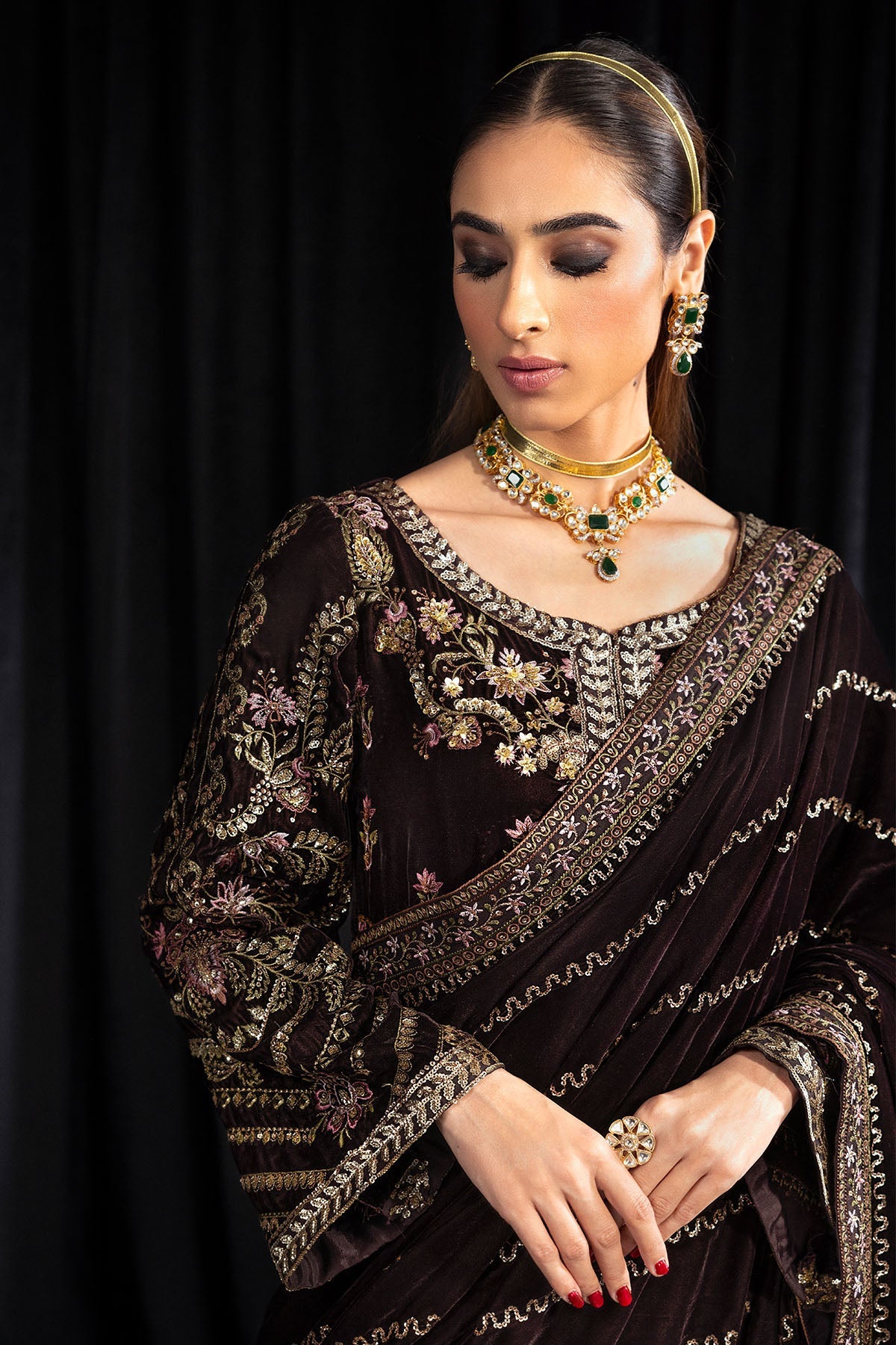 • Embroidered Velvet Front Body With Hand-Embellishment