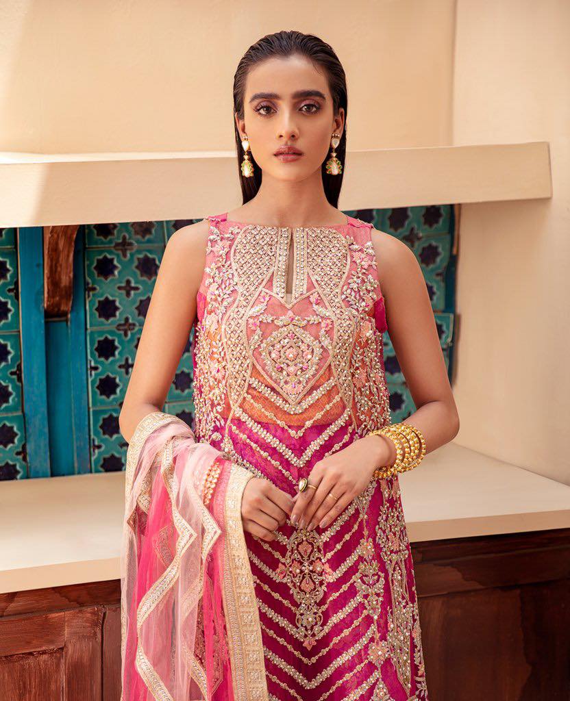 Stitched articles come with trousers tailored to match the unstitched trouser fabric provided. Please note that any appearance of shararas/ghararas in product images is for shoot purposes only unless otherwise specified in product details.
