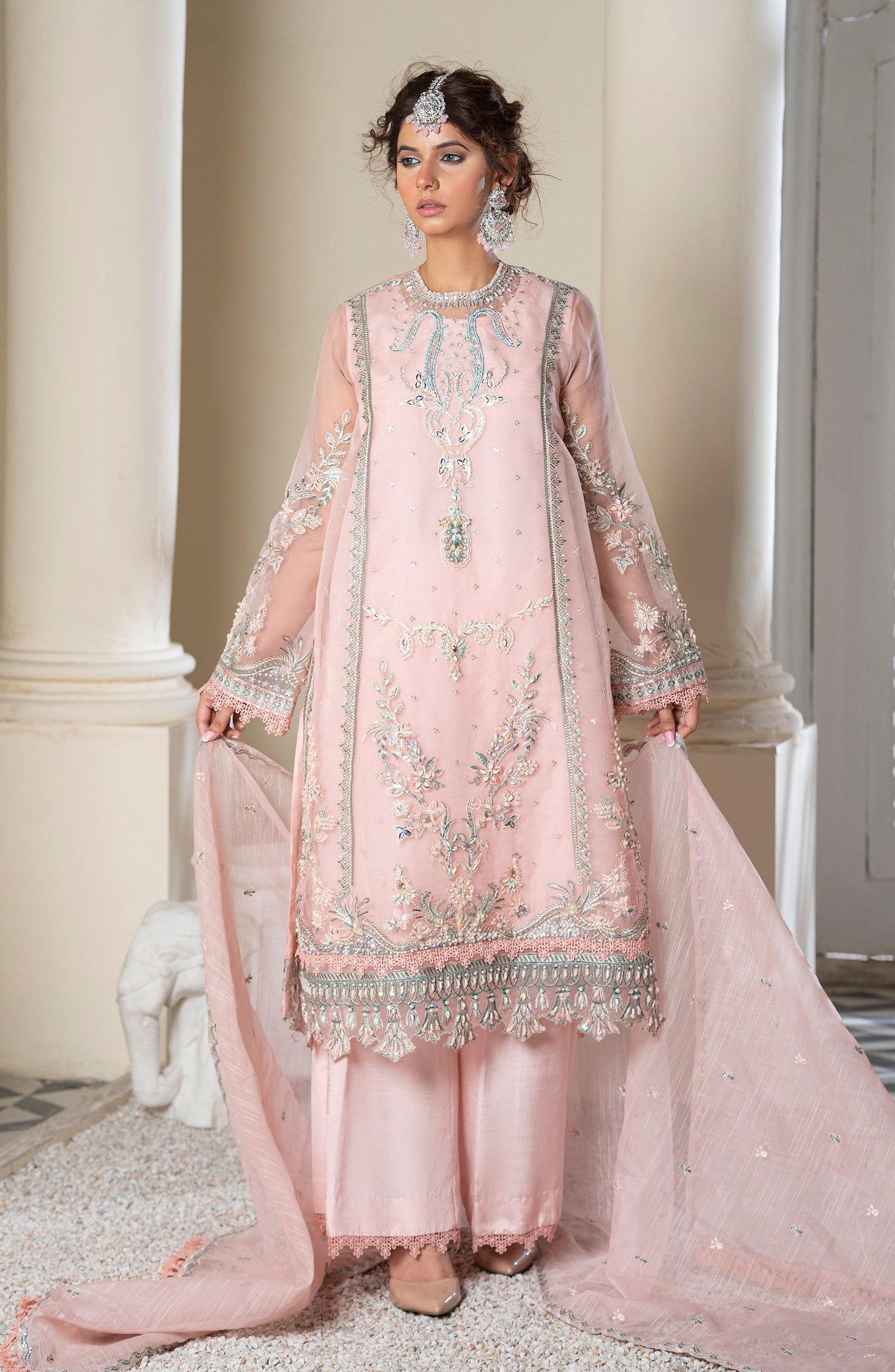 Look timelessly elegant in Peony! Crafted from organza, slub net, and raw silk, this beautifully designed shirt is further adorned with embroidery and adda work. Make a statement with this elegant pink ensemble at the next party.