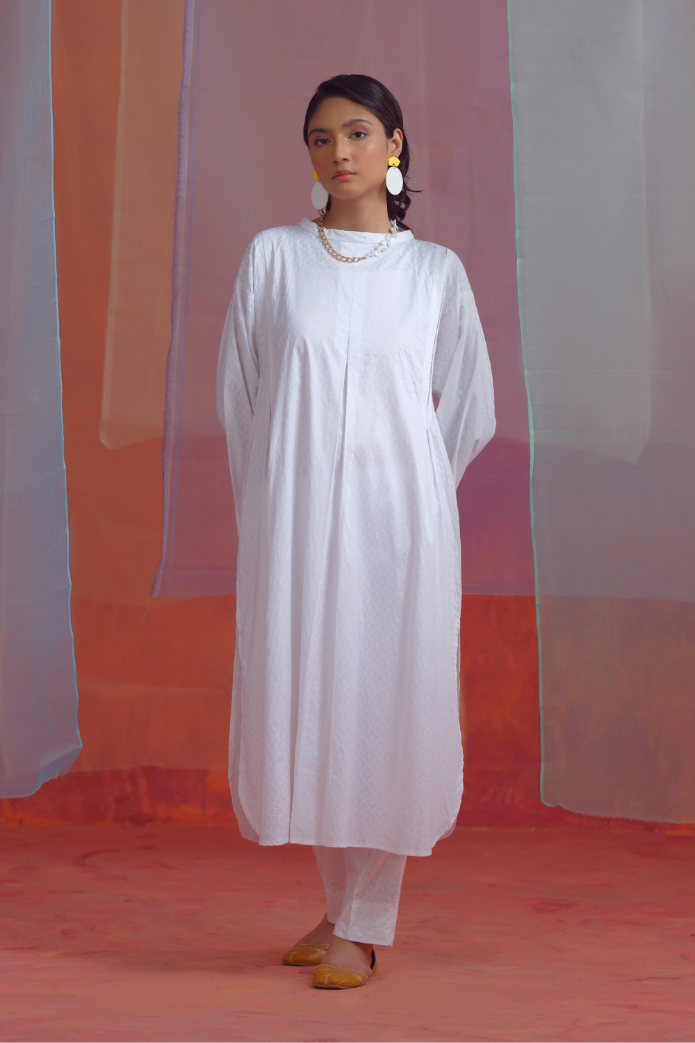 Stitched articles come with trousers tailored to match the unstitched trouser fabric provided. Please note that any appearance of shararas/ghararas in product images is for shoot purposes only unless otherwise specified in product details.