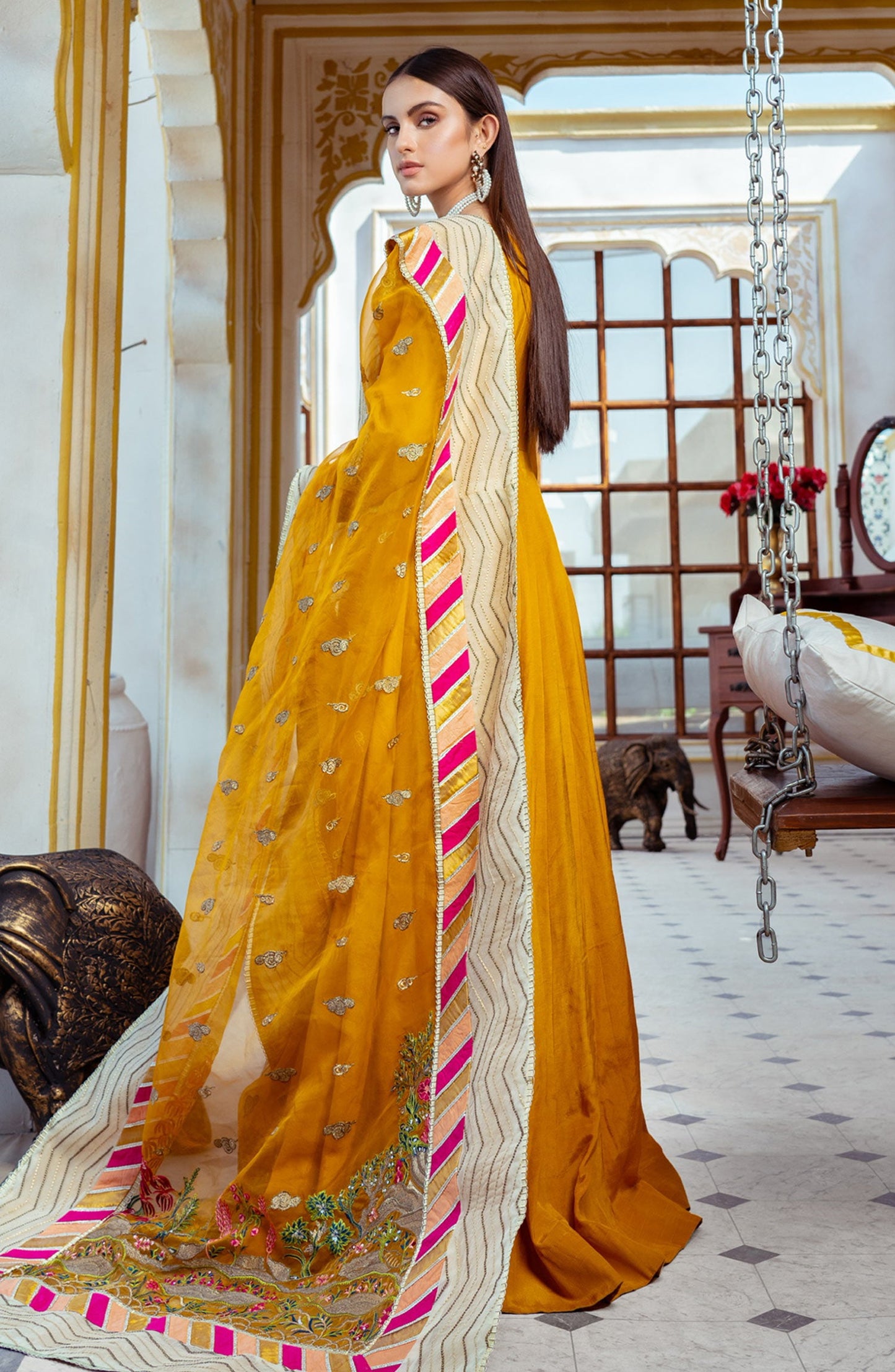 Raw silk Maxi with embroidered organza neck patch & sleeves patch Embroidered organza dupatta with embroidered organza pallu & Patti patch Grip trouser