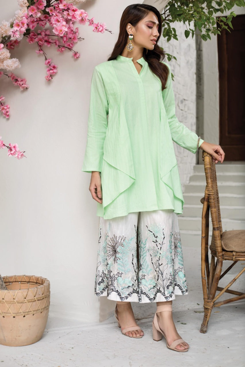 Stitched articles come with trousers tailored to match the unstitched trouser fabric provided. Please note that any appearance of shararas/ghararas in product images is for shoot purposes only unless otherwise specified in product details.