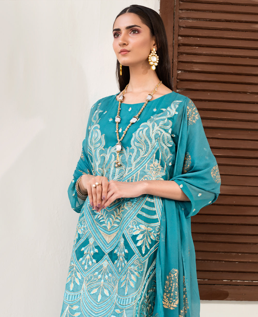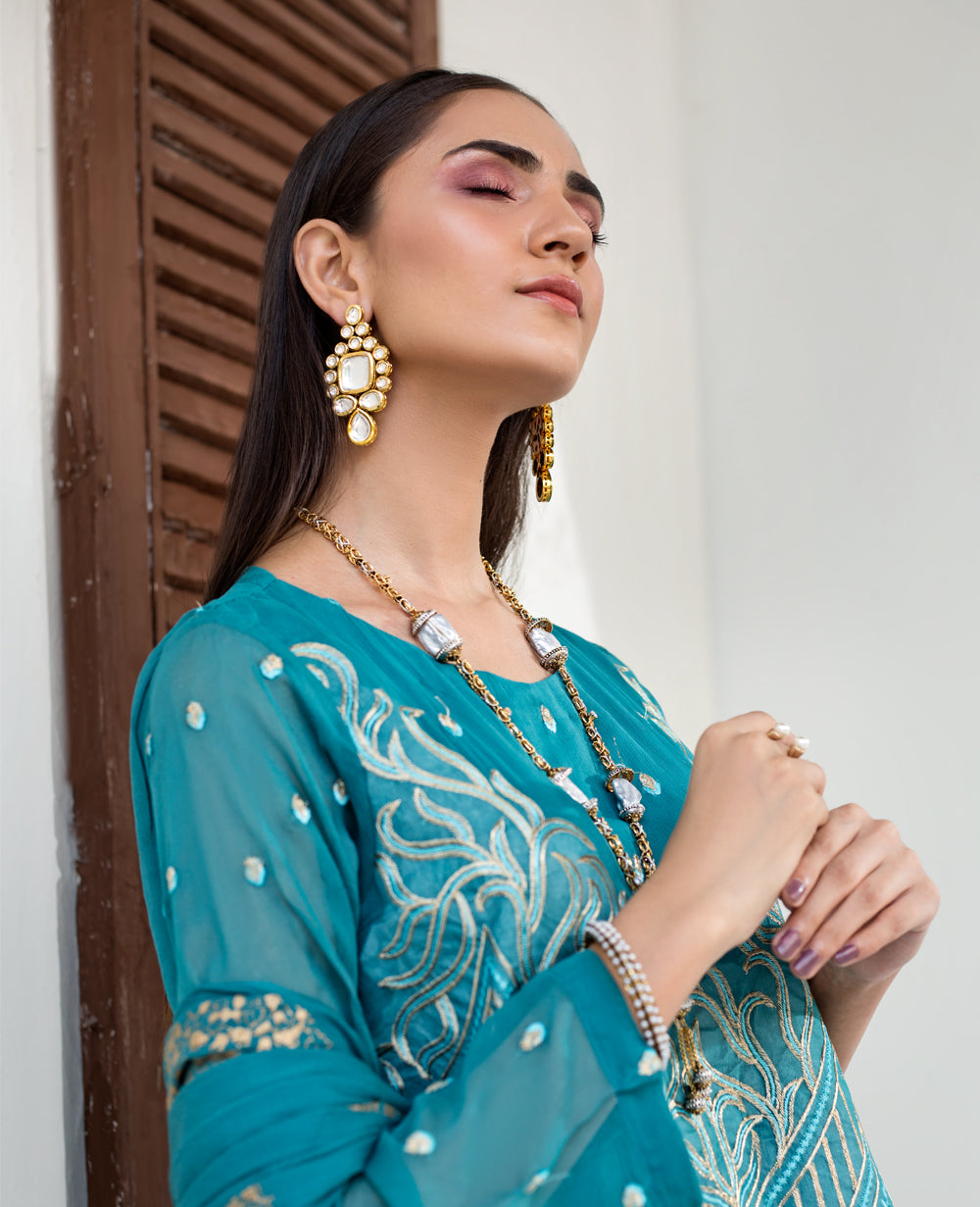 Stitched articles come with trousers tailored to match the unstitched trouser fabric provided. Please note that any appearance of shararas/ghararas in product images is for shoot purposes only unless otherwise specified in product details.