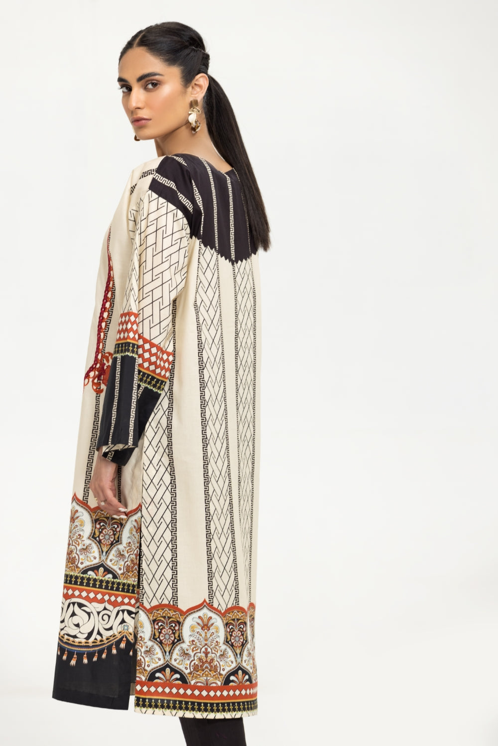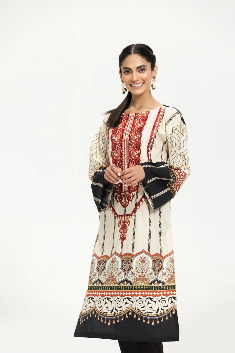 Stitched articles come with trousers tailored to match the unstitched trouser fabric provided. Please note that any appearance of shararas/ghararas in product images is for shoot purposes only unless otherwise specified in product details.