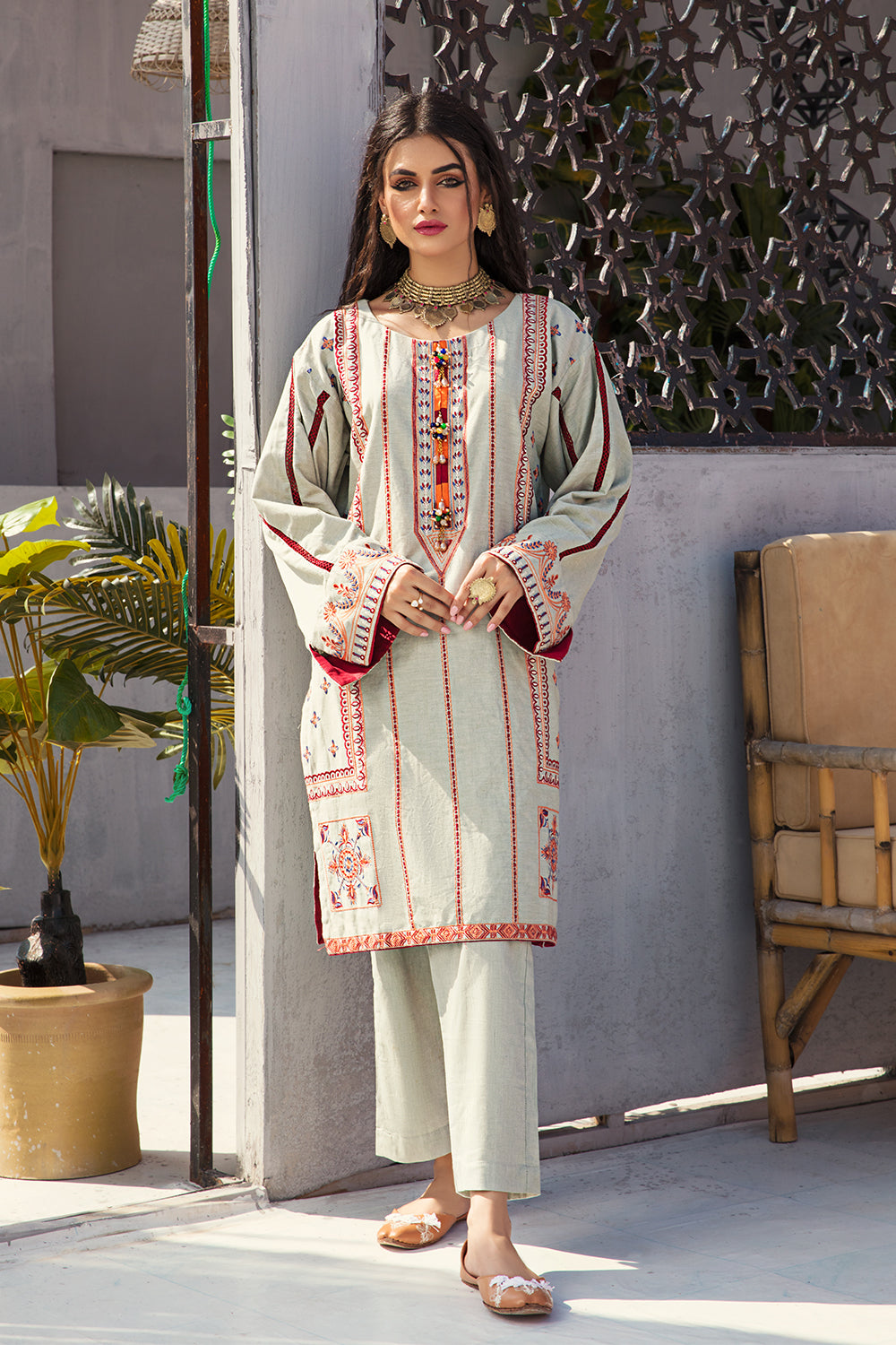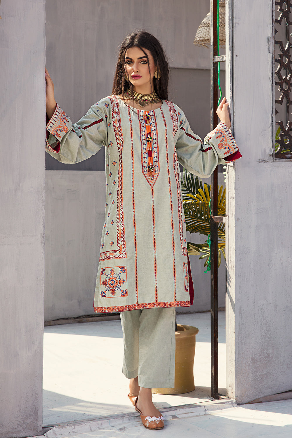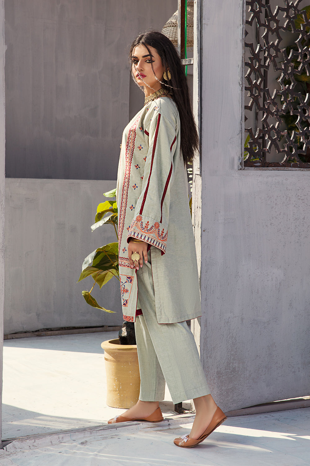 Cotton Stitched Front And Sleeve Embroided Shirt + Plain Trouser