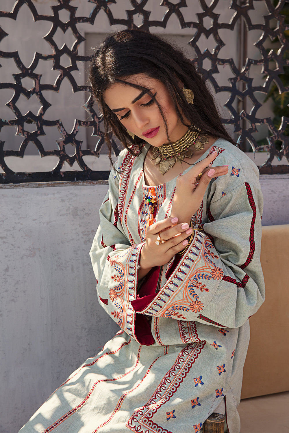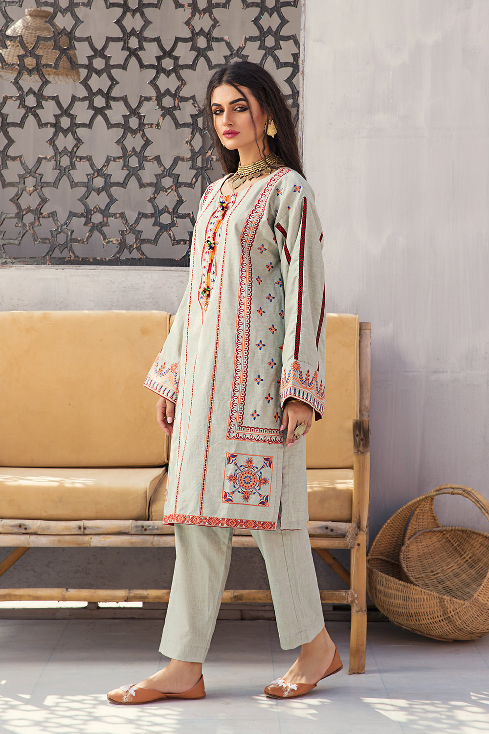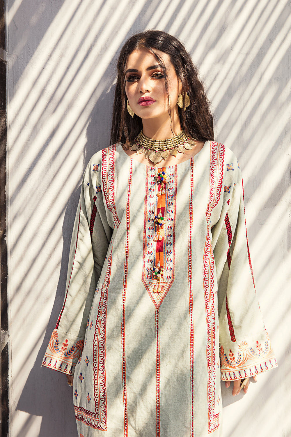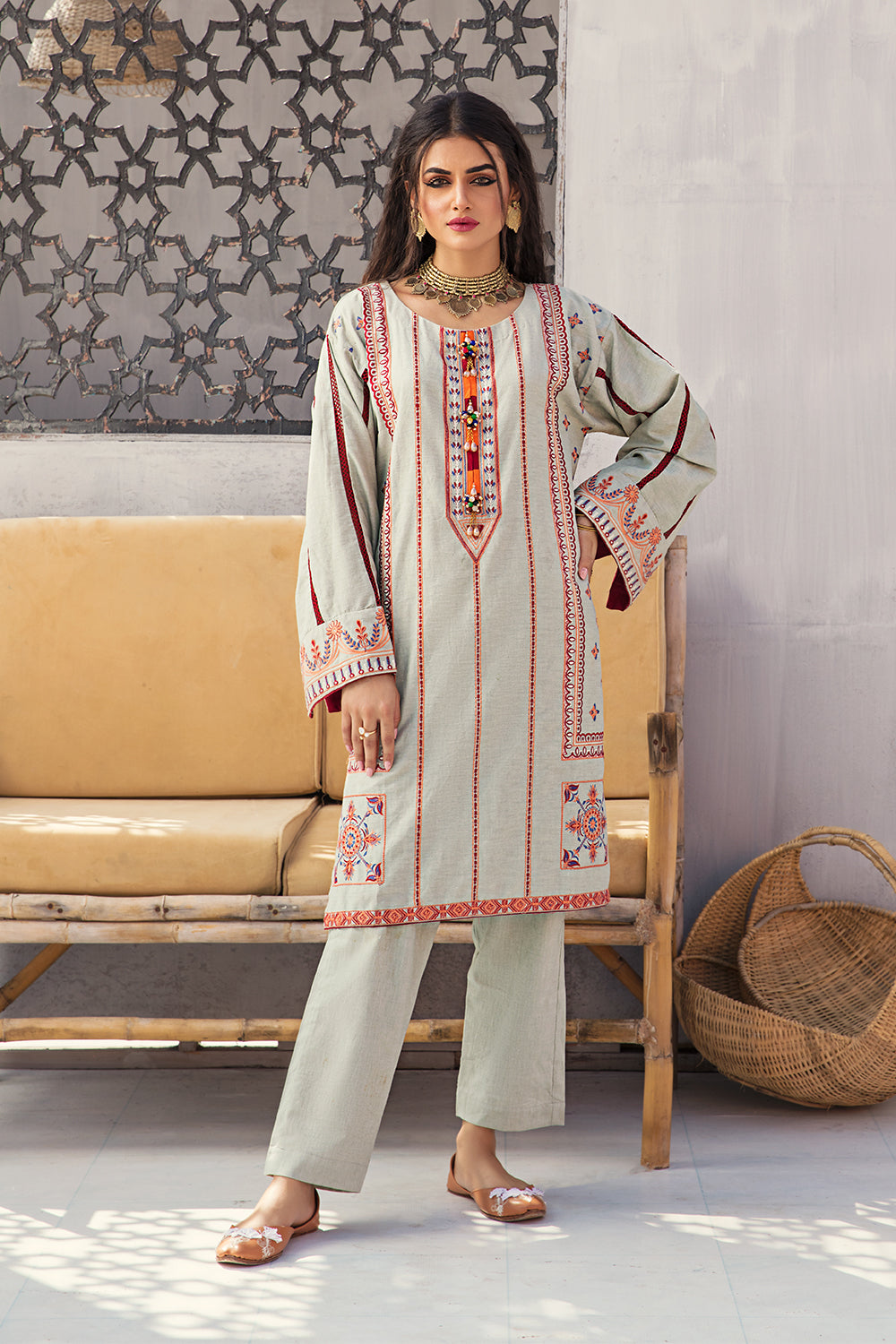 Cotton Stitched Front And Sleeve Embroided Shirt + Plain Trouser
