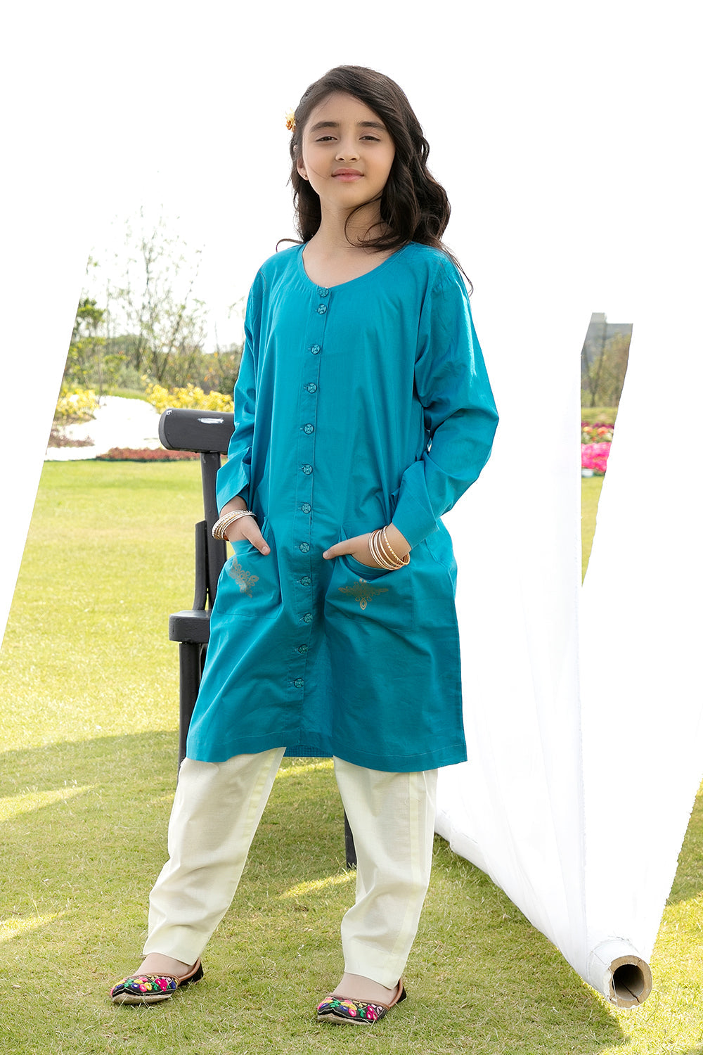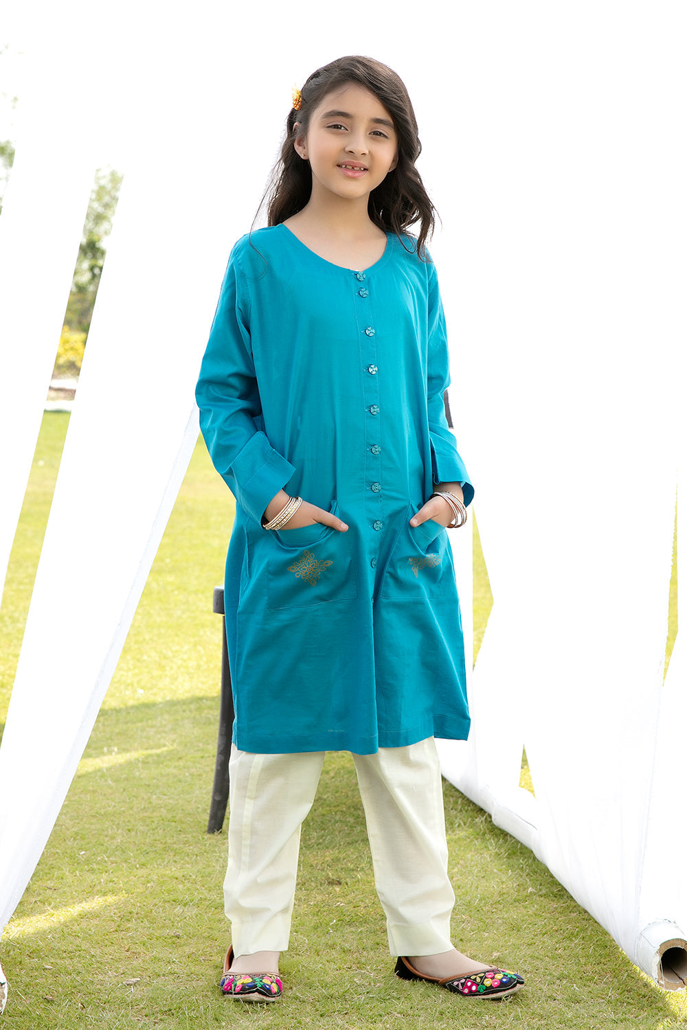 Stitched articles come with trousers tailored to match the unstitched trouser fabric provided. Please note that any appearance of shararas/ghararas in product images is for shoot purposes only unless otherwise specified in product details.