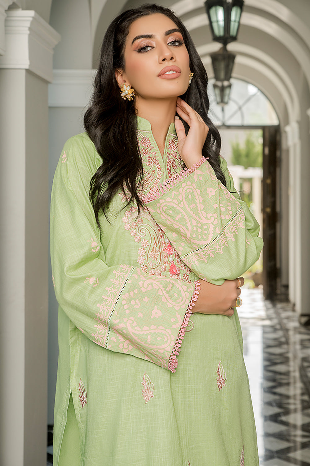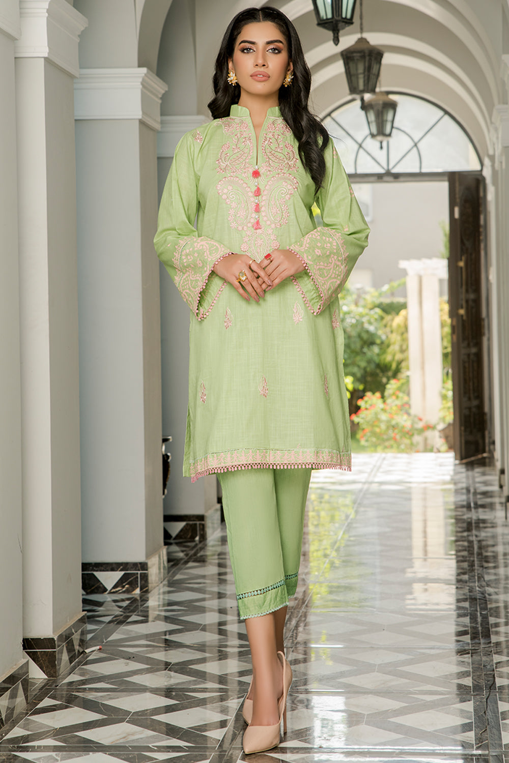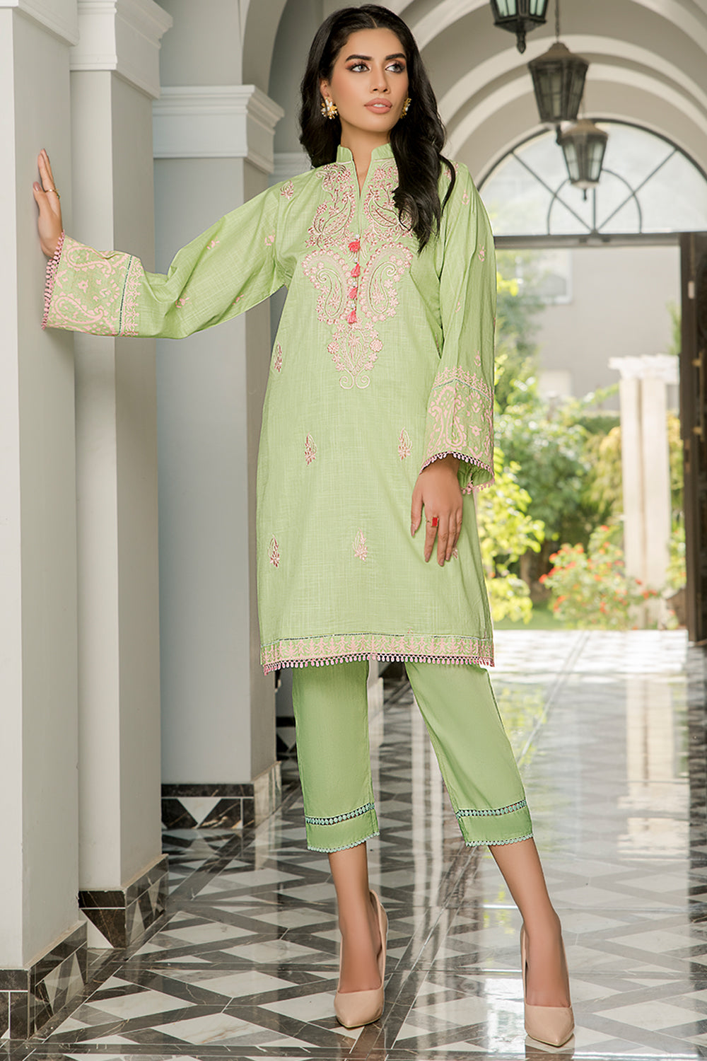Stitched articles come with trousers tailored to match the unstitched trouser fabric provided. Please note that any appearance of shararas/ghararas in product images is for shoot purposes only unless otherwise specified in product details.