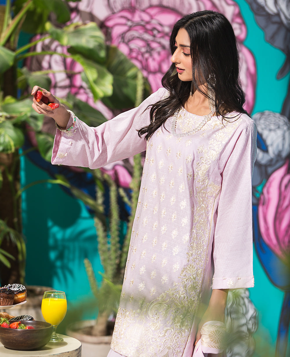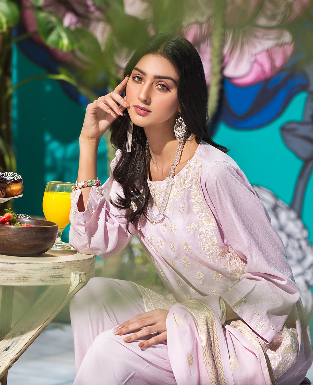 Stitched articles come with trousers tailored to match the unstitched trouser fabric provided. Please note that any appearance of shararas/ghararas in product images is for shoot purposes only unless otherwise specified in product details.