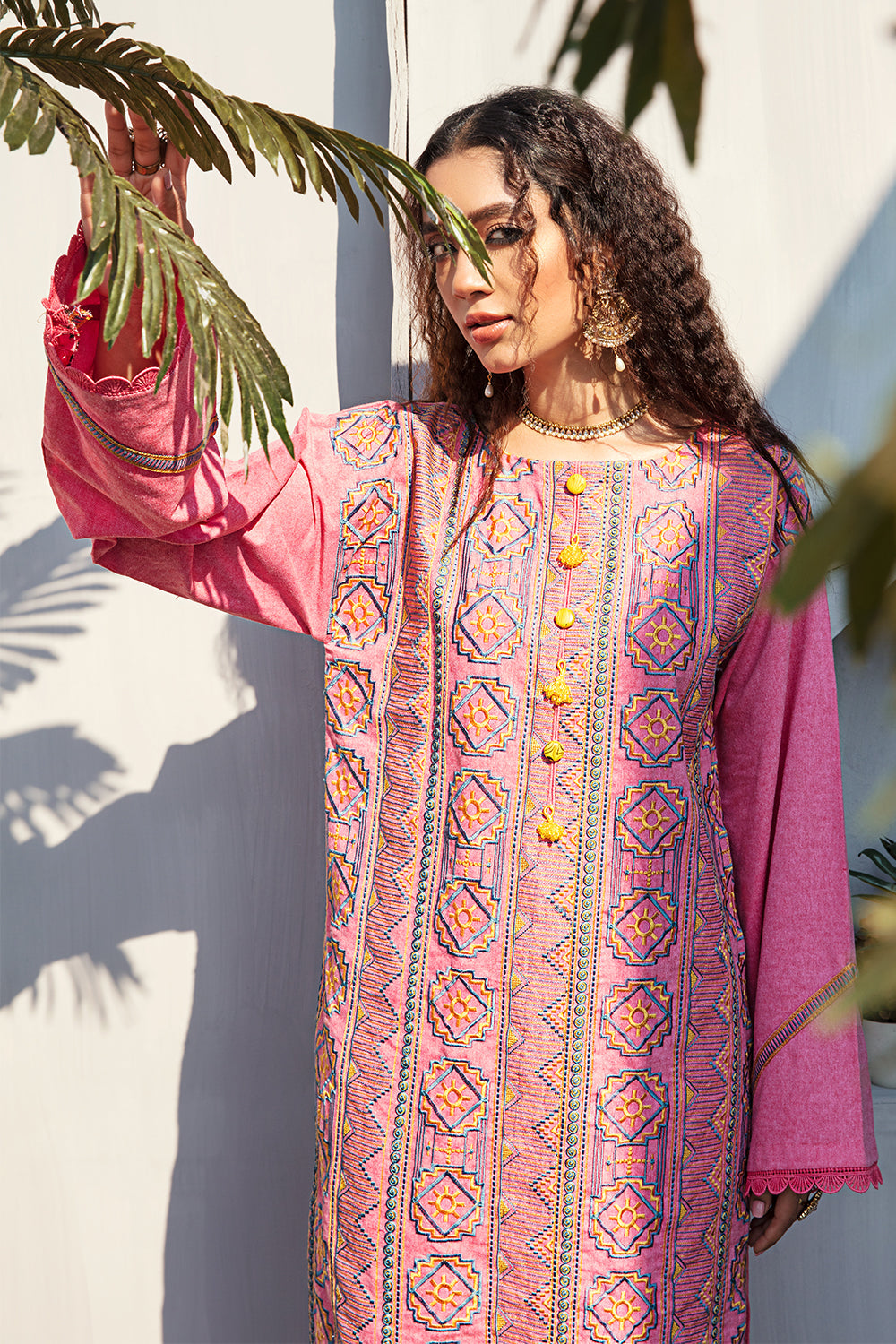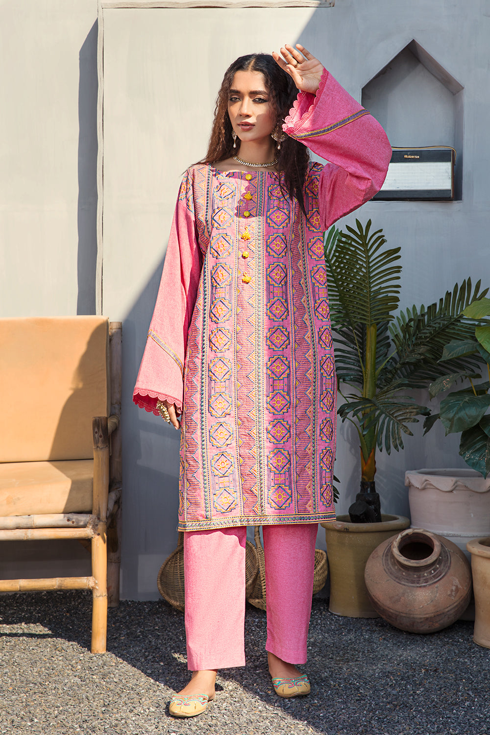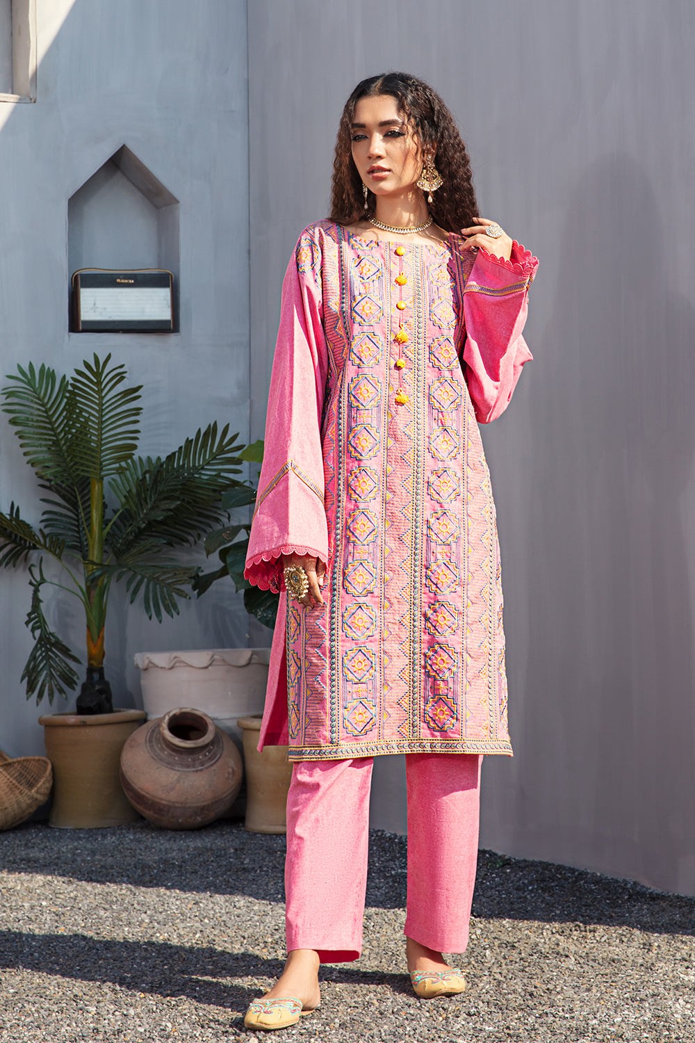 Stitched articles come with trousers tailored to match the unstitched trouser fabric provided. Please note that any appearance of shararas/ghararas in product images is for shoot purposes only unless otherwise specified in product details.