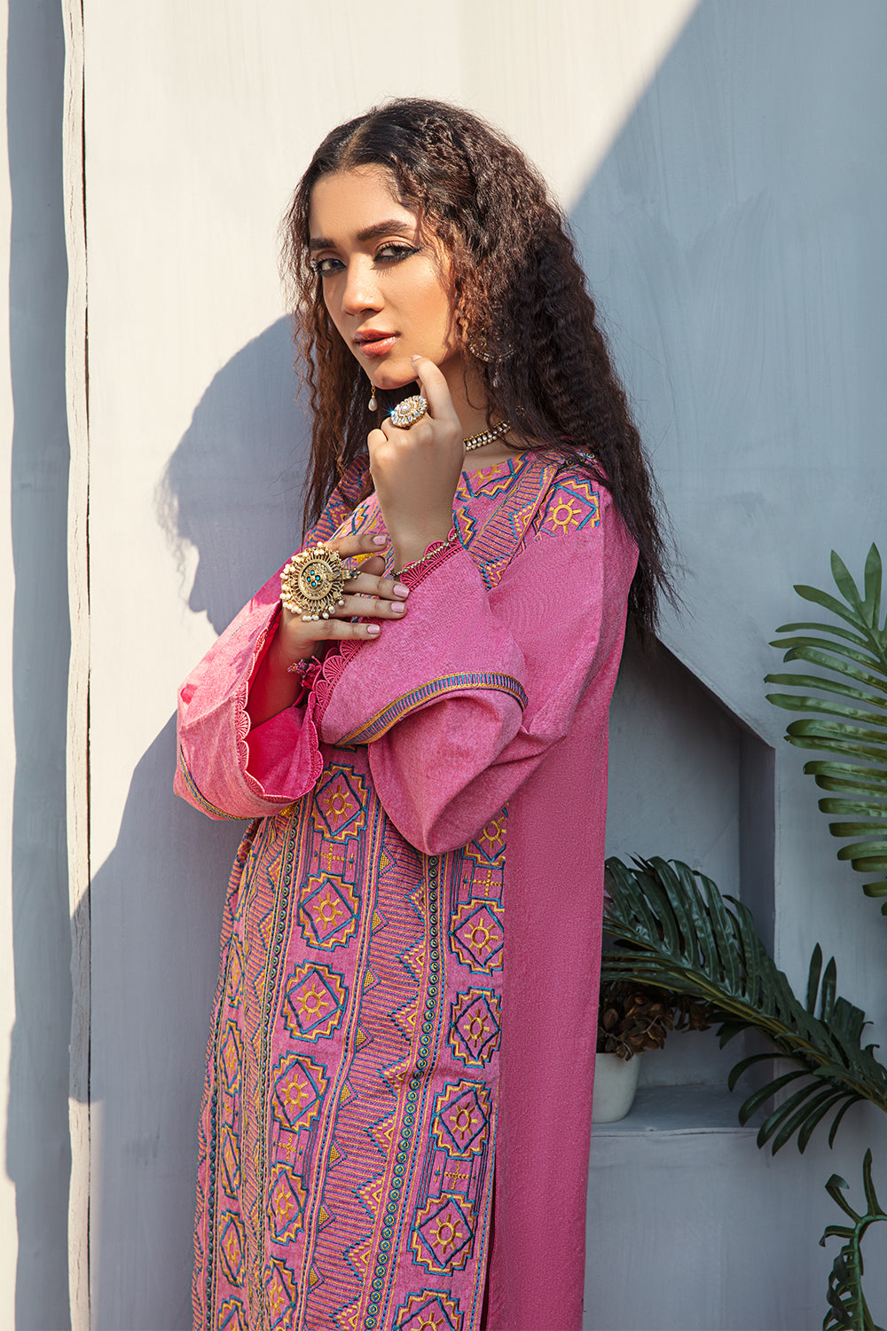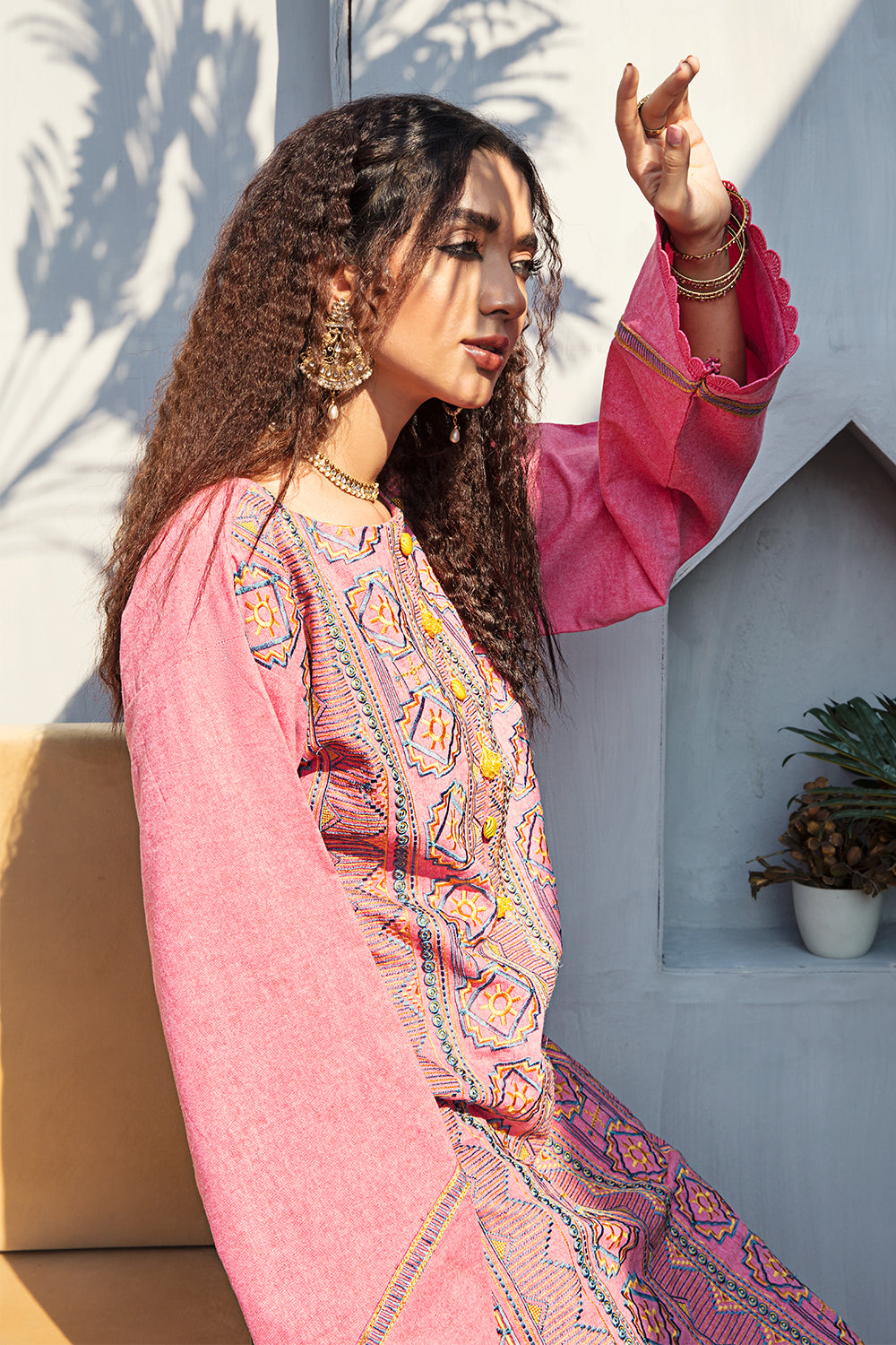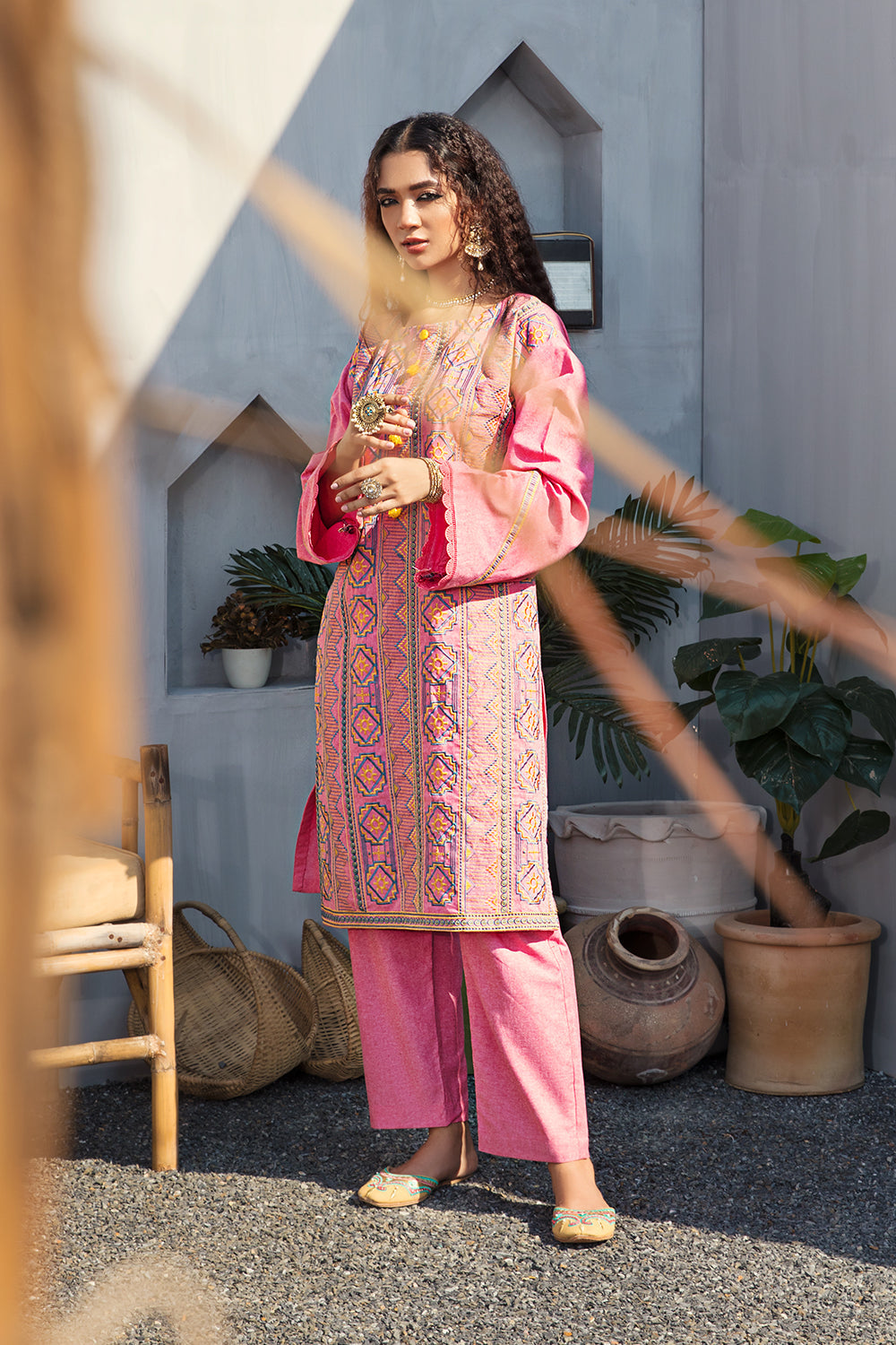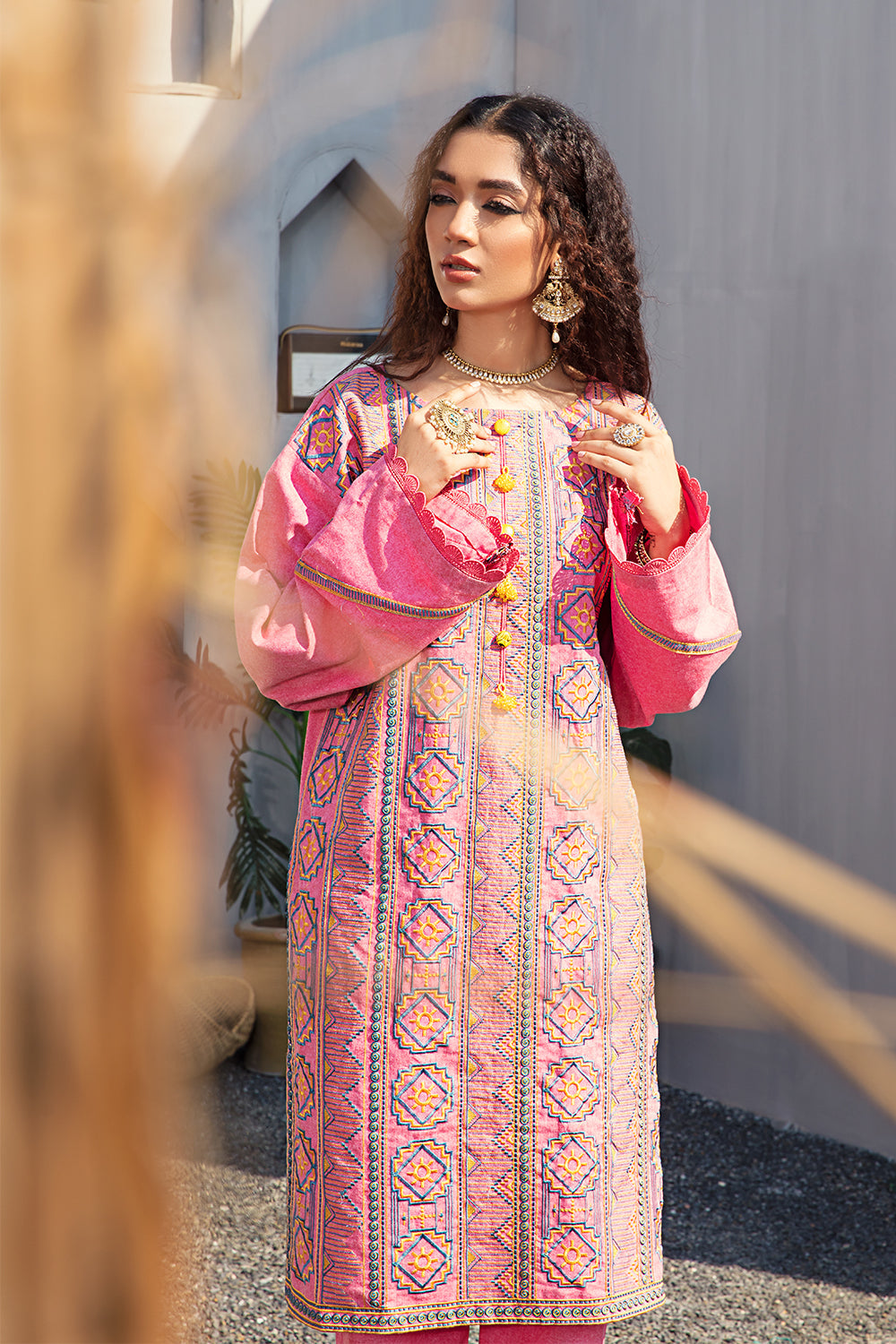 Stitched articles come with trousers tailored to match the unstitched trouser fabric provided. Please note that any appearance of shararas/ghararas in product images is for shoot purposes only unless otherwise specified in product details.