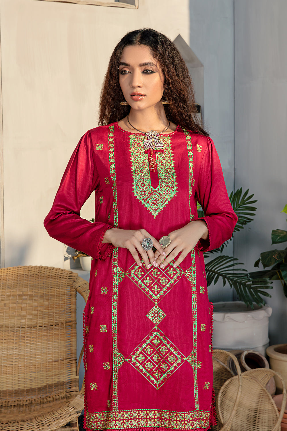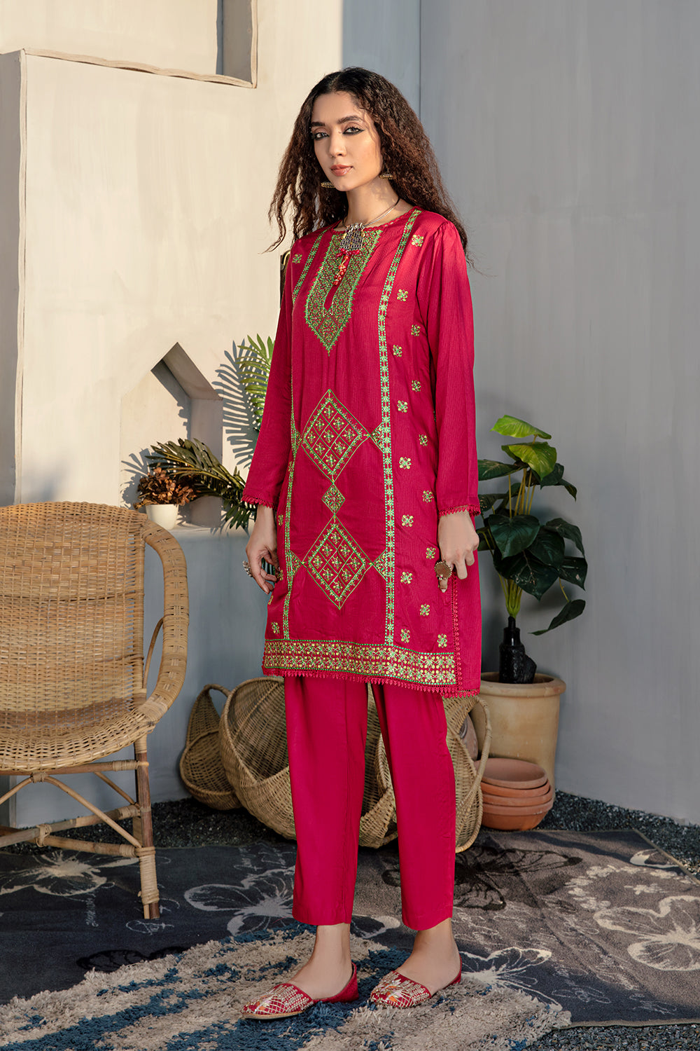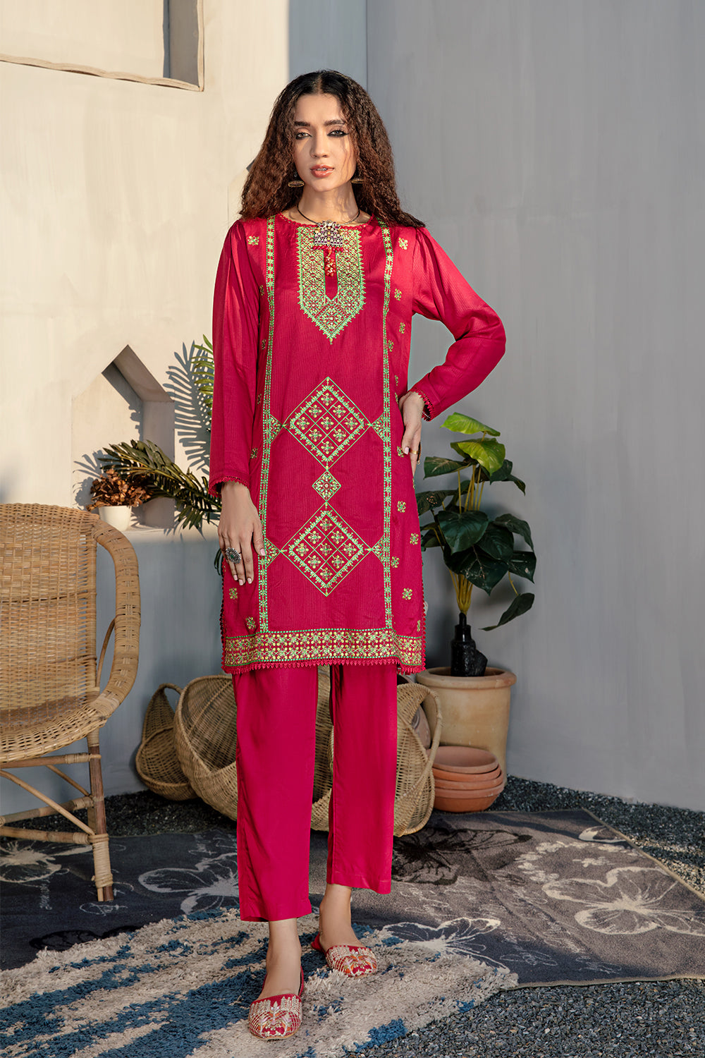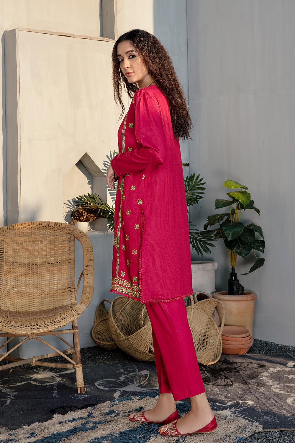 Stitched articles come with trousers tailored to match the unstitched trouser fabric provided. Please note that any appearance of shararas/ghararas in product images is for shoot purposes only unless otherwise specified in product details.