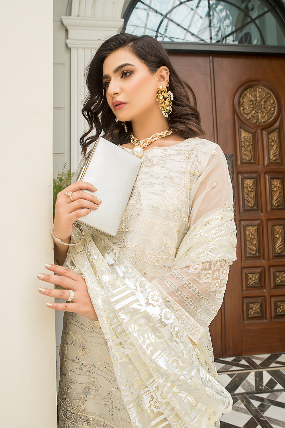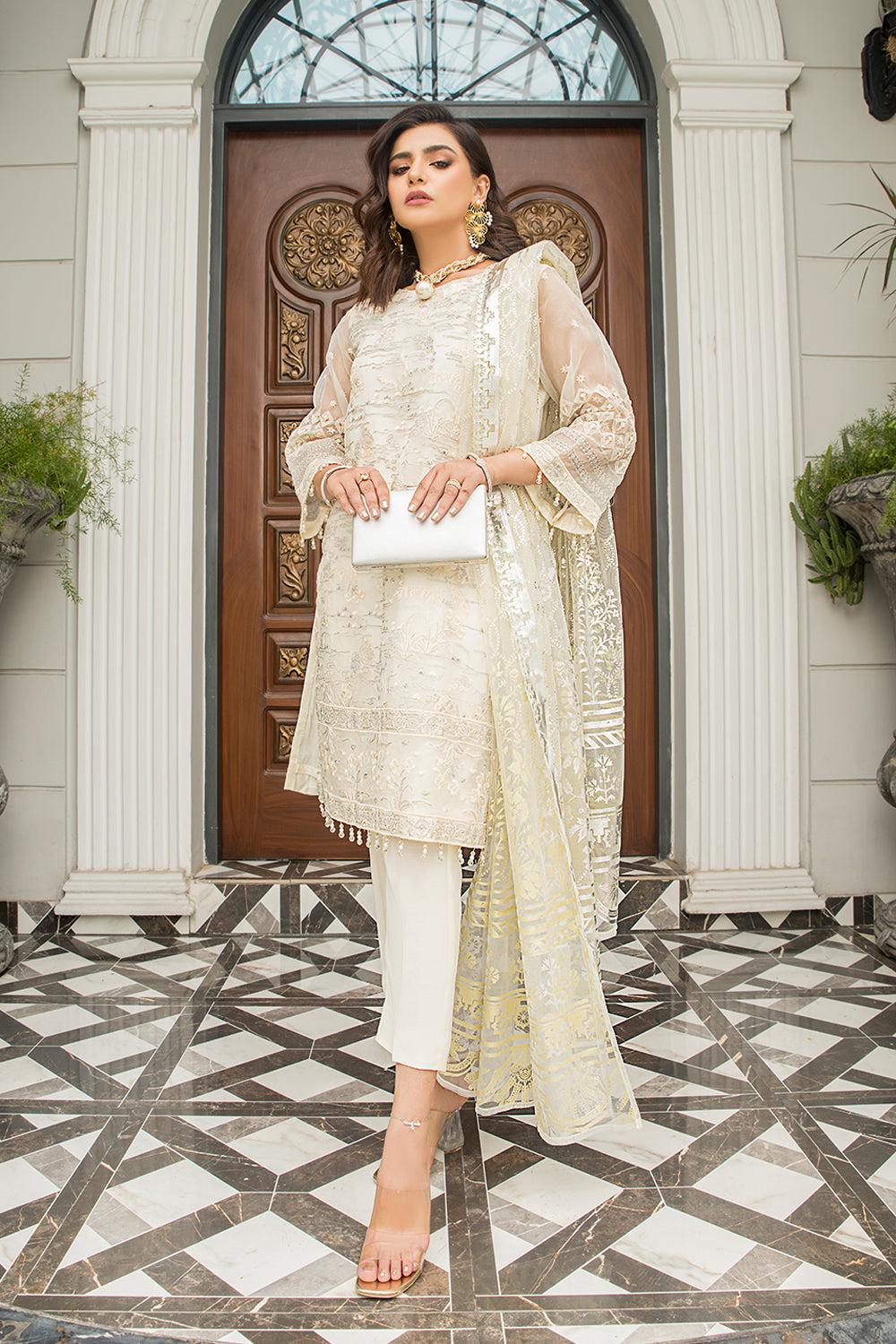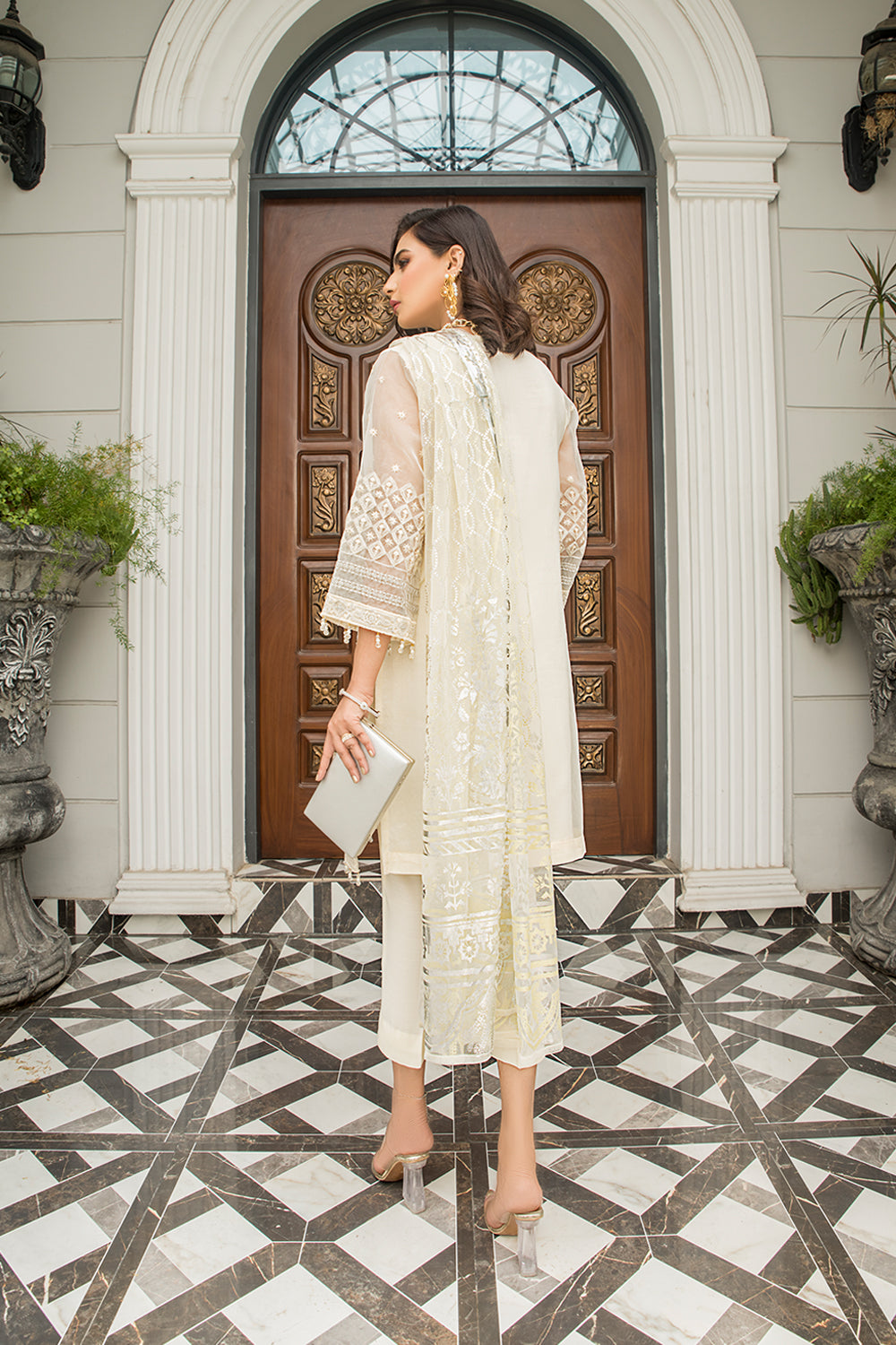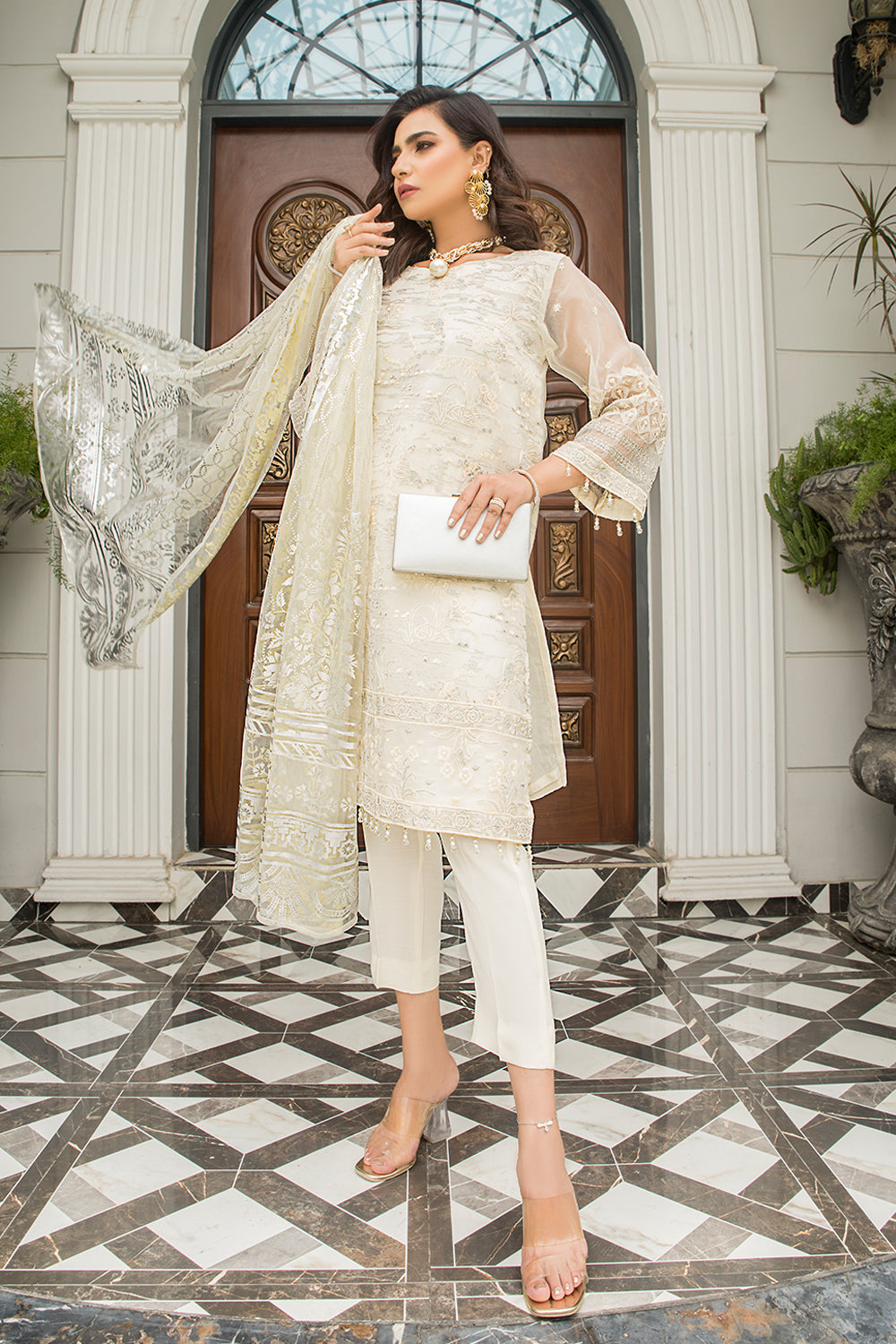 Organza Embroided Shirt With Insole. Raw Silk Trouser & Printed Net Dupatta
