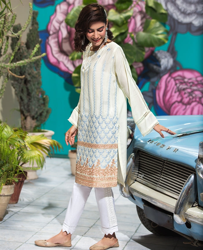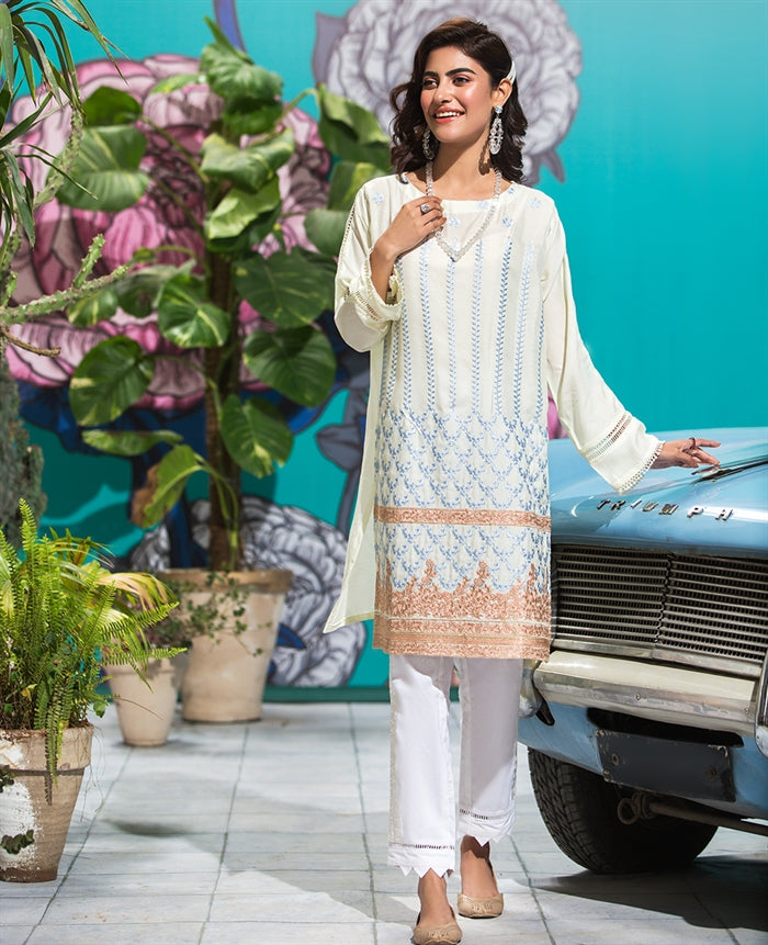 Stitched articles come with trousers tailored to match the unstitched trouser fabric provided. Please note that any appearance of shararas/ghararas in product images is for shoot purposes only unless otherwise specified in product details.