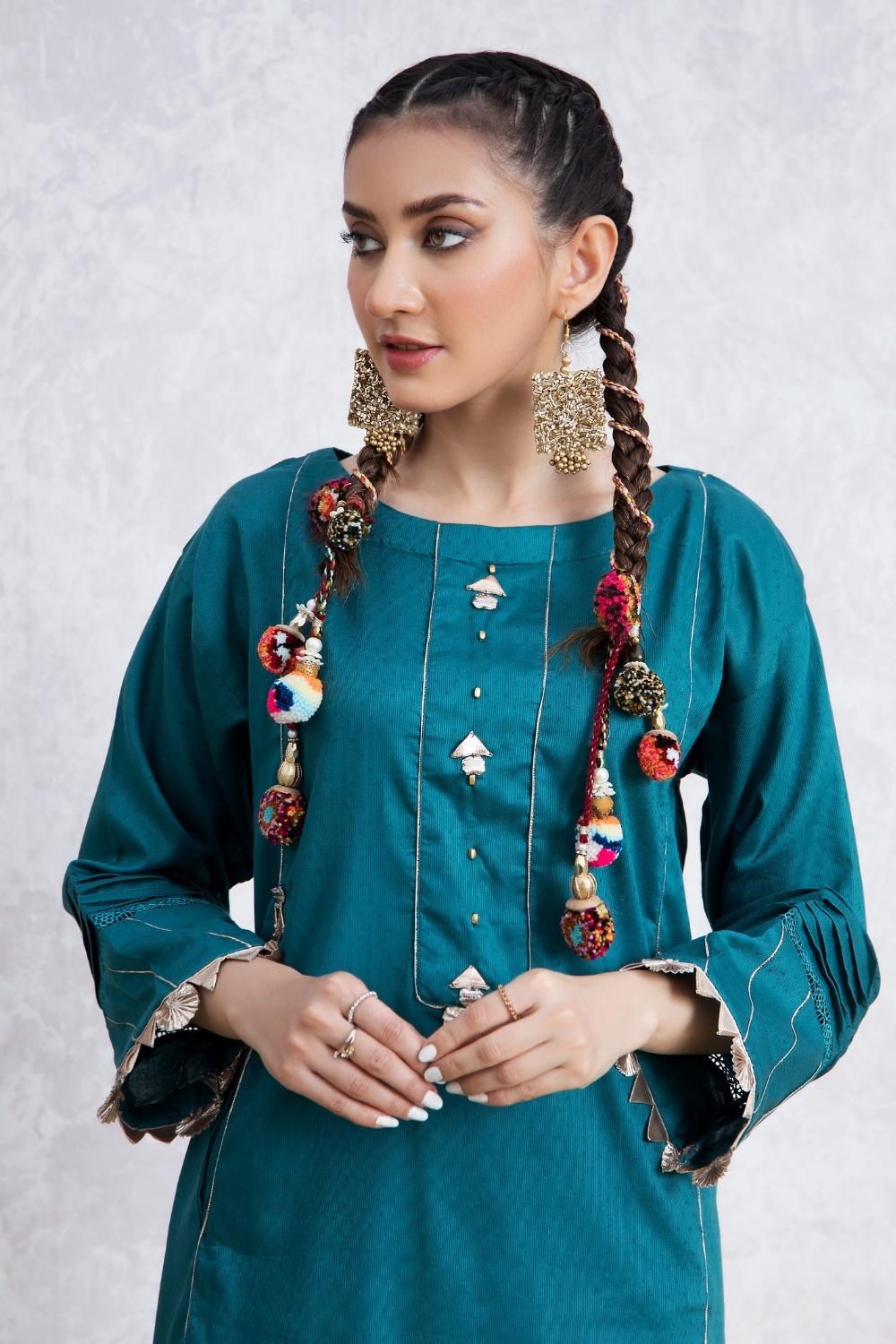 Stitched articles come with trousers tailored to match the unstitched trouser fabric provided. Please note that any appearance of shararas/ghararas in product images is for shoot purposes only unless otherwise specified in product details.