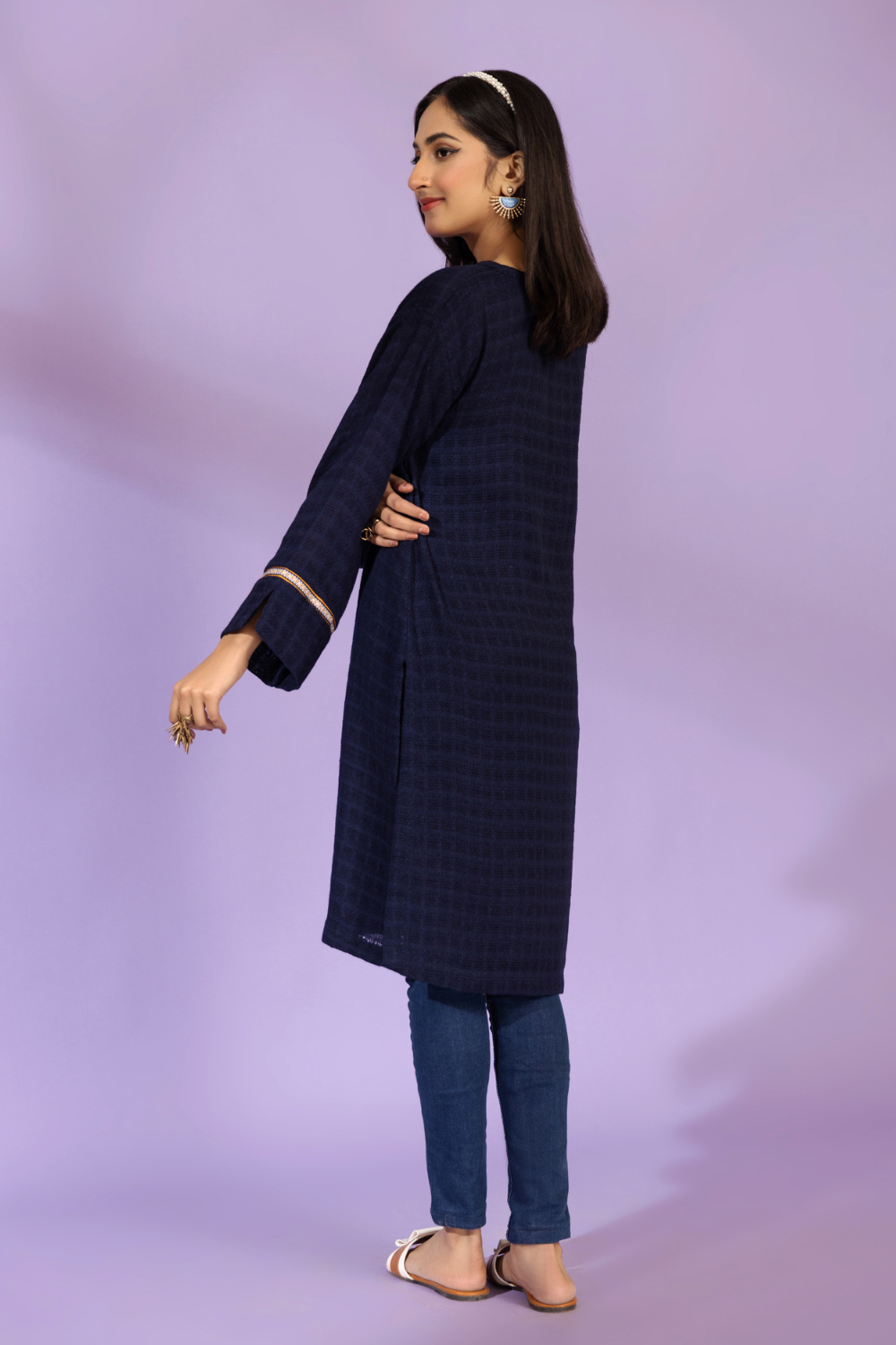 Stitched articles come with trousers tailored to match the unstitched trouser fabric provided. Please note that any appearance of shararas/ghararas in product images is for shoot purposes only unless otherwise specified in product details.