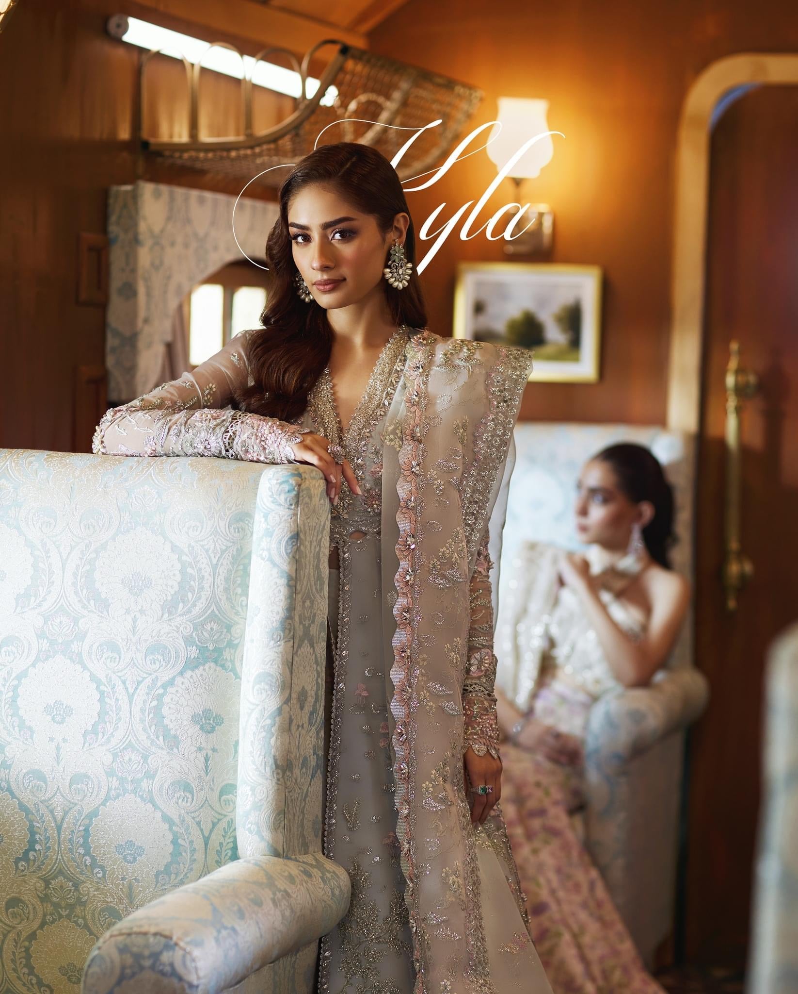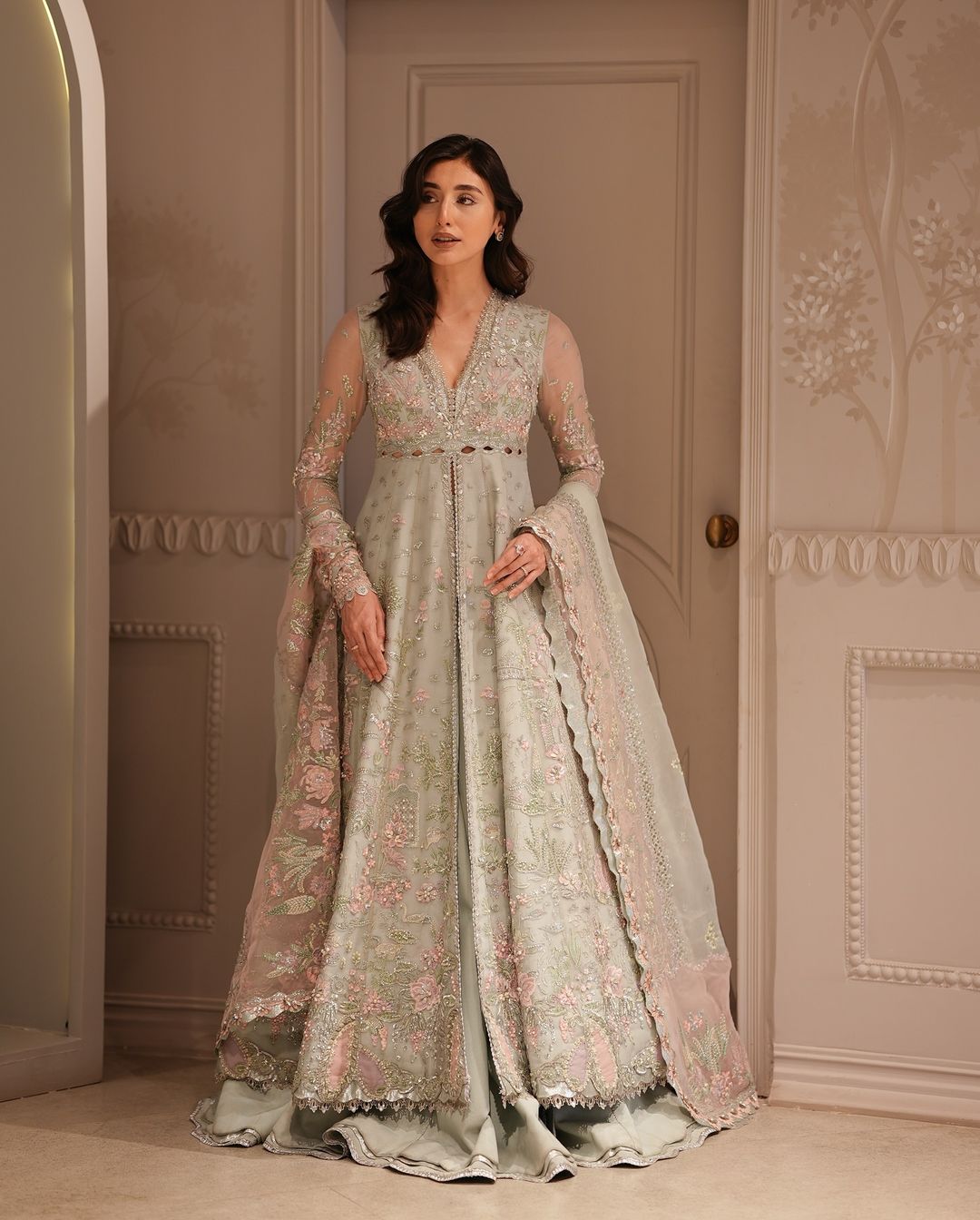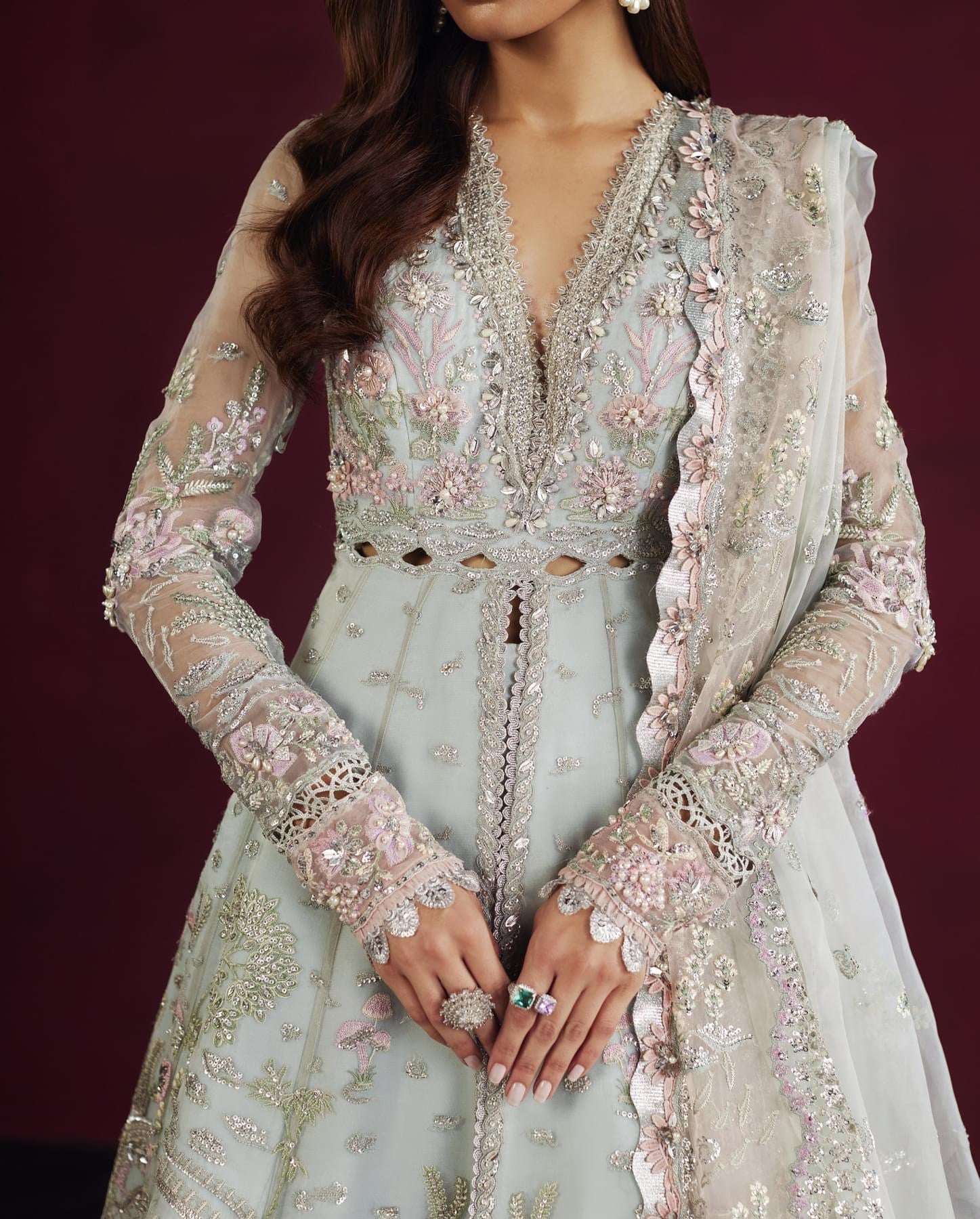 Immerse yourself in the realm of Kyla, a distinctive ensemble that brings the beauty of marine life to life on a soft pastel aqua blue canvas. Heavy embroidery panels showcase delicate multi-color embroidery, adorned with the subtle glimmer of sequins and the whimsical touch of tilla. The organza shirt features intricate hand embellishments with beads and stones, elevating it to a true masterpiece of artistry. Every meticulously woven thread narrates a tale of the underwater world.
