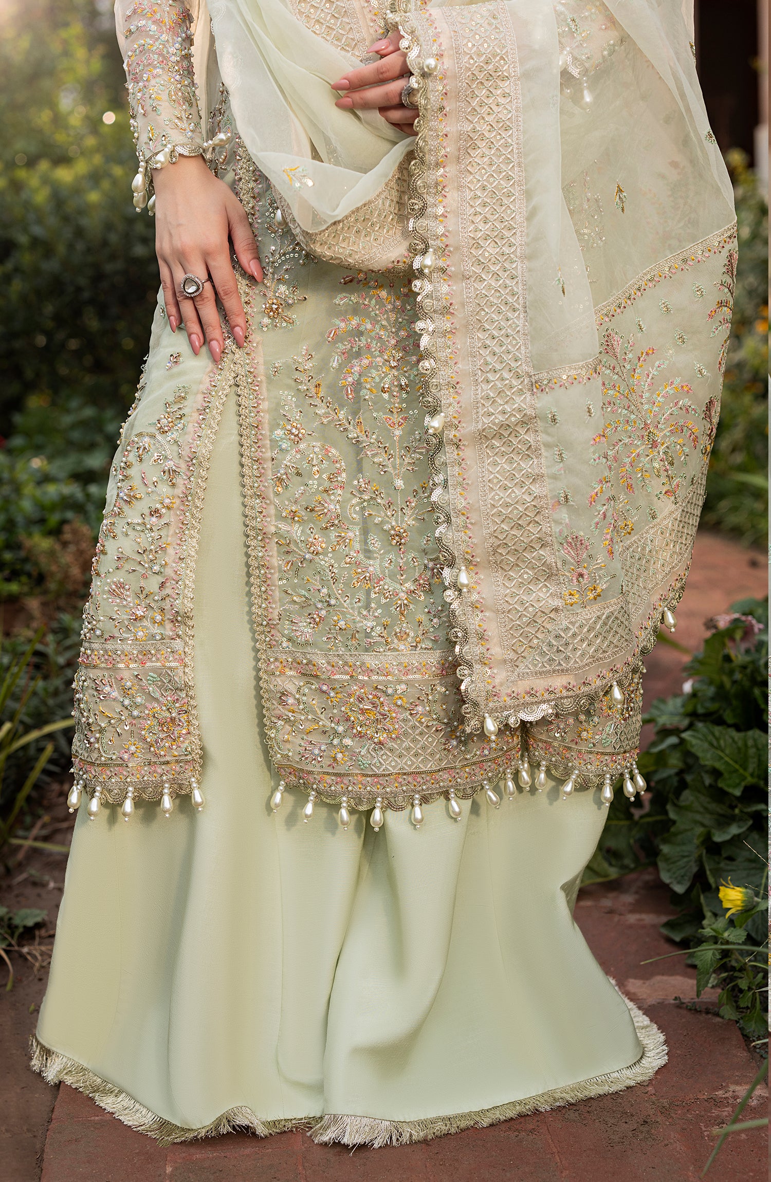 Stitched articles come with trousers tailored to match the unstitched trouser fabric provided. Please note that any appearance of shararas/ghararas in product images is for shoot purposes only unless otherwise specified in product details.