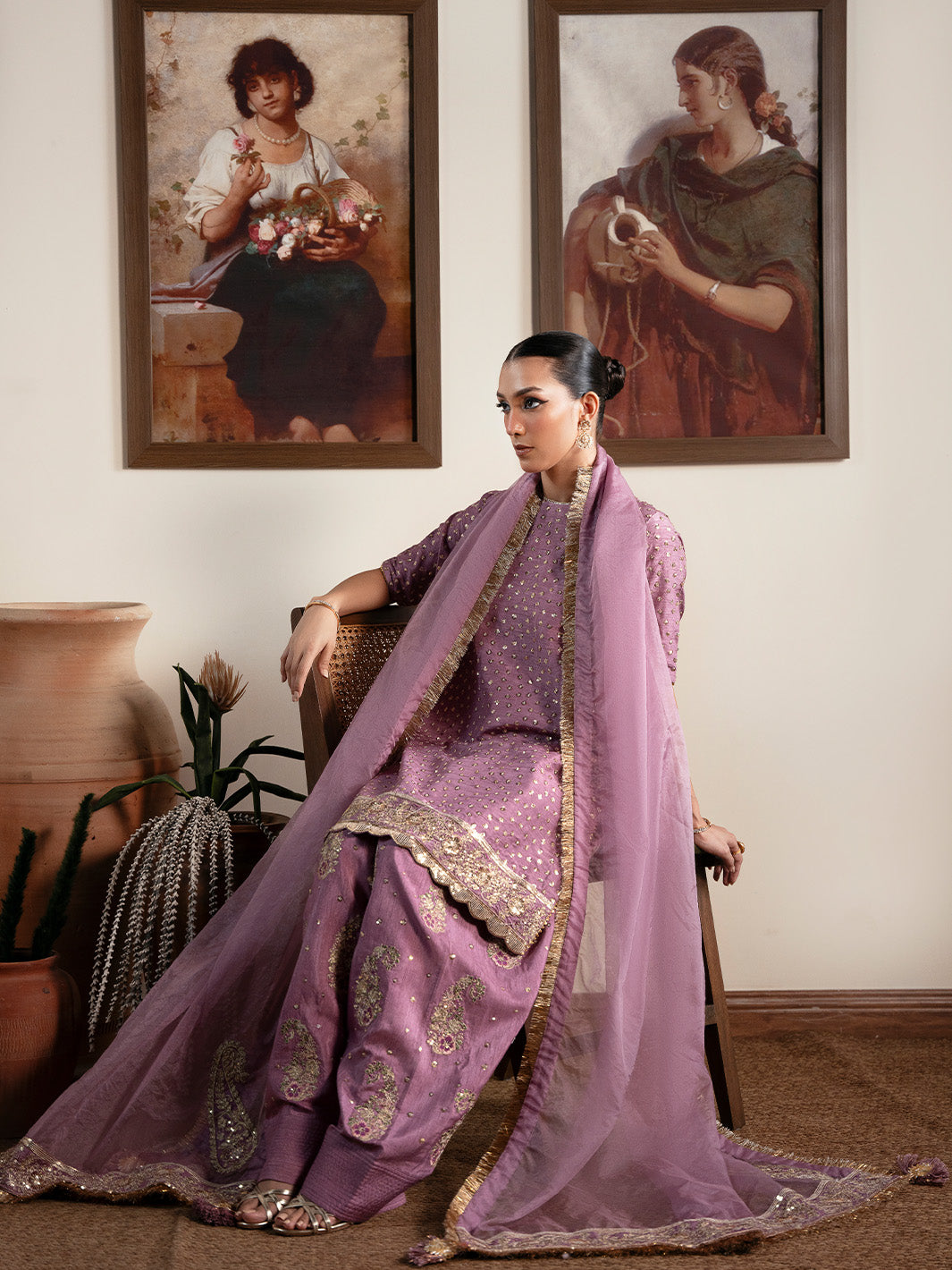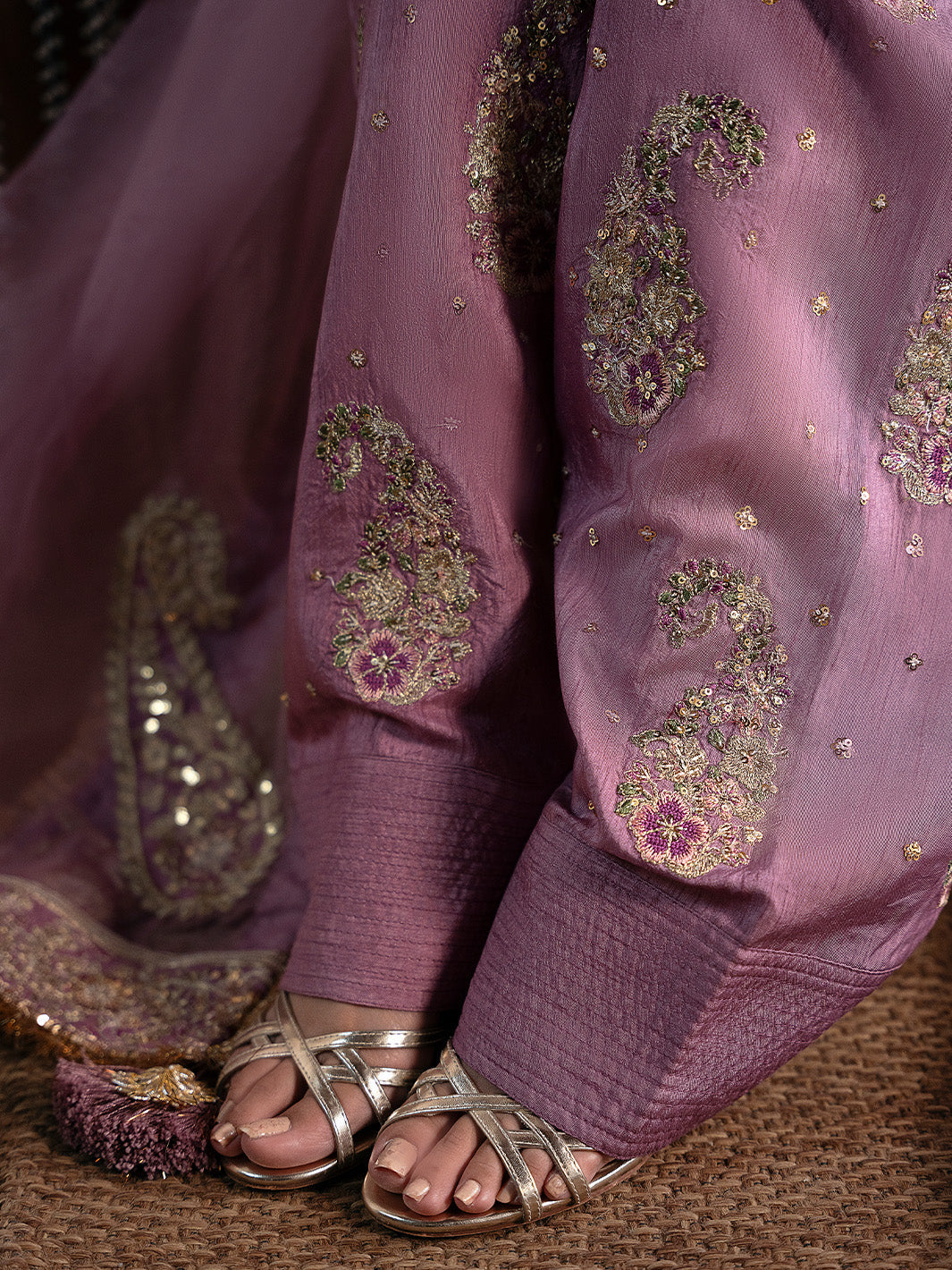 Purple silk shirt paired with a farshi shalwar both carrying subtle multicolored embroidery that adds vibrance to the look. The ensemble is completed with organza dupatta finished with paisleys and embroidered border.