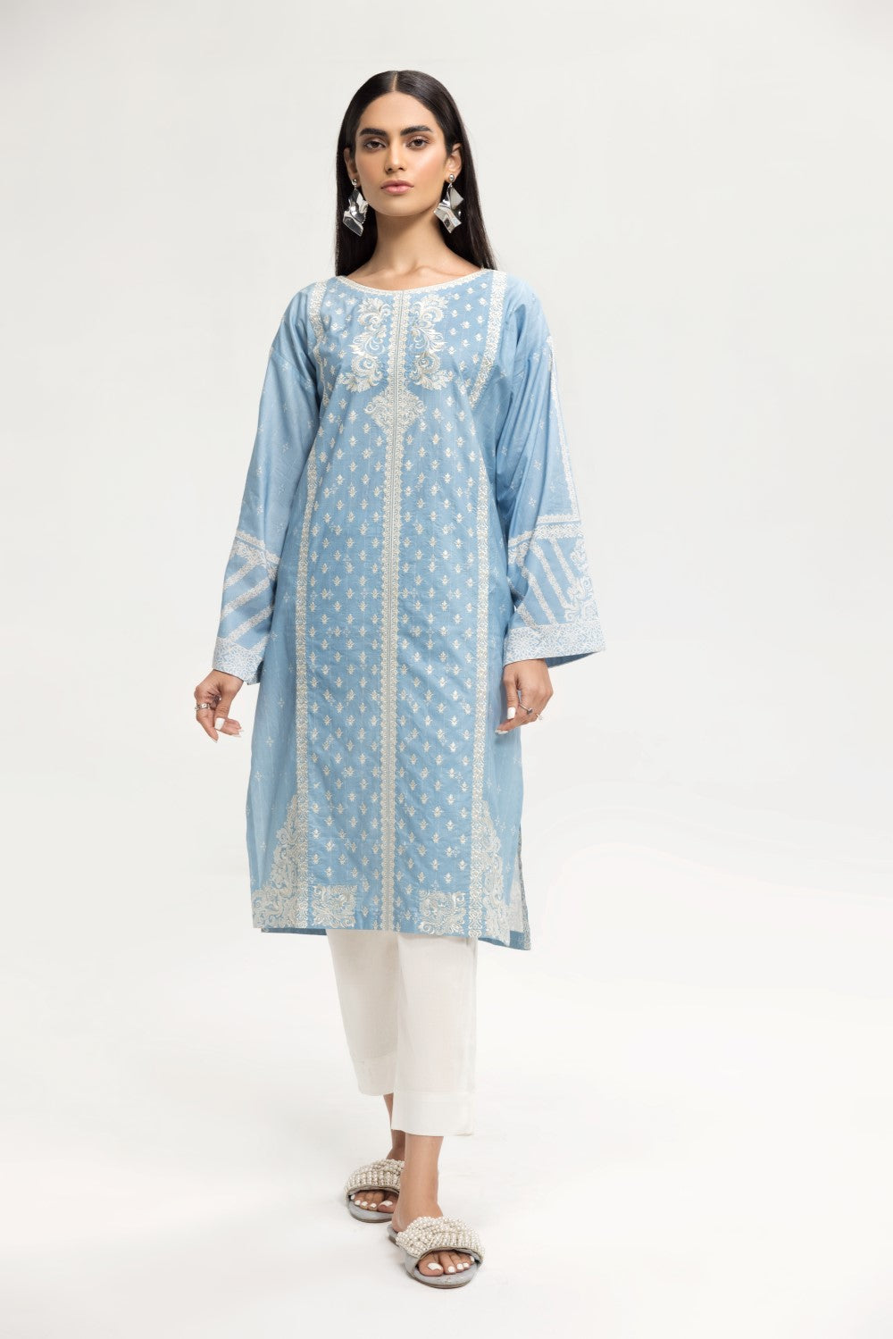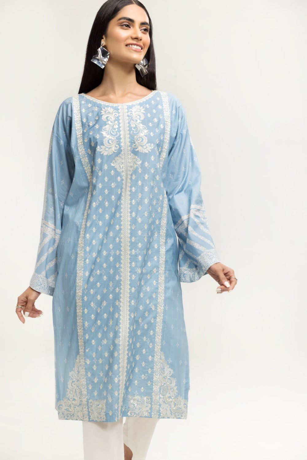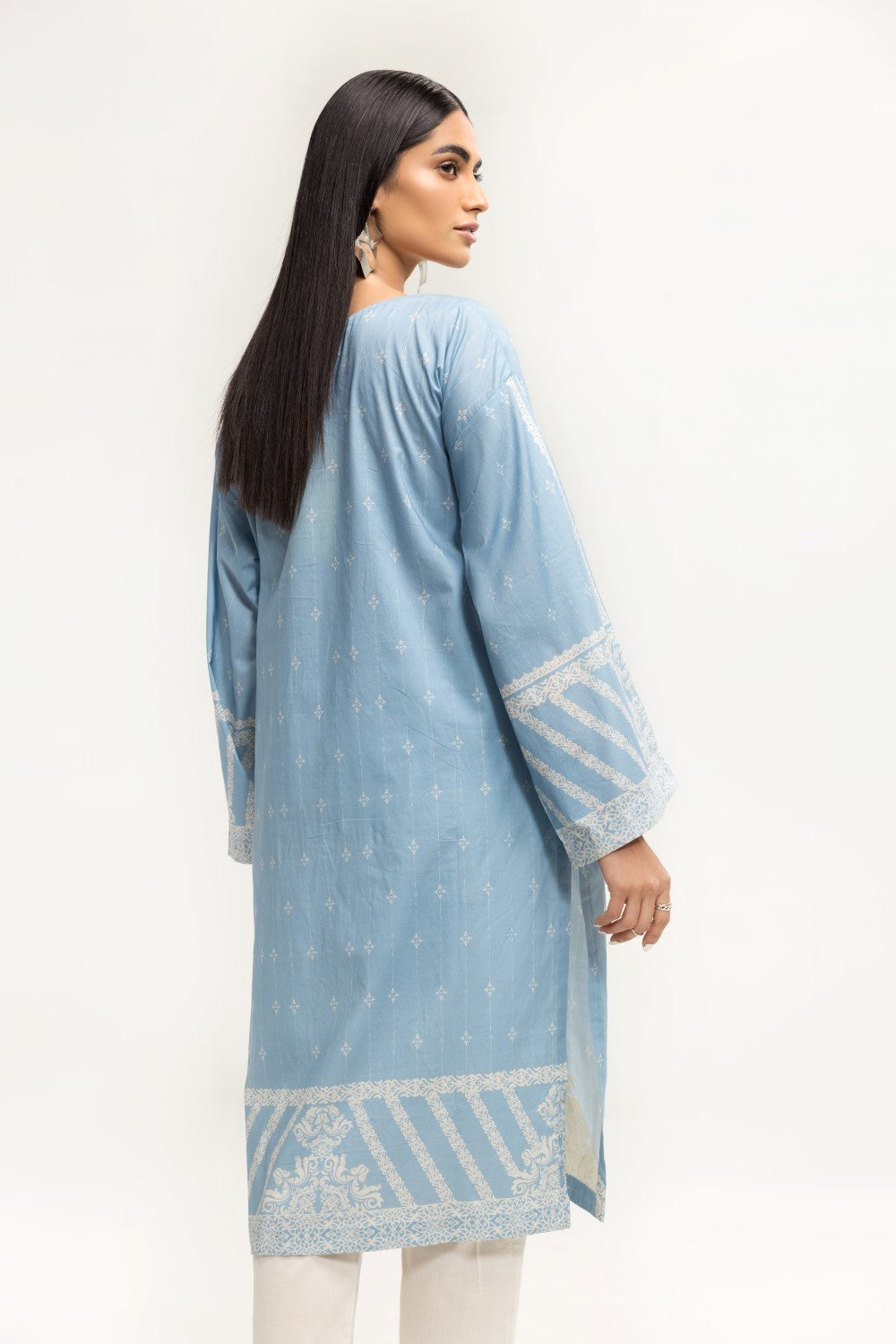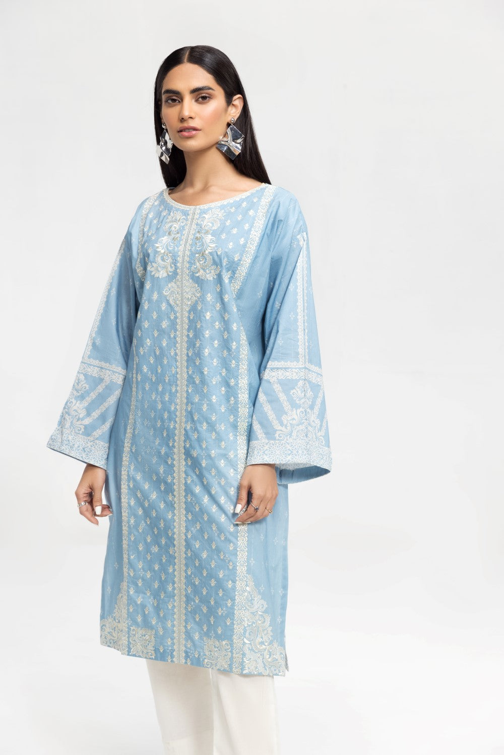 Stitched articles come with trousers tailored to match the unstitched trouser fabric provided. Please note that any appearance of shararas/ghararas in product images is for shoot purposes only unless otherwise specified in product details.