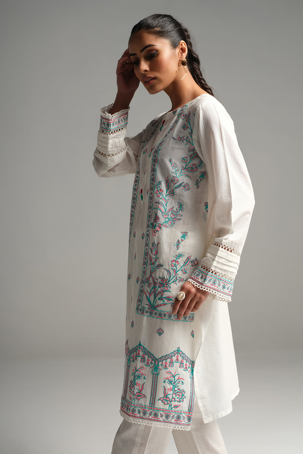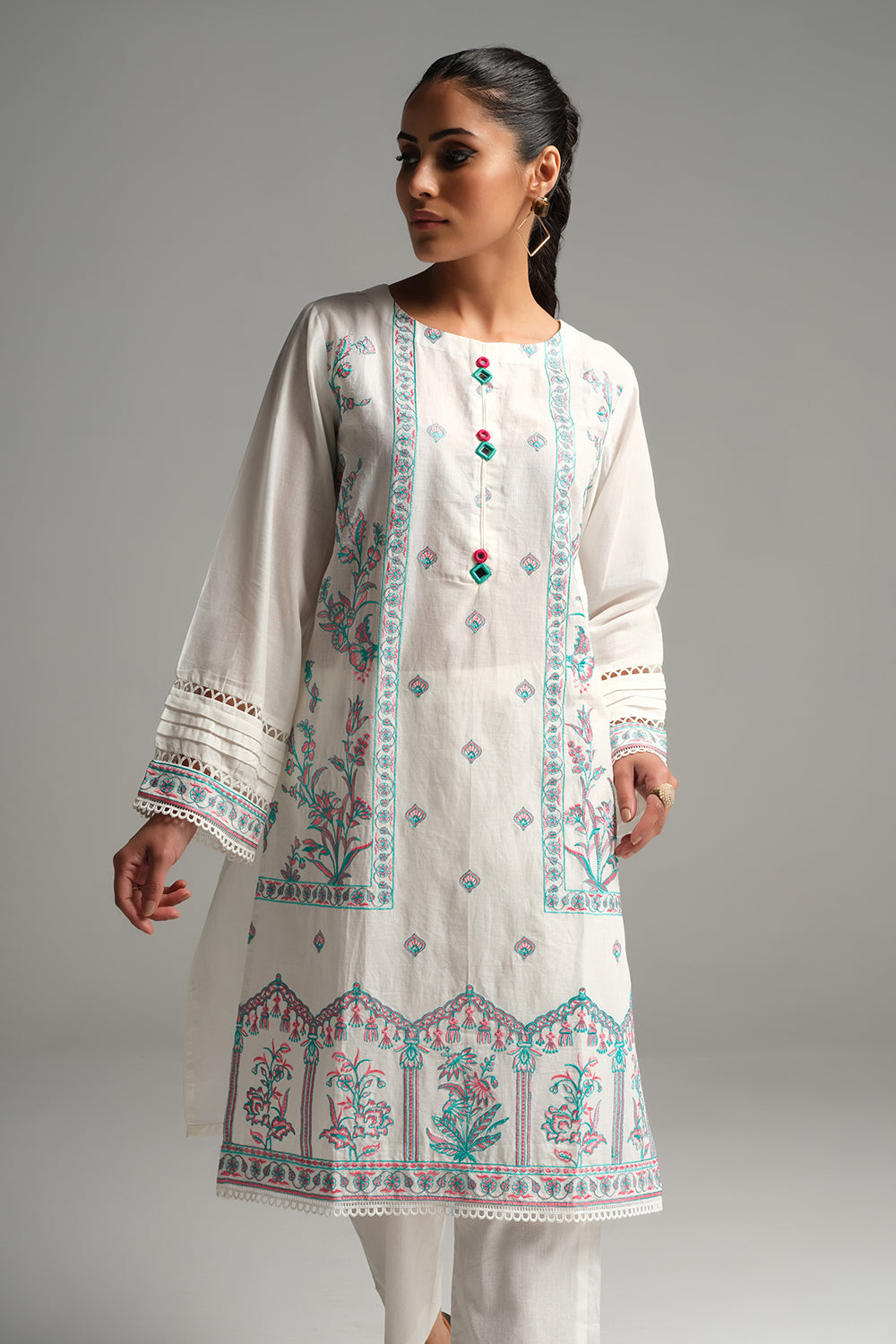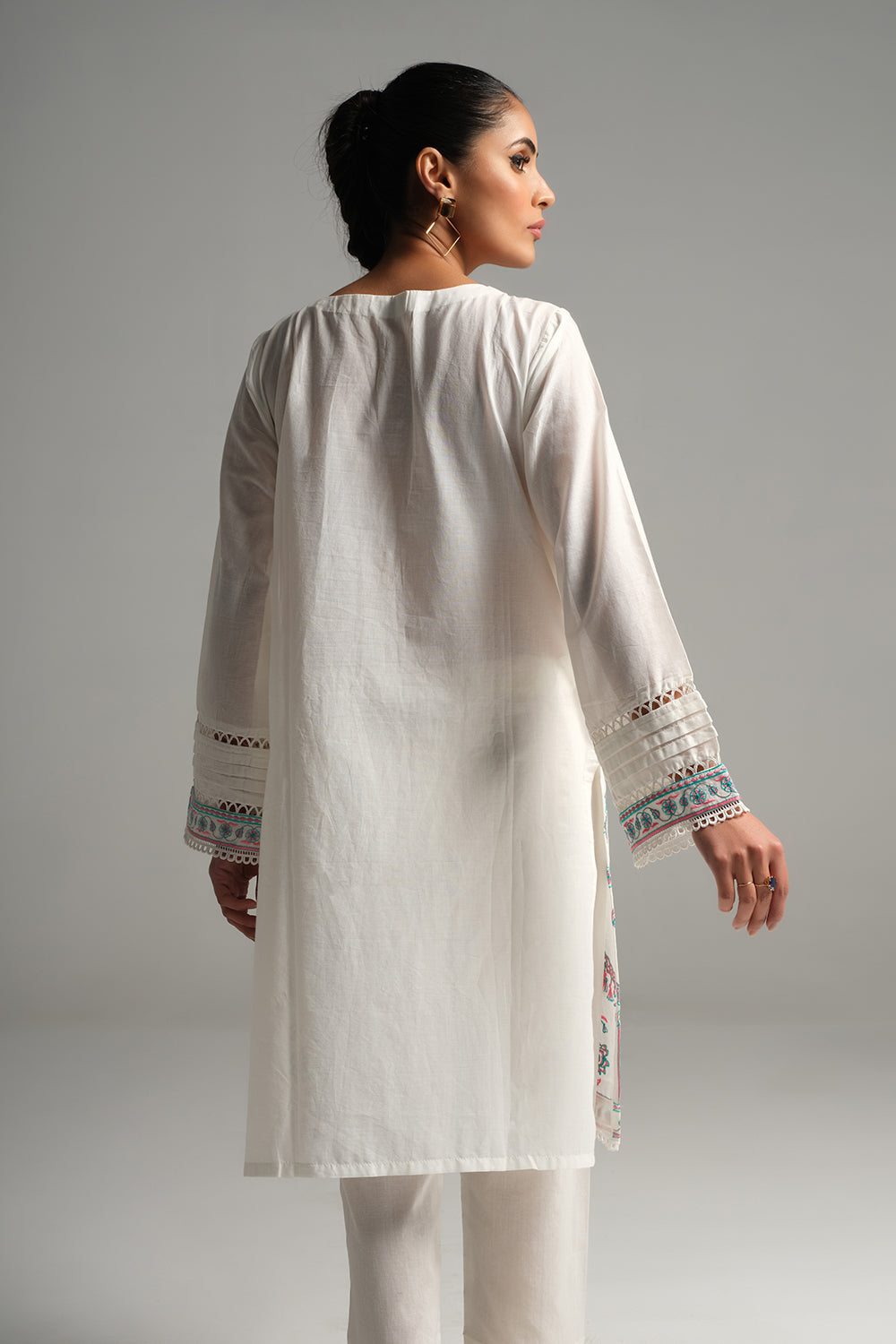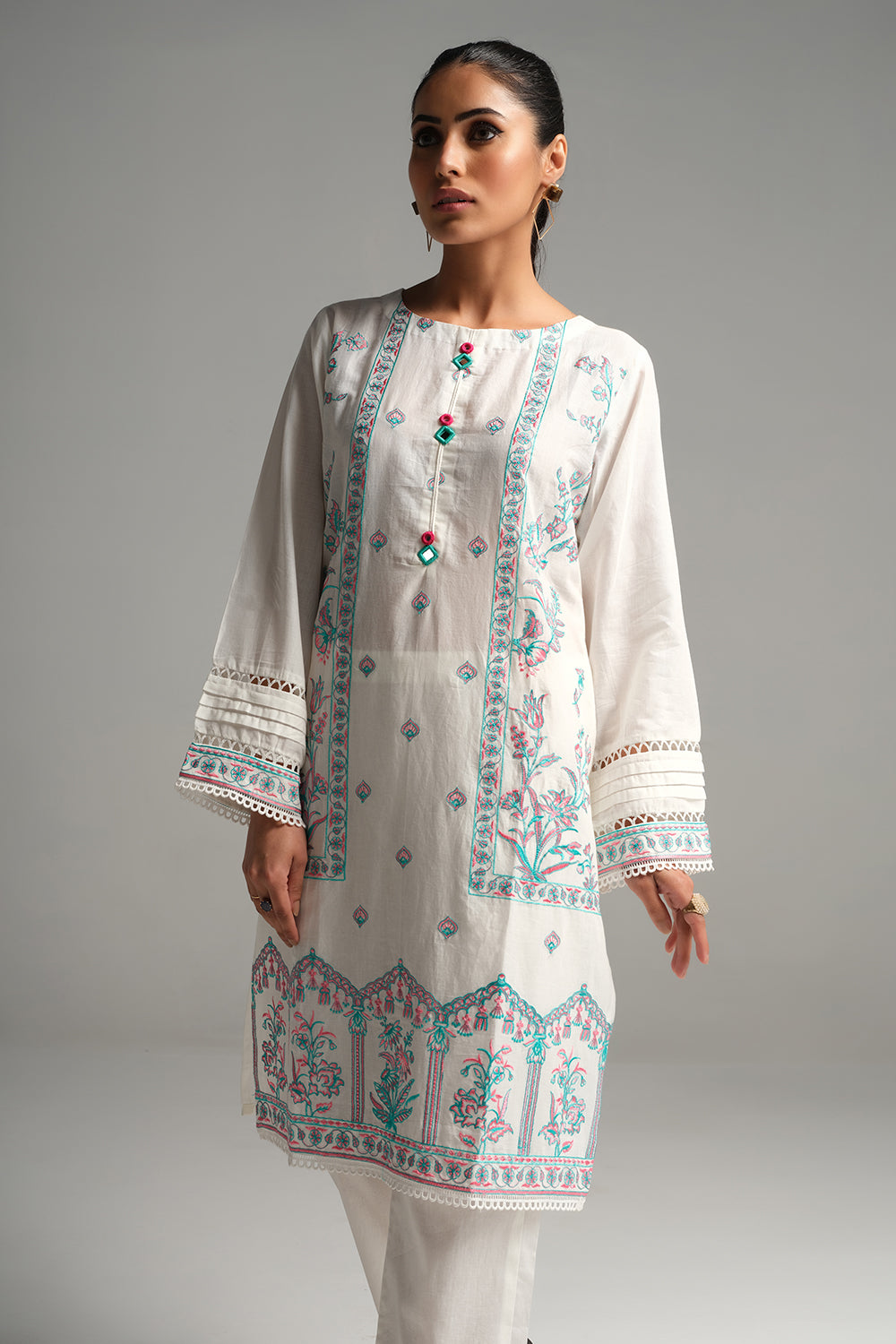 Stitched articles come with trousers tailored to match the unstitched trouser fabric provided. Please note that any appearance of shararas/ghararas in product images is for shoot purposes only unless otherwise specified in product details.