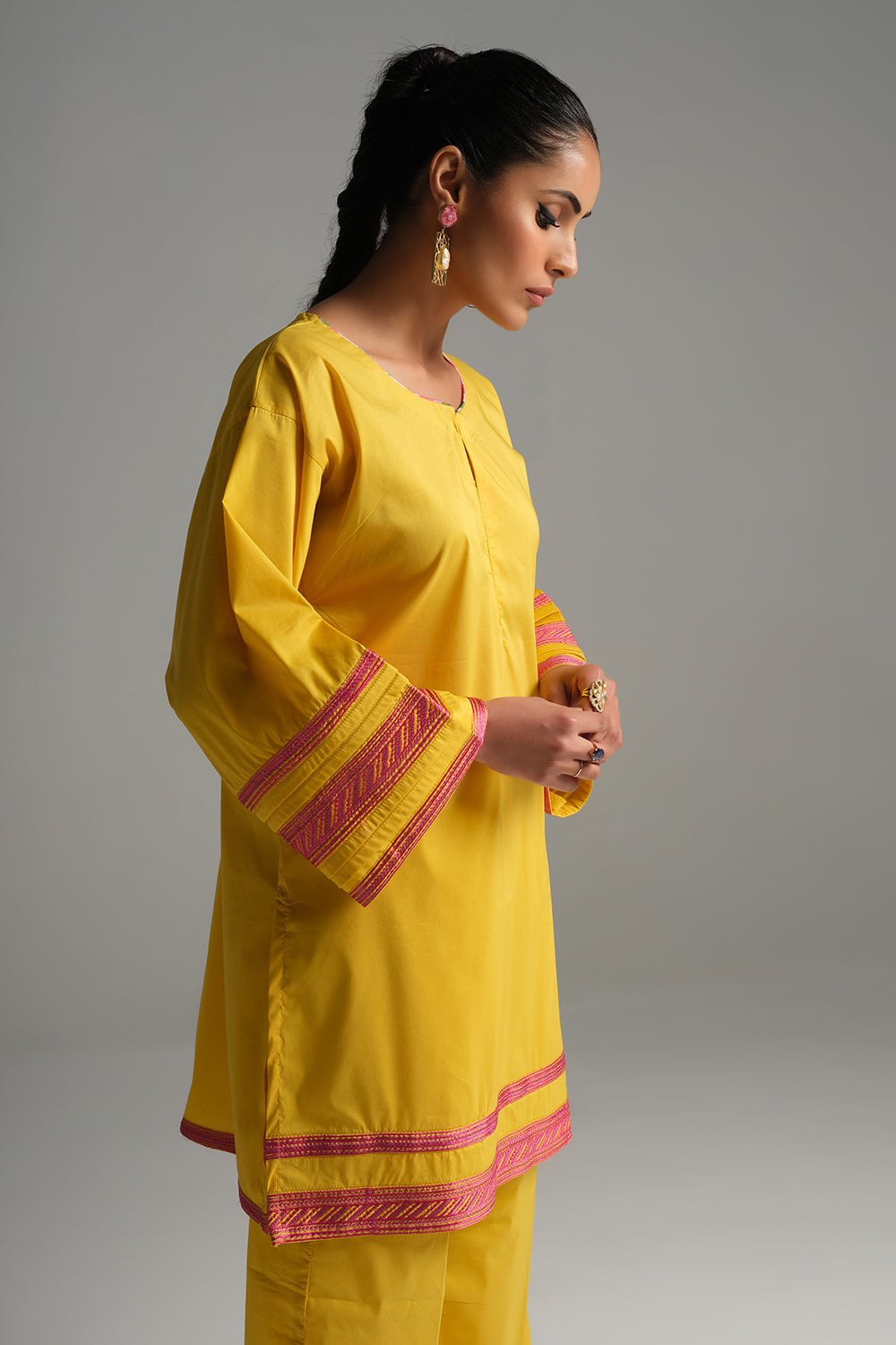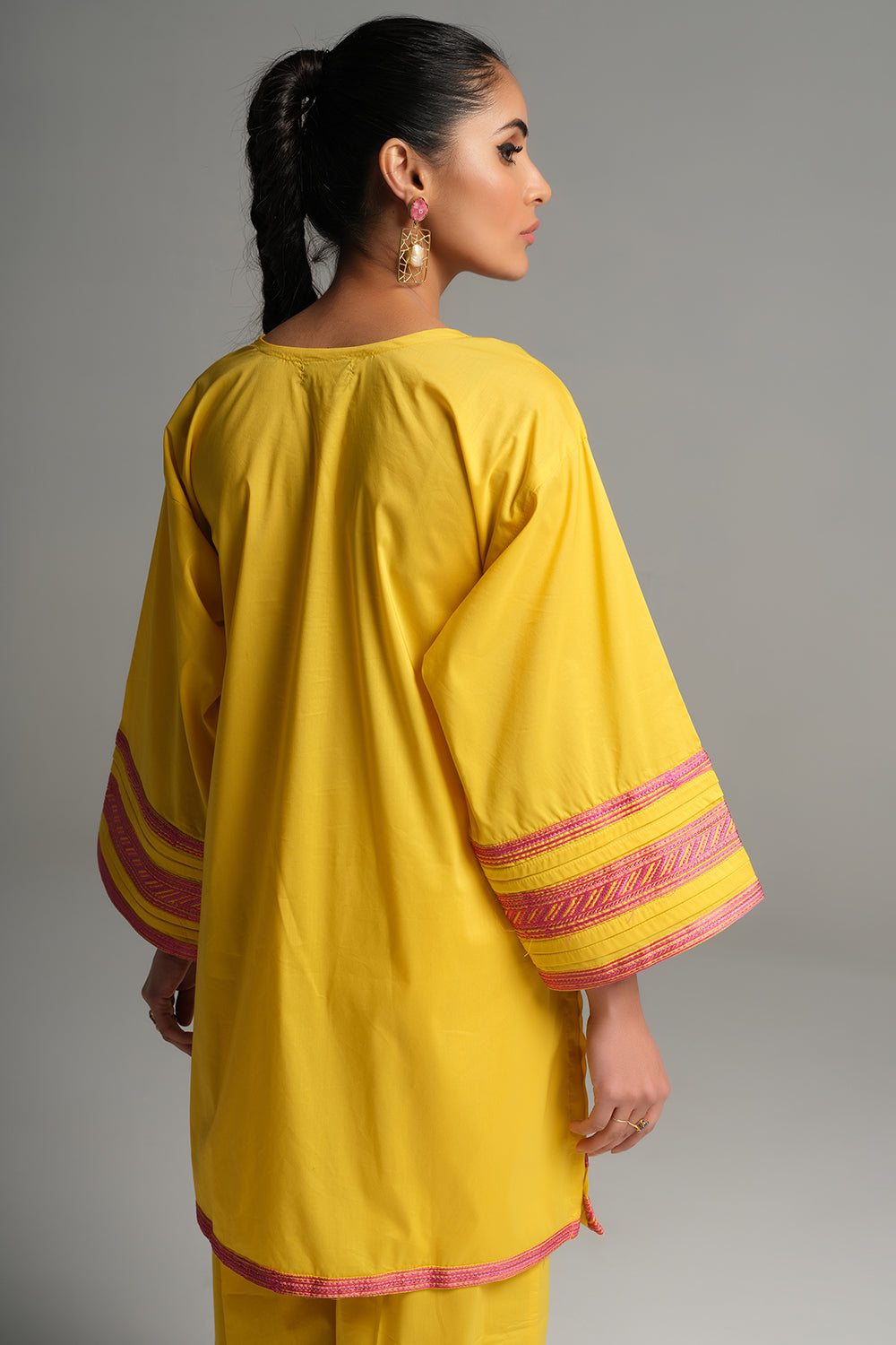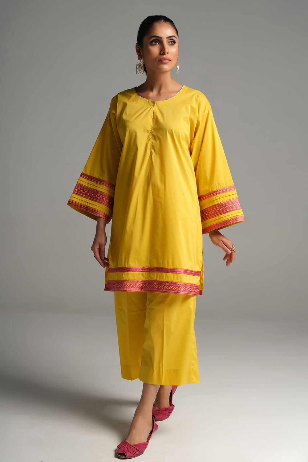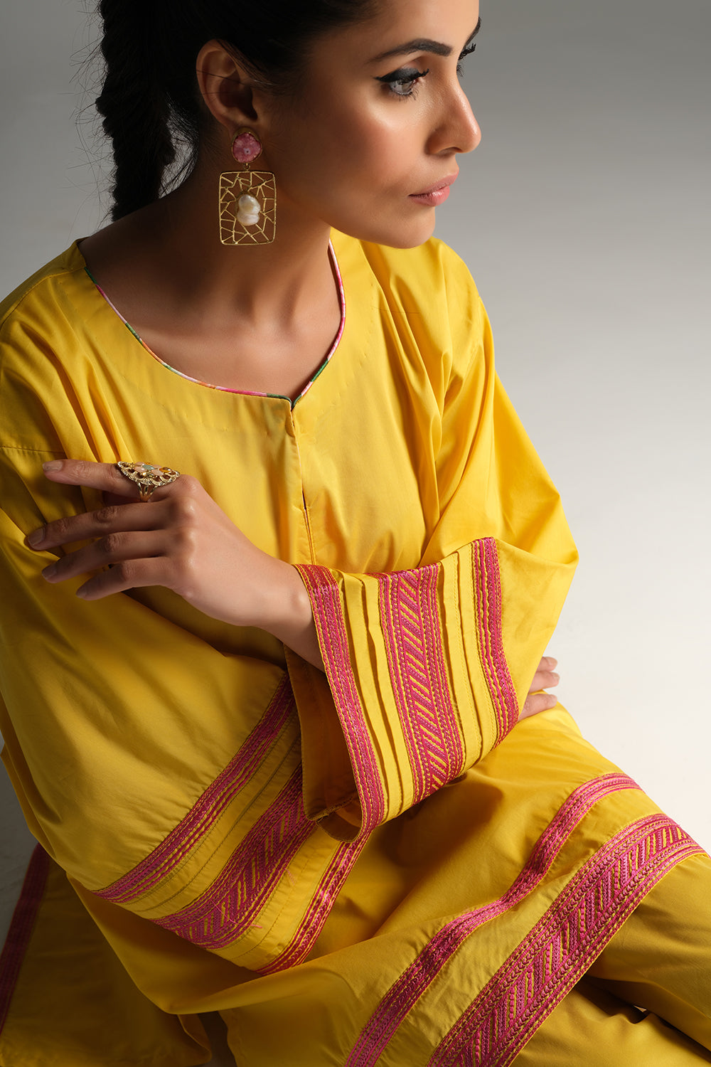 Stitched articles come with trousers tailored to match the unstitched trouser fabric provided. Please note that any appearance of shararas/ghararas in product images is for shoot purposes only unless otherwise specified in product details.