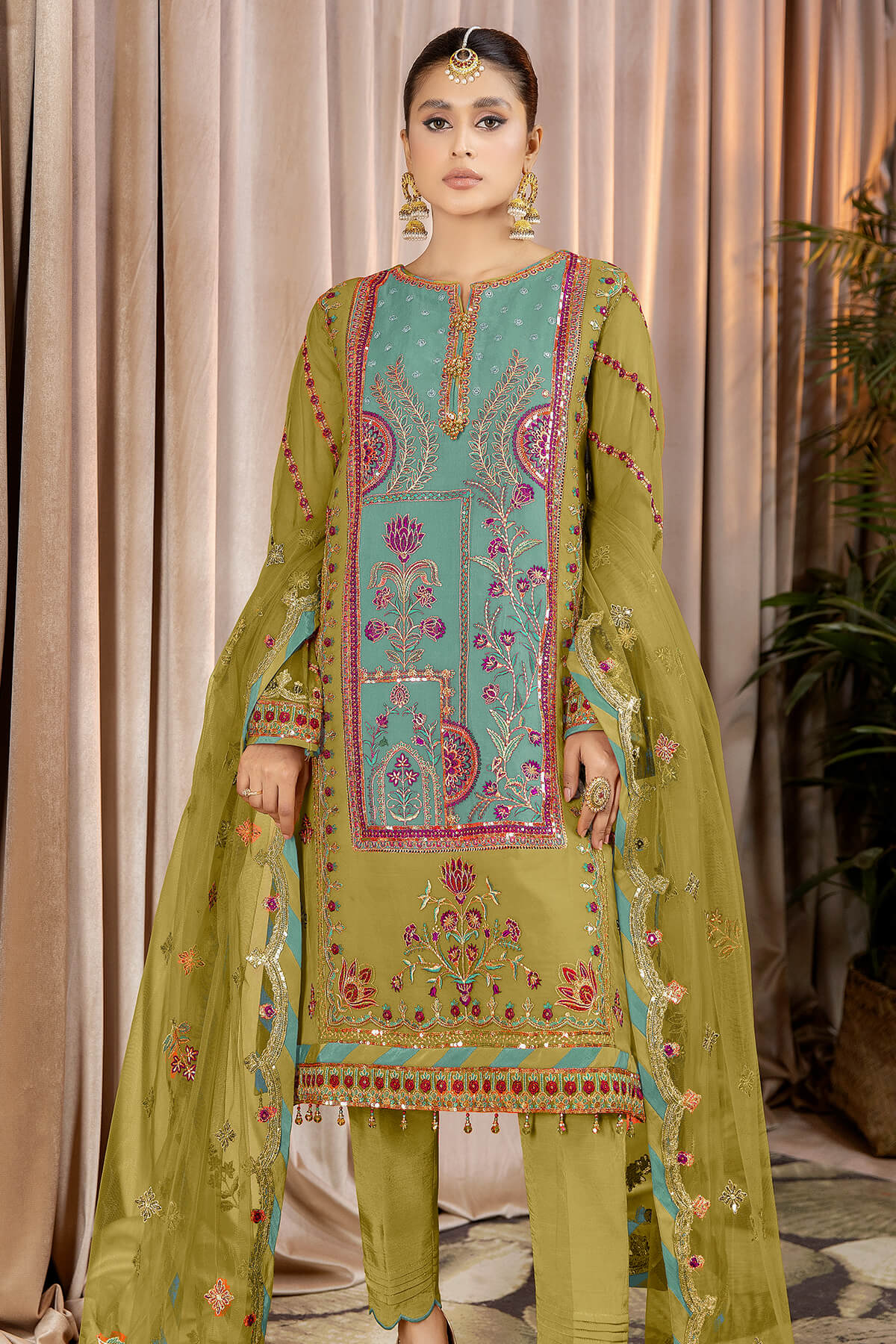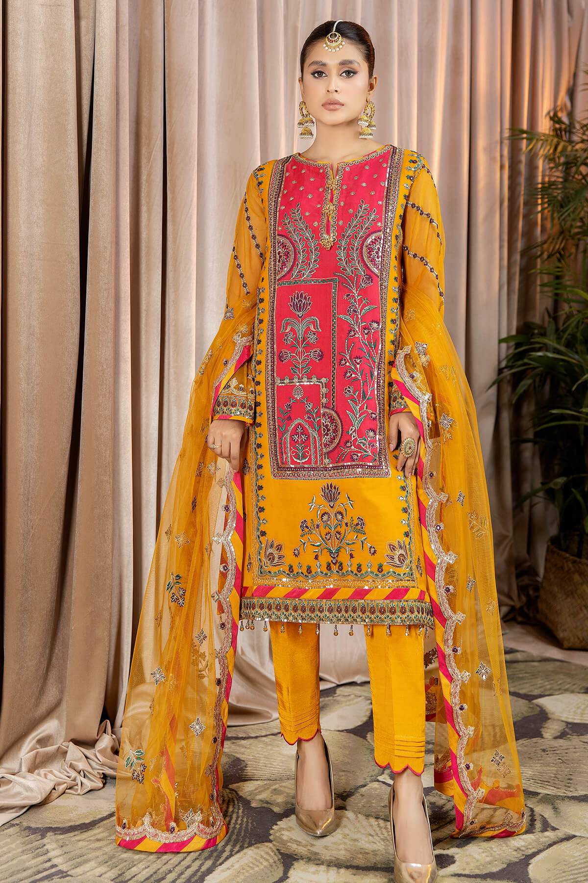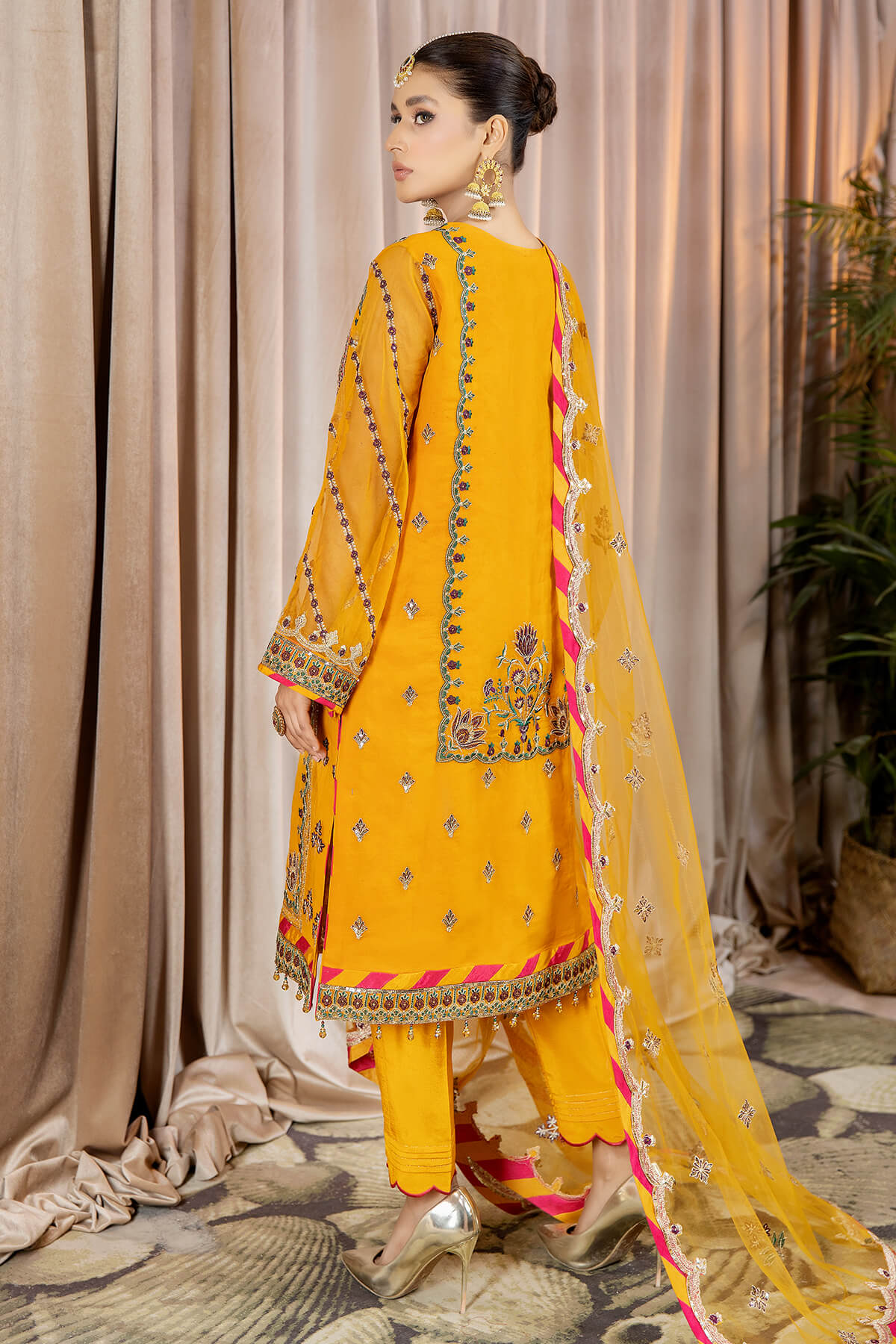 Stitched articles come with trousers tailored to match the unstitched trouser fabric provided. Please note that any appearance of shararas/ghararas in product images is for shoot purposes only unless otherwise specified in product details.