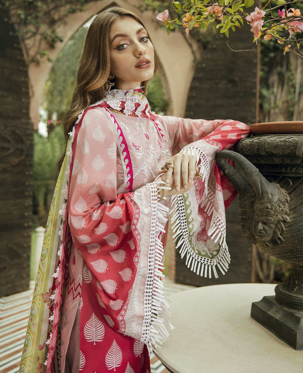 Stitched articles come with trousers tailored to match the unstitched trouser fabric provided. Please note that any appearance of shararas/ghararas in product images is for shoot purposes only unless otherwise specified in product details.