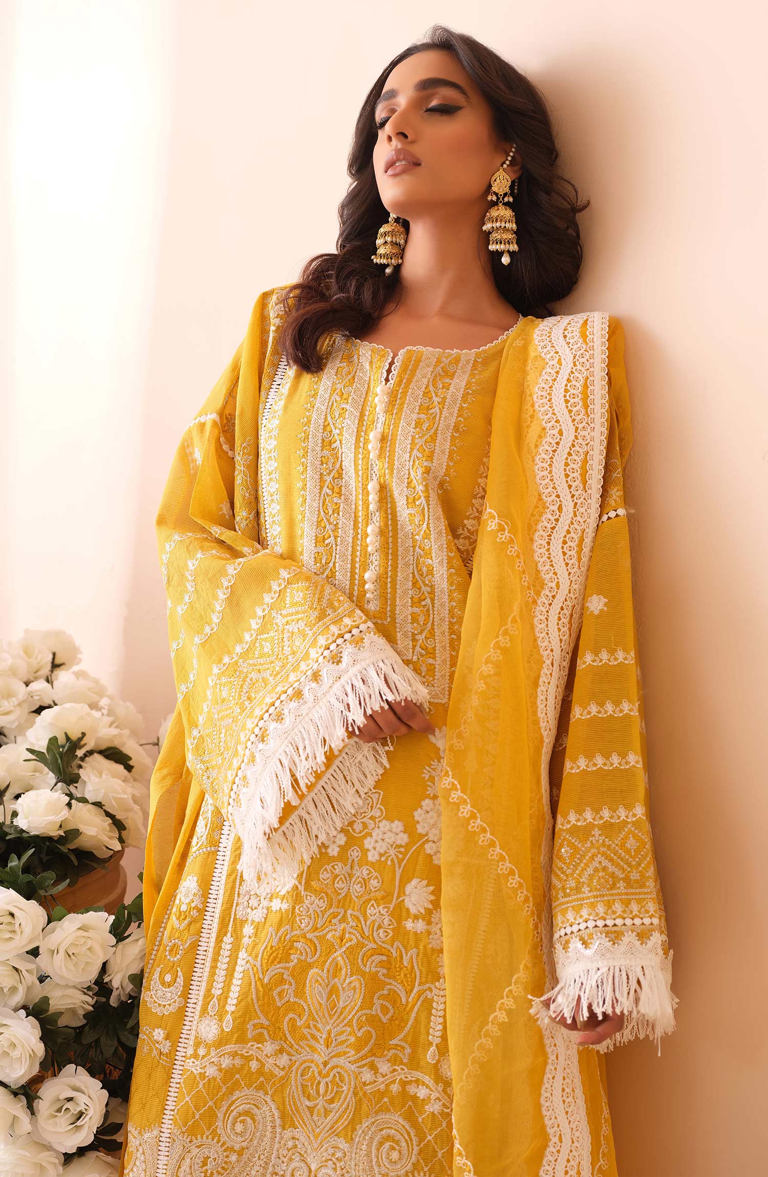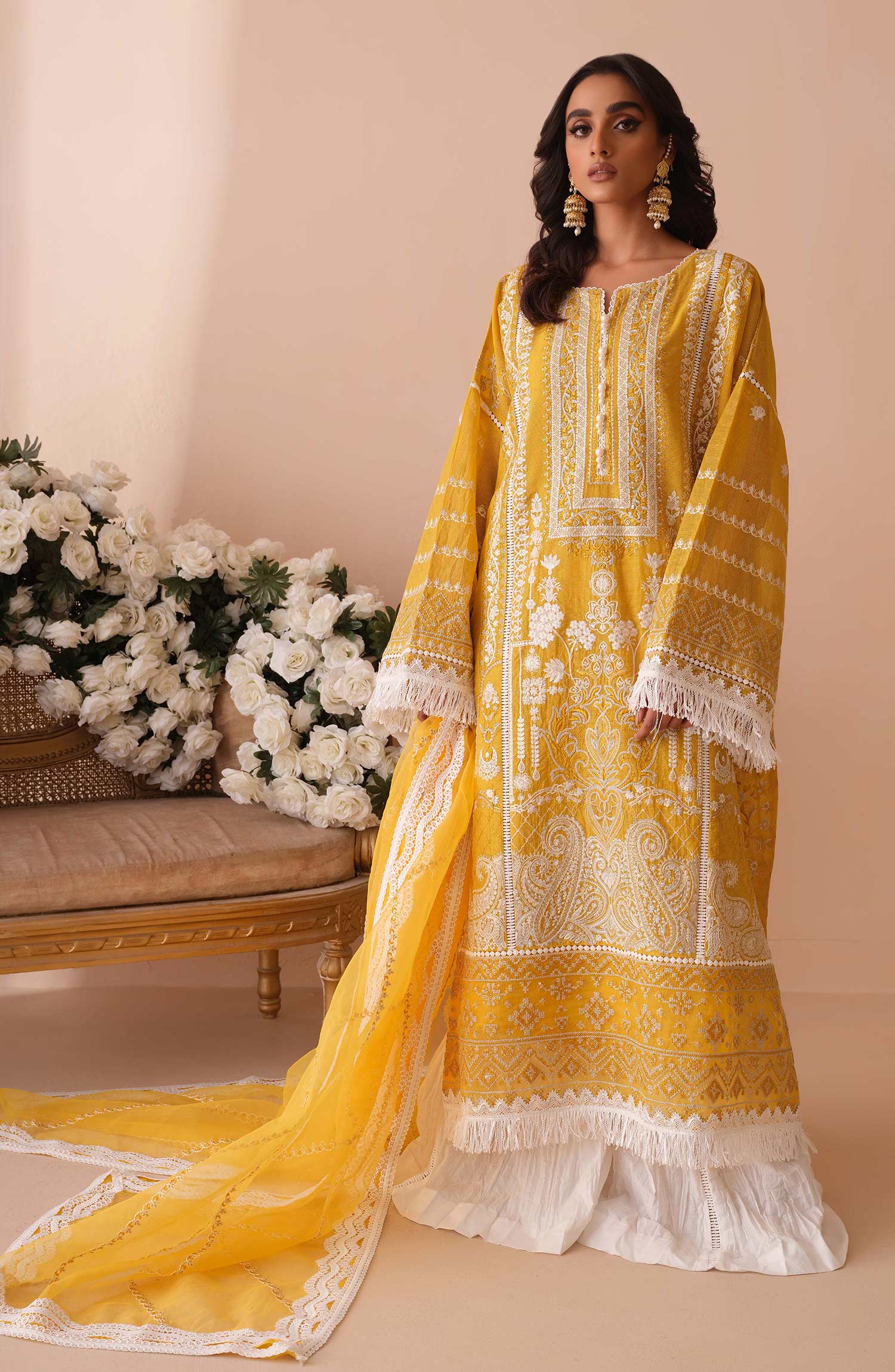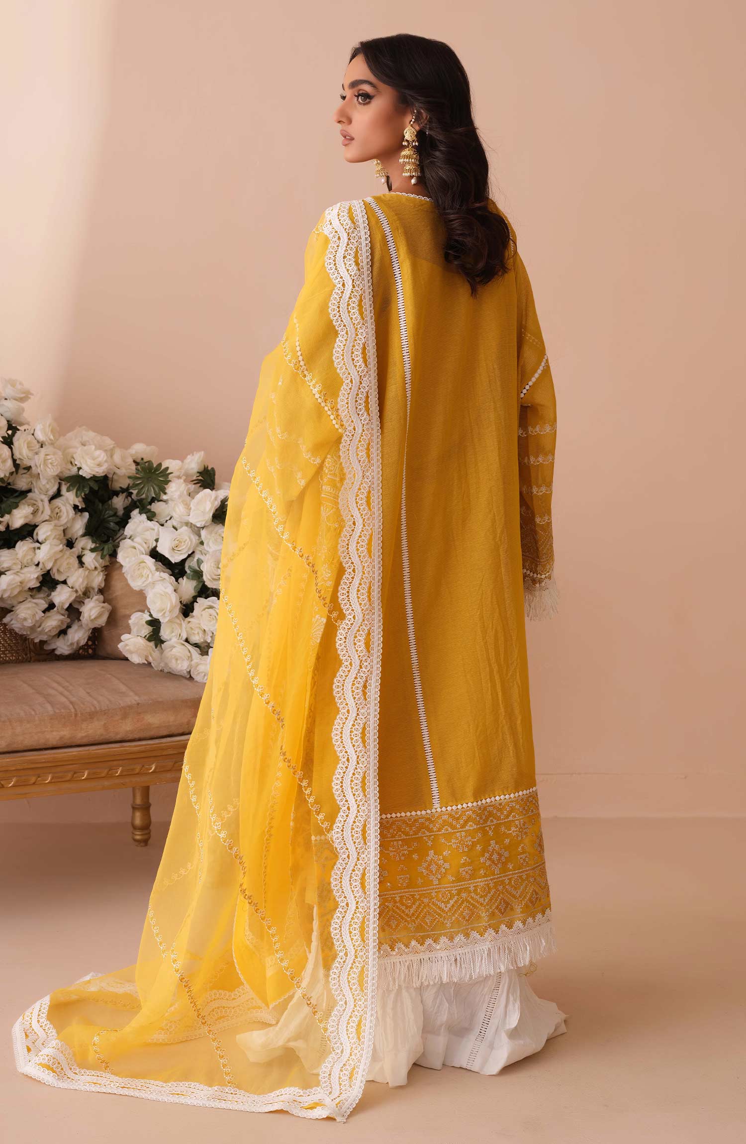 Stitched articles come with trousers tailored to match the unstitched trouser fabric provided. Please note that any appearance of shararas/ghararas in product images is for shoot purposes only unless otherwise specified in product details.