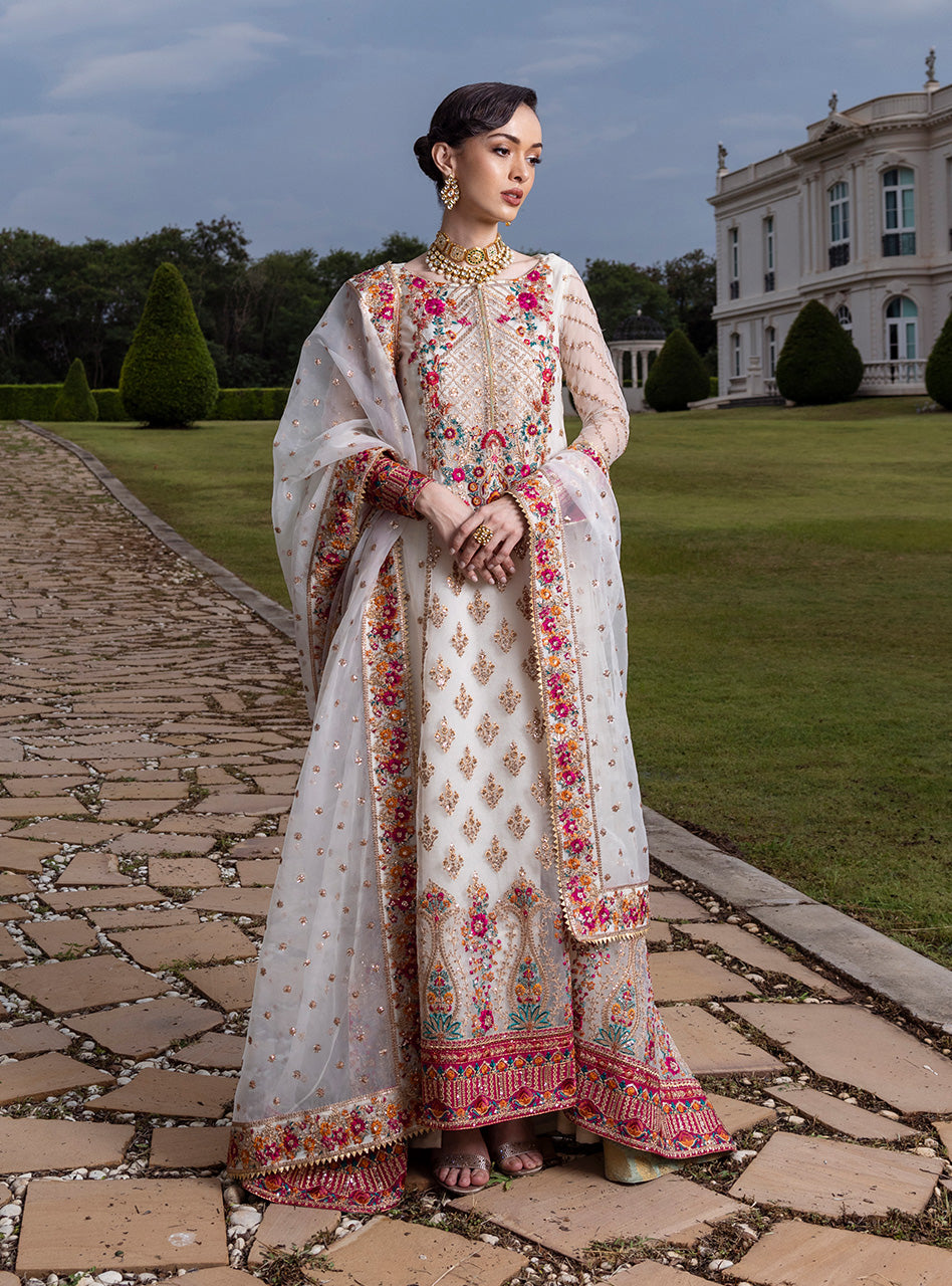 This intricately hand-crafted ensemble is made from pure off-white organza and features thread work in shades of pink, orange, and green on the bodice and borders. Traditional sequin work, combined with intricate machine embroidery, brings the outfit to life. The gorgeous panel, layered over a subtly shimmering fabric, boasts an incredible flair and a flattering silhouette. A cascading pure organza dupatta, embellished with shimmering threadwork, sequins, and an embroidered border, makes this the ideal choice for intimate occasions.