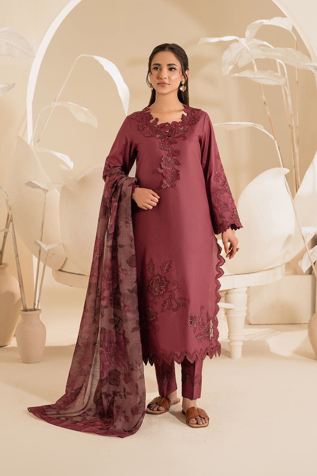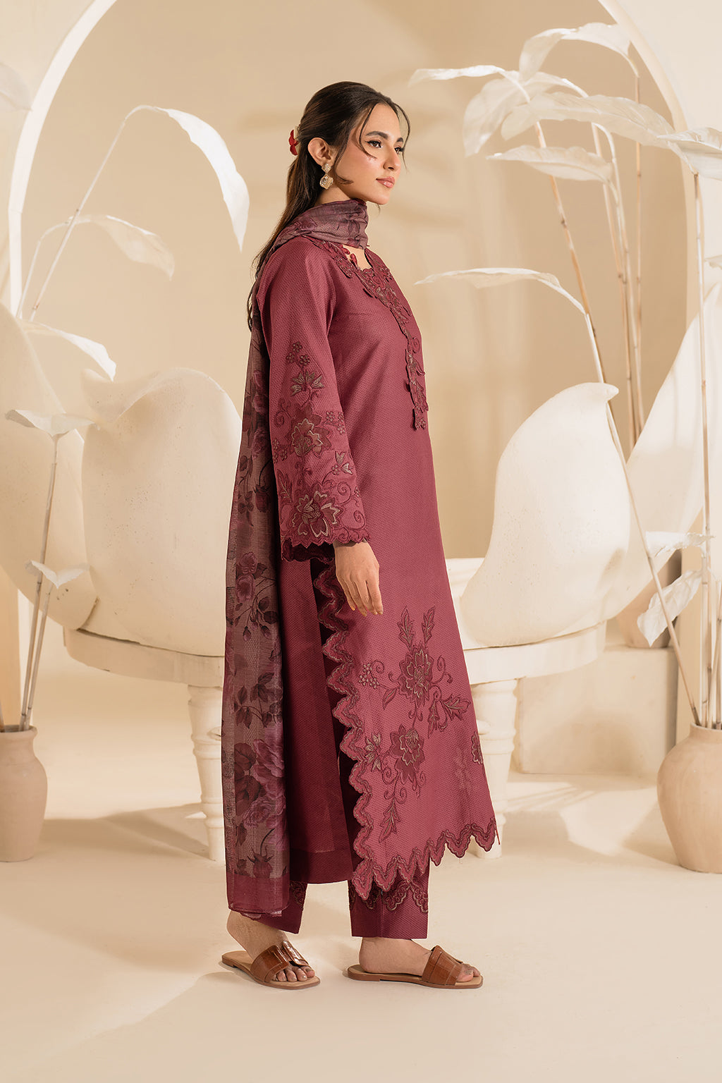 Stitched articles come with trousers tailored to match the unstitched trouser fabric provided. Please note that any appearance of shararas/ghararas in product images is for shoot purposes only unless otherwise specified in product details.