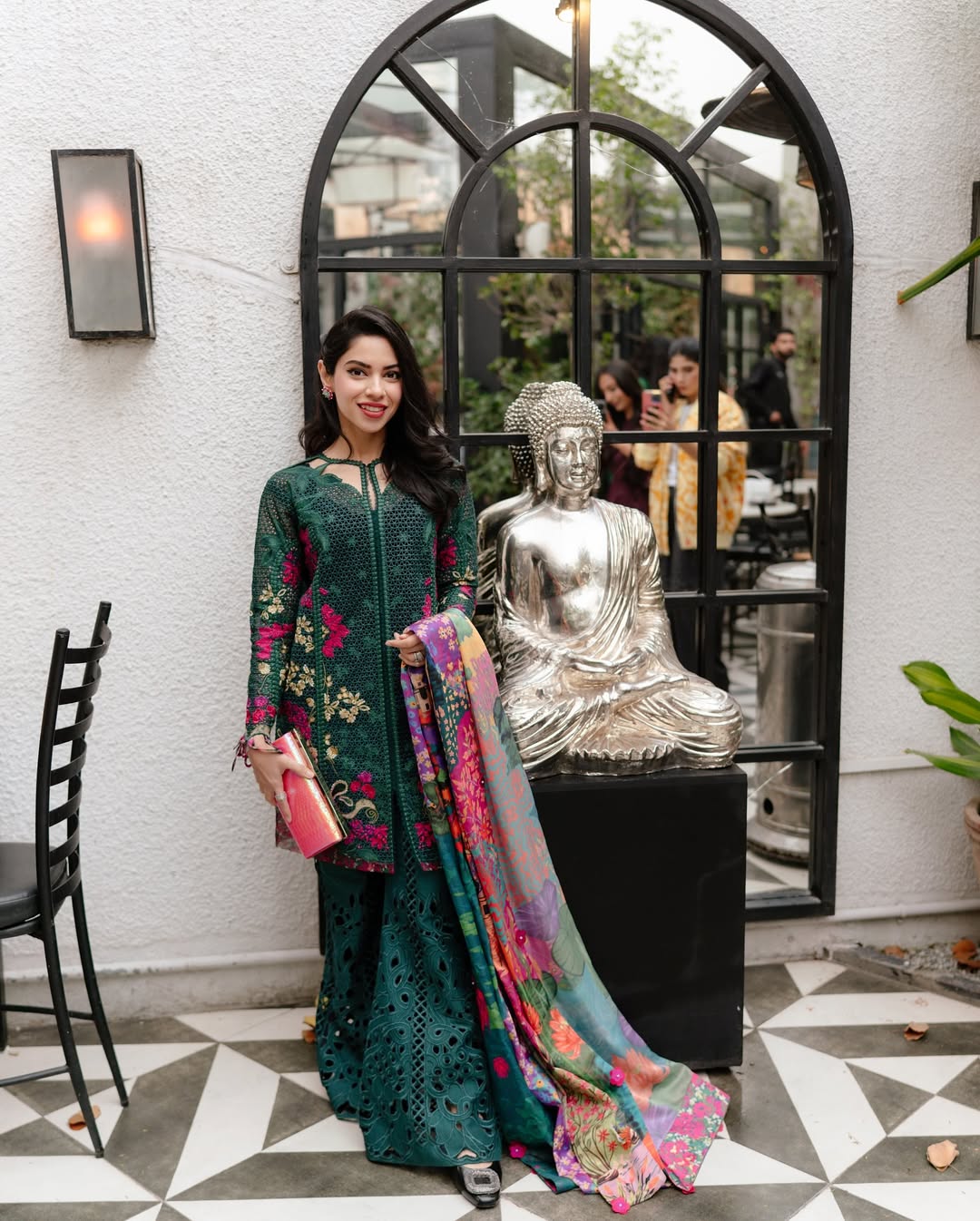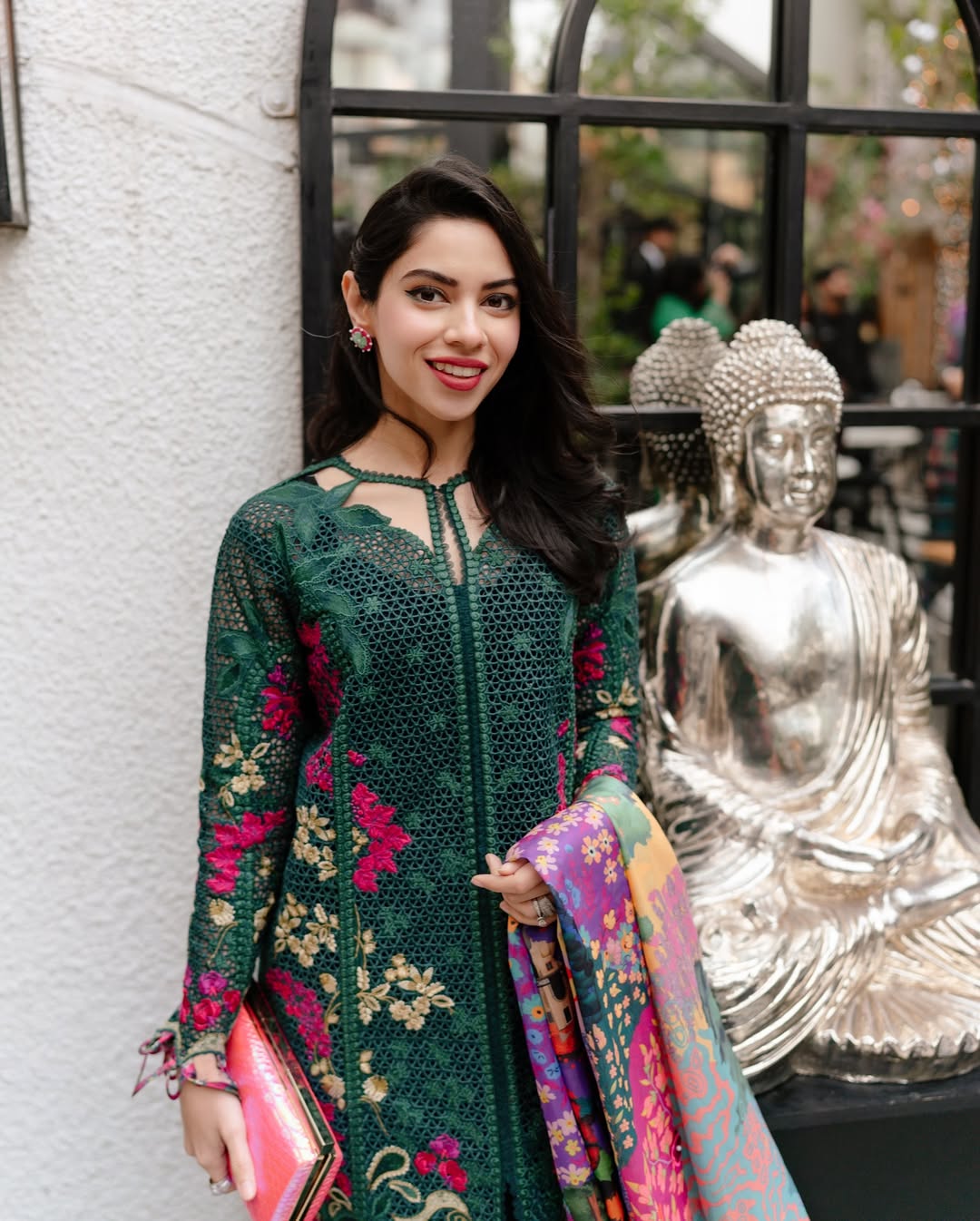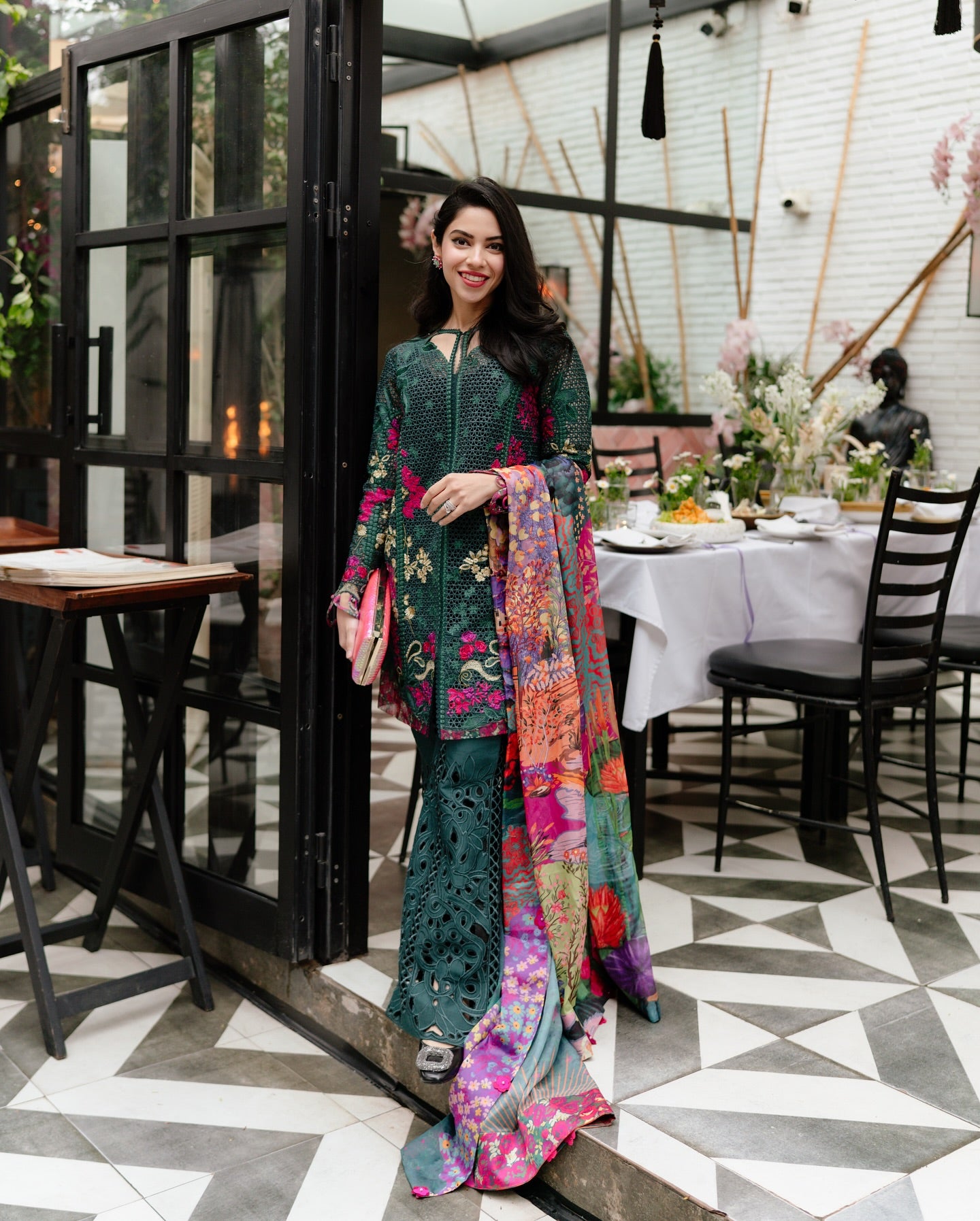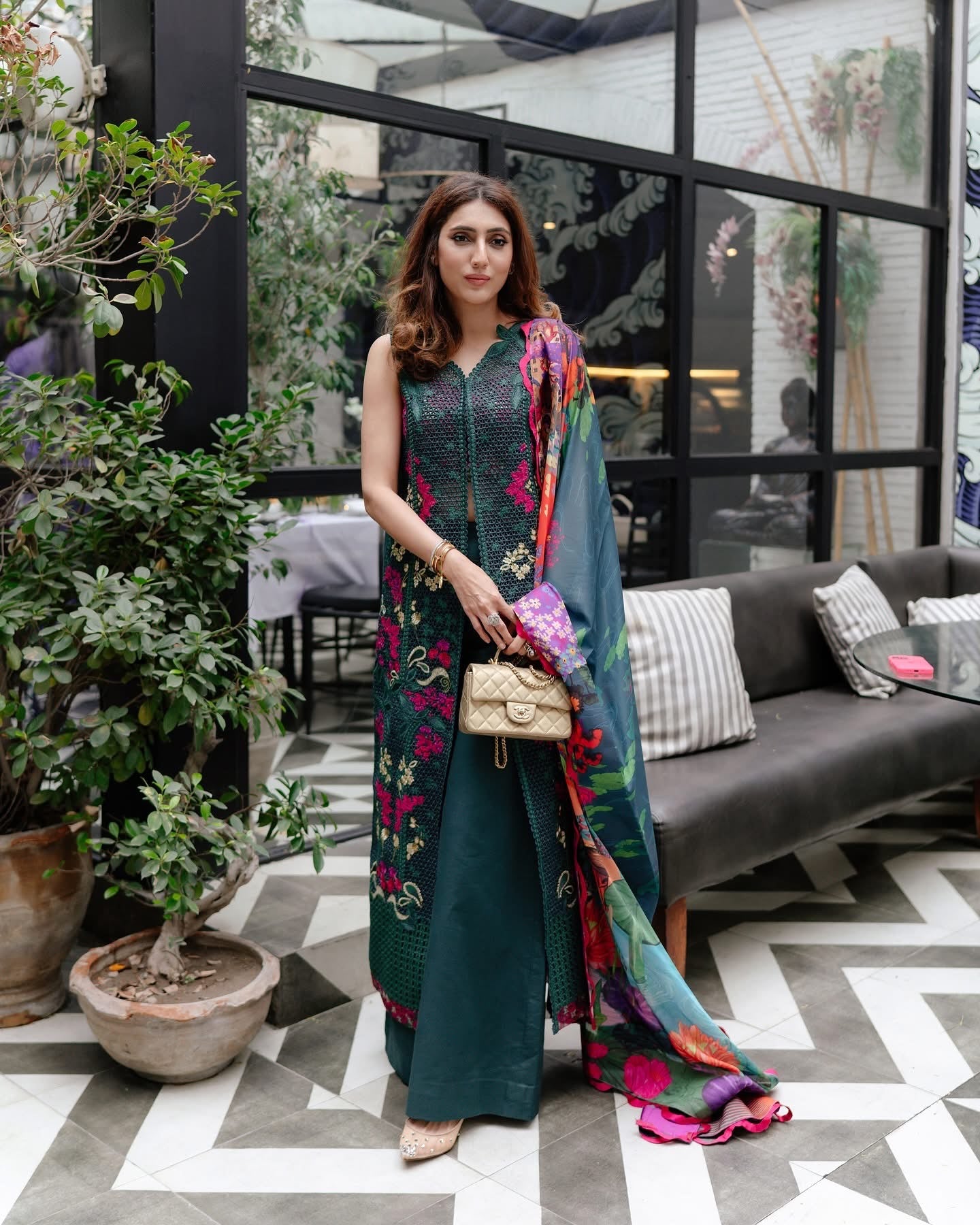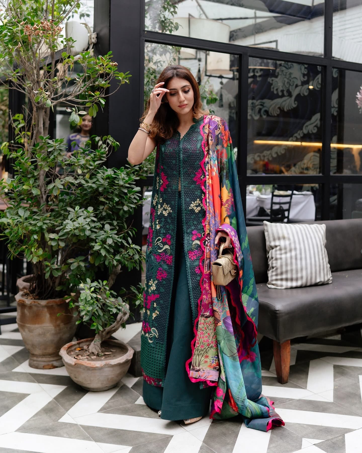 A symphony of intricate embroideries and luxurious textures. This ensemble is crafted in rich lush green hues that evoke pure elegance. The fabric a delicate blend of lawn and organza is adorned with masterfully detailed embellishments that exude opulence. Paired with a flowy, printed silk dupatta that drapes with graceful fluidity, the look is completed by chic lawnkari culottes that offer both comfort and refinement. This ensemble is the epitome of effortless sophistication, where timeless craftsmanship meets playful charm, creating a harmonious balance of luxury and contemporary allure.