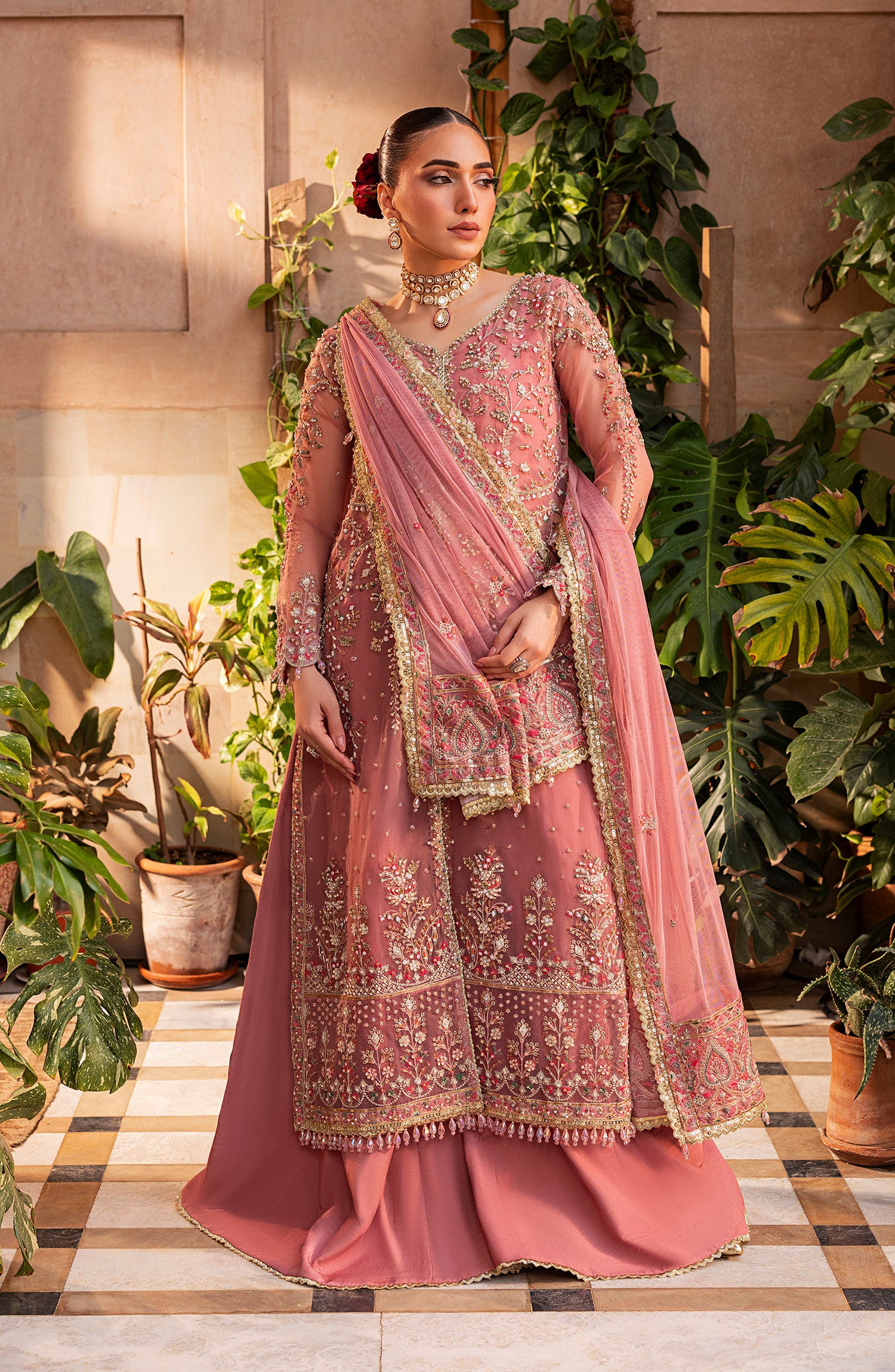 Stitched articles come with trousers tailored to match the unstitched trouser fabric provided. Please note that any appearance of shararas/ghararas in product images is for shoot purposes only unless otherwise specified in product details.