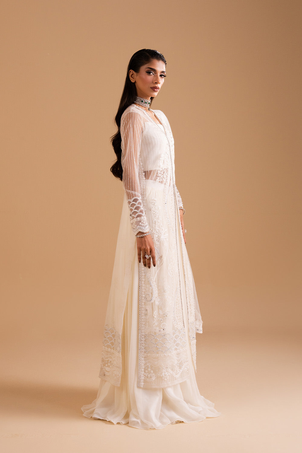 Stitched articles come with trousers tailored to match the unstitched trouser fabric provided. Please note that any appearance of shararas/ghararas in product images is for shoot purposes only unless otherwise specified in product details.