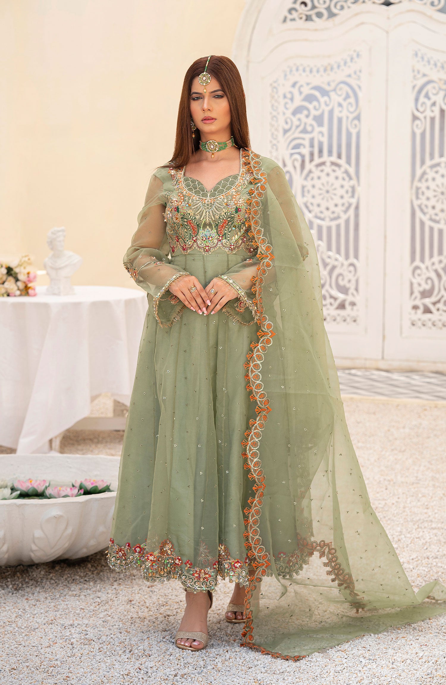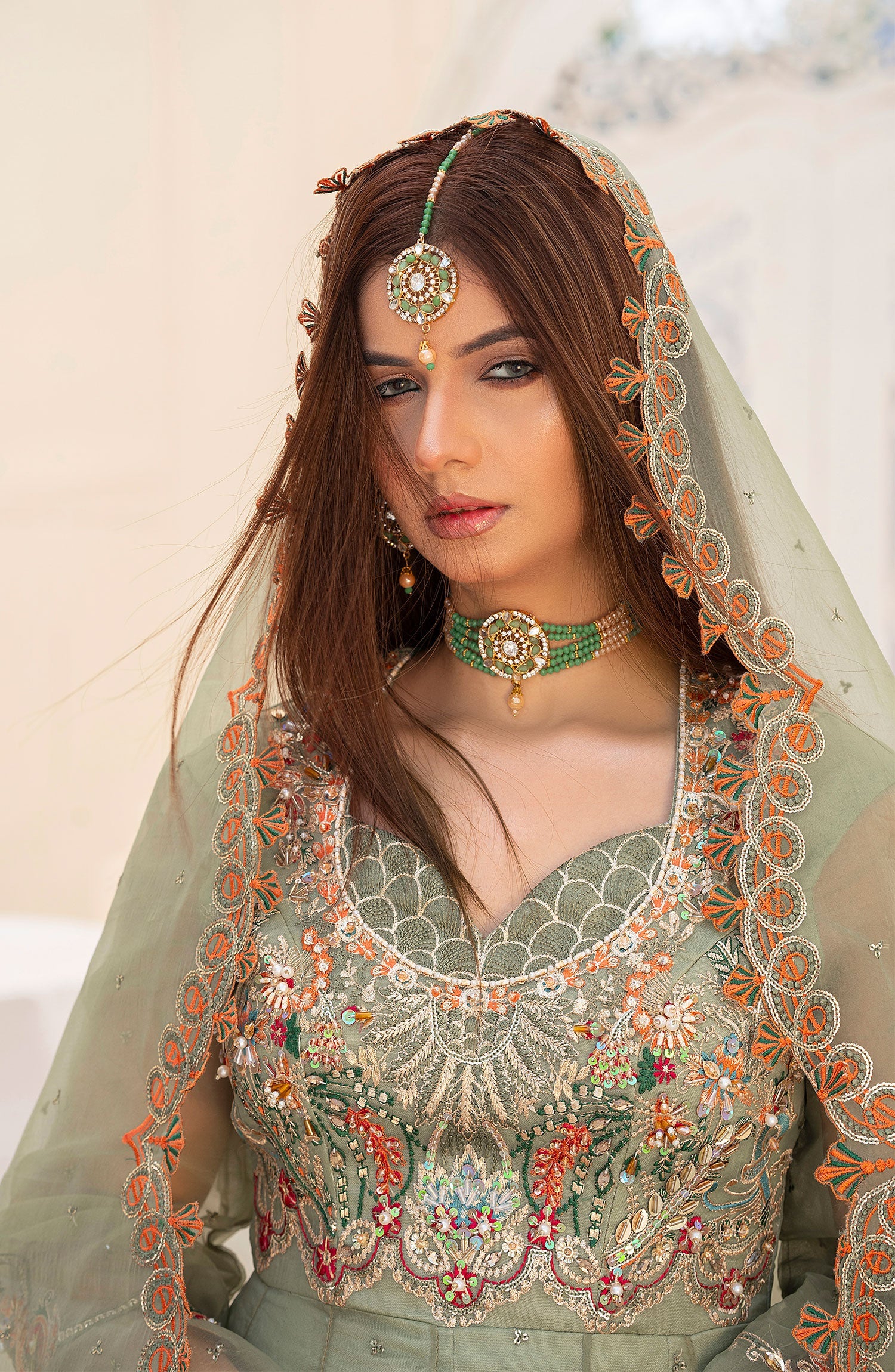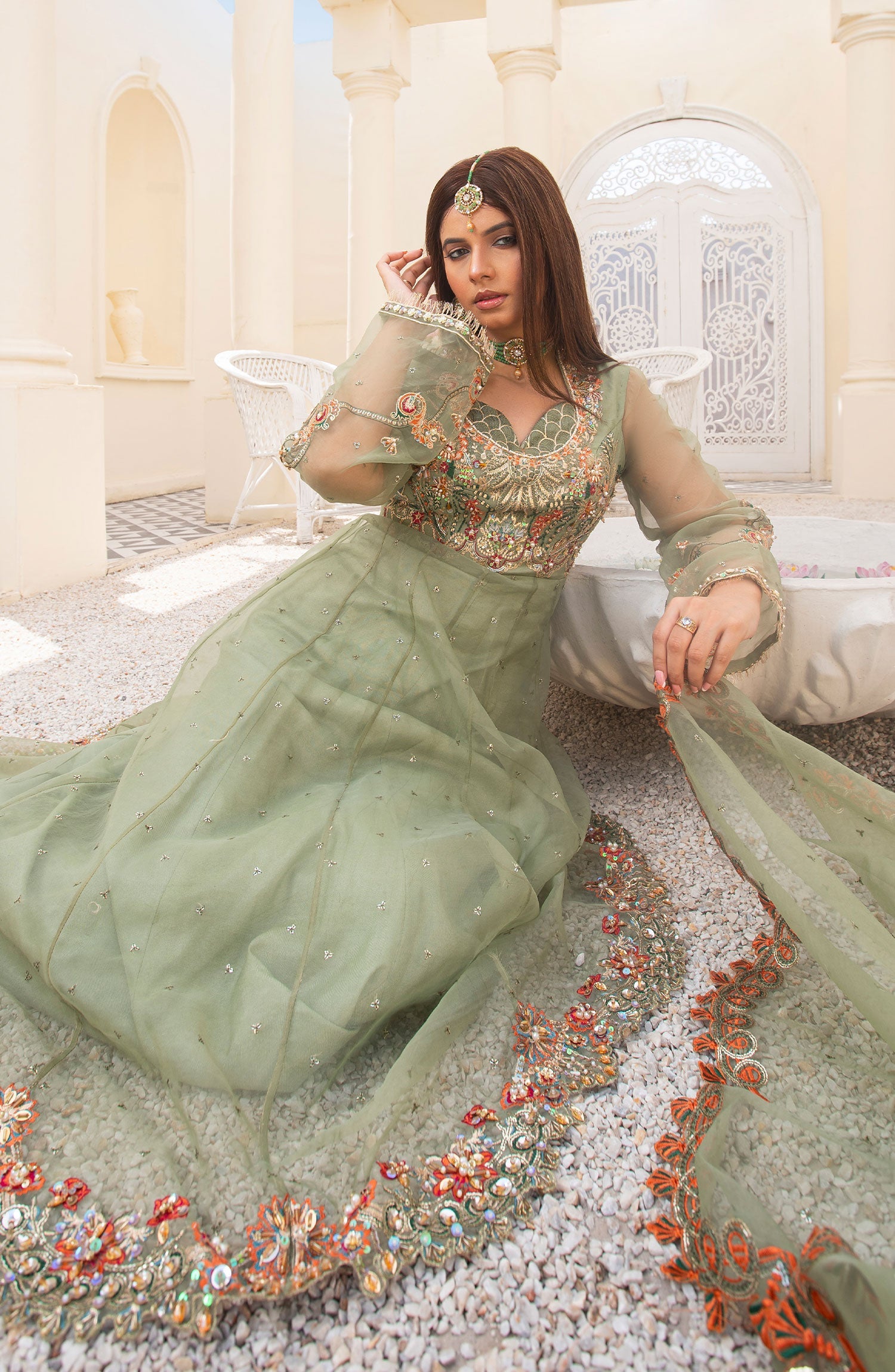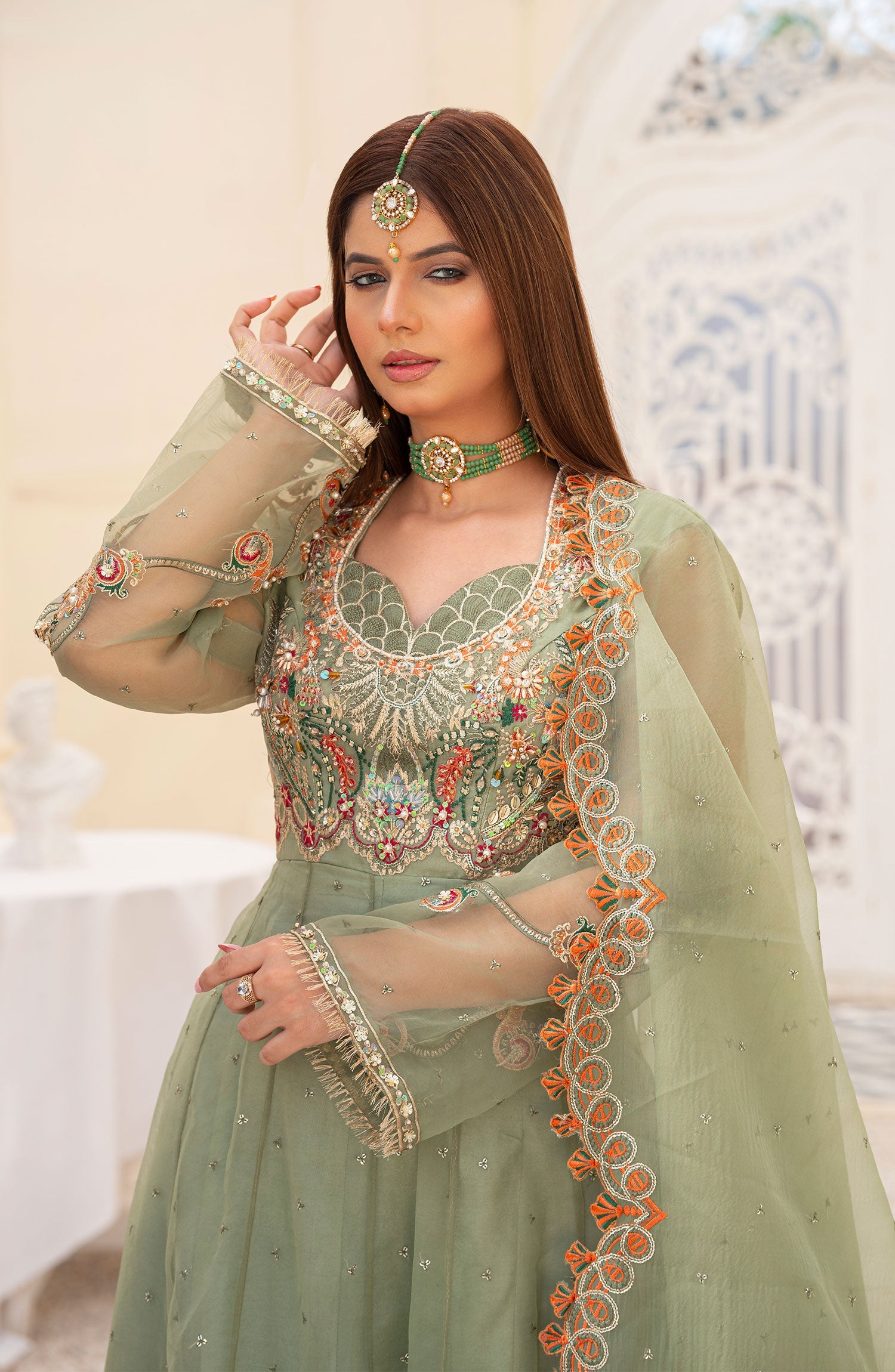 A Green hued floor length dress with azzars. The shirt is elegantly based on organza with intricate hand embellishments coupled with jewelry inspired neckline and a beautiful tassel at the back of the shirt. The dress depicts flora in full bloom with delicate embroidery all over the body and sleeves, accompanied with a gorgeous multi color embroidery border at the bottom of the dress and sleeves. Paired with a dupatta with embroidery and lace finishing. This dress is perfectly suited for any and all formal occasions , these timeless looks will make you shine!