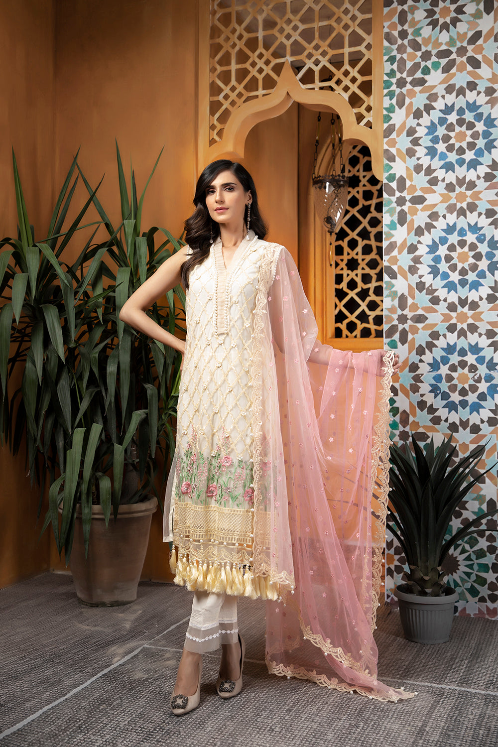 Stitched articles come with trousers tailored to match the unstitched trouser fabric provided. Please note that any appearance of shararas/ghararas in product images is for shoot purposes only unless otherwise specified in product details.